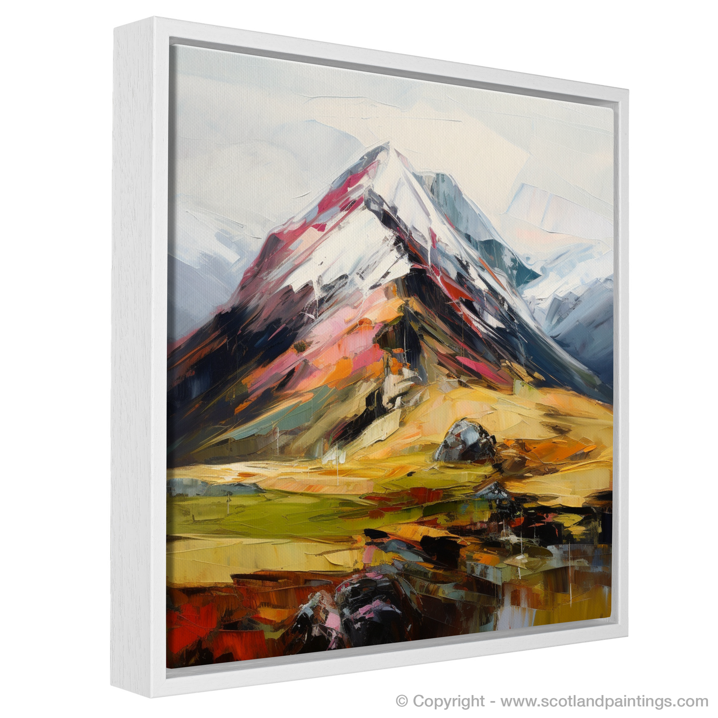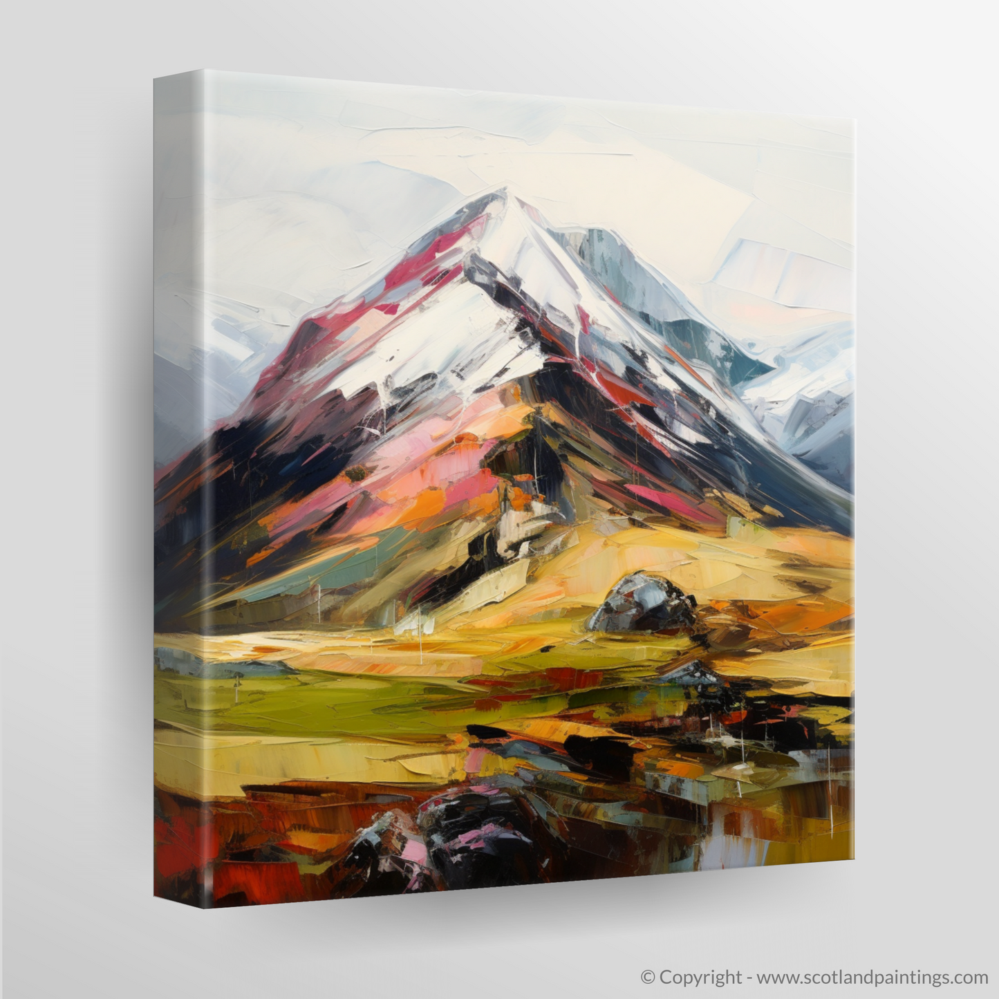 Broad, gestural strokes of white and grey coalesce to form the majestic, snow-kissed summit, setting a stark contrast to the warmer hues that ignite the lower slopes and valleys. Rich ochres, fiery oranges, and deep reds, applied with palpable energy, imbue the scene with the raw, untamed essence of the highlands. The bold palette suggests the changing seasons, the fleeting light of dusk, or perhaps the vibrant colours of the Scottish landscape as perceived through the artist's emotional lens.