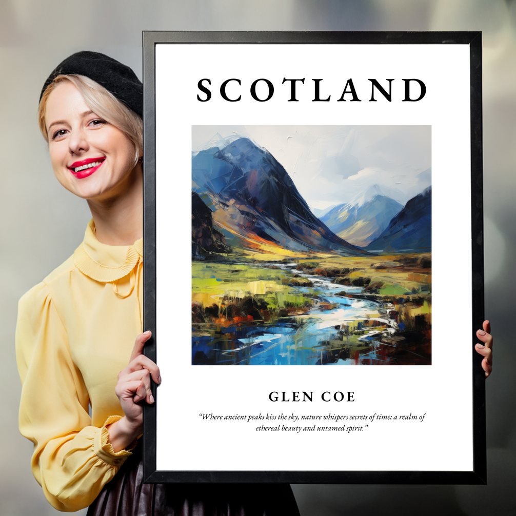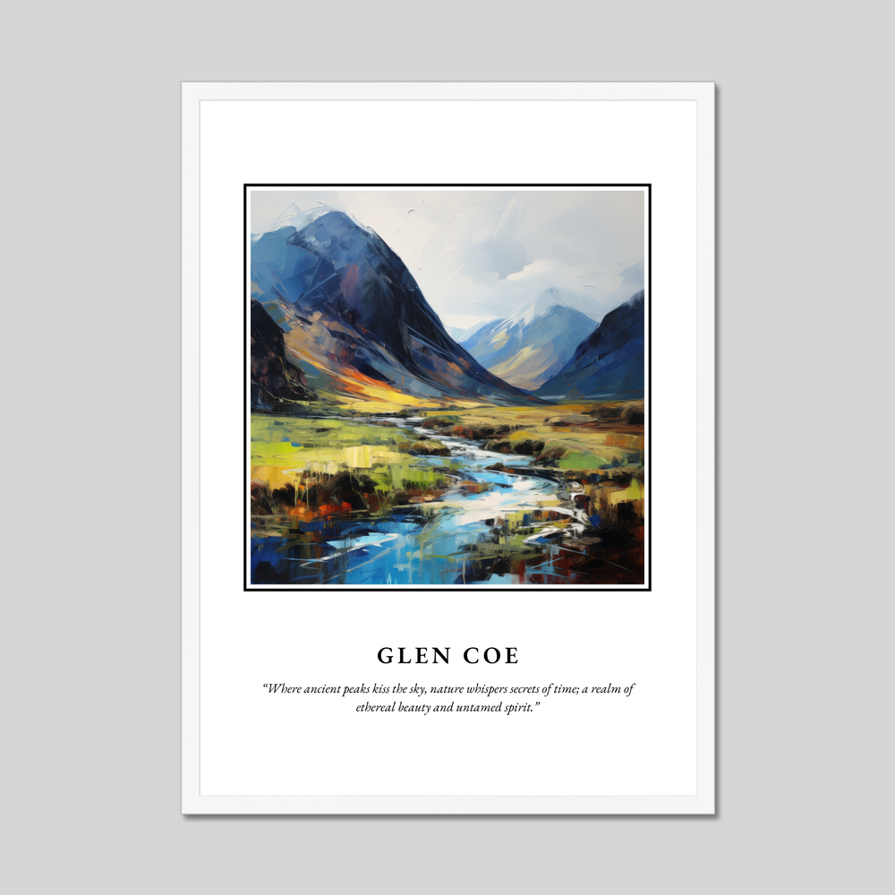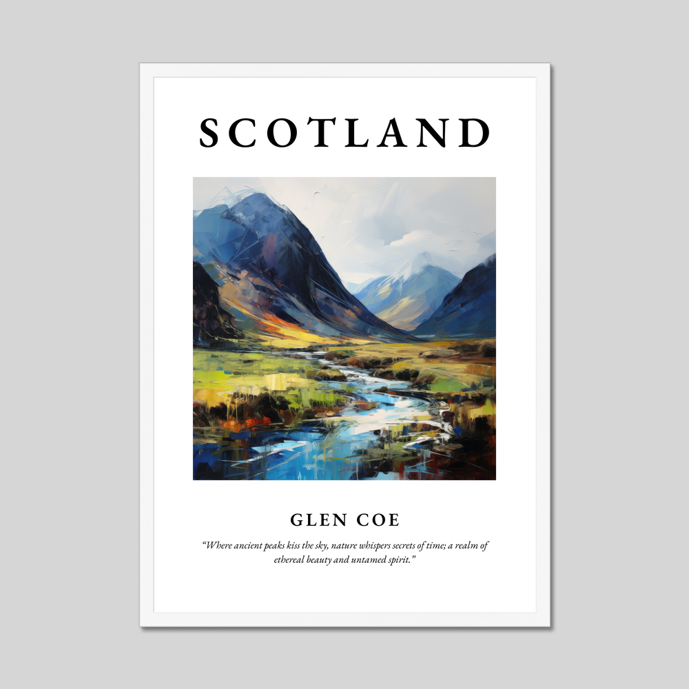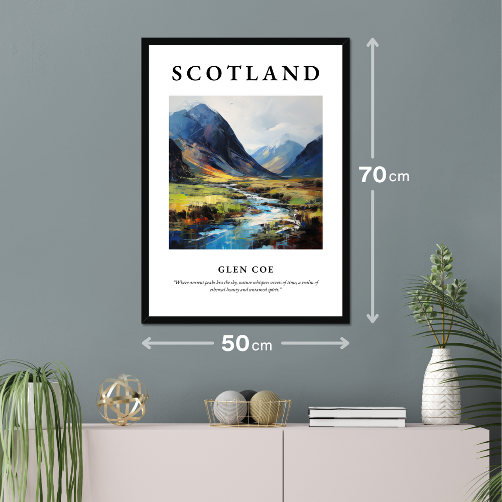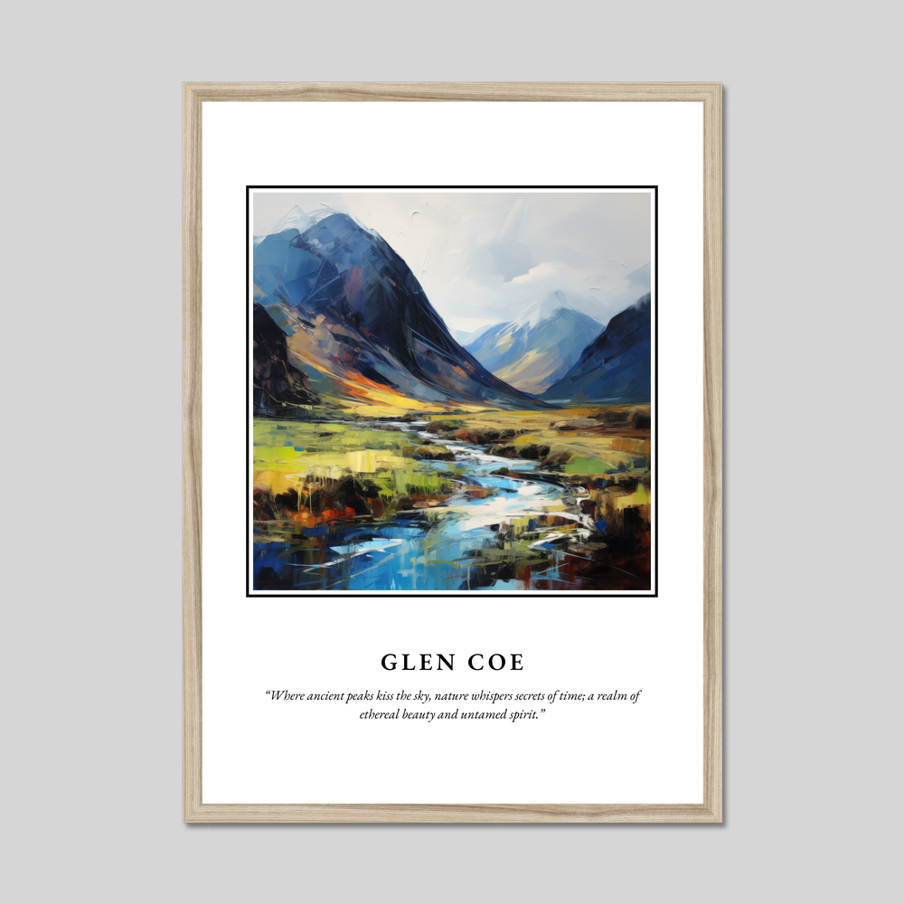 Elevate your interior space with our captivating framed poster print, showcasing the majestic Glen Coe in all its expressive glory. Measuring an impressive 50cm x 70cm, this piece demands attention and transforms any room without commanding a hefty price. Available in a chic selection of black, white, or natural wood-effect frames, it provides a finish that complements any decor style, making it a versatile addition to your living space.