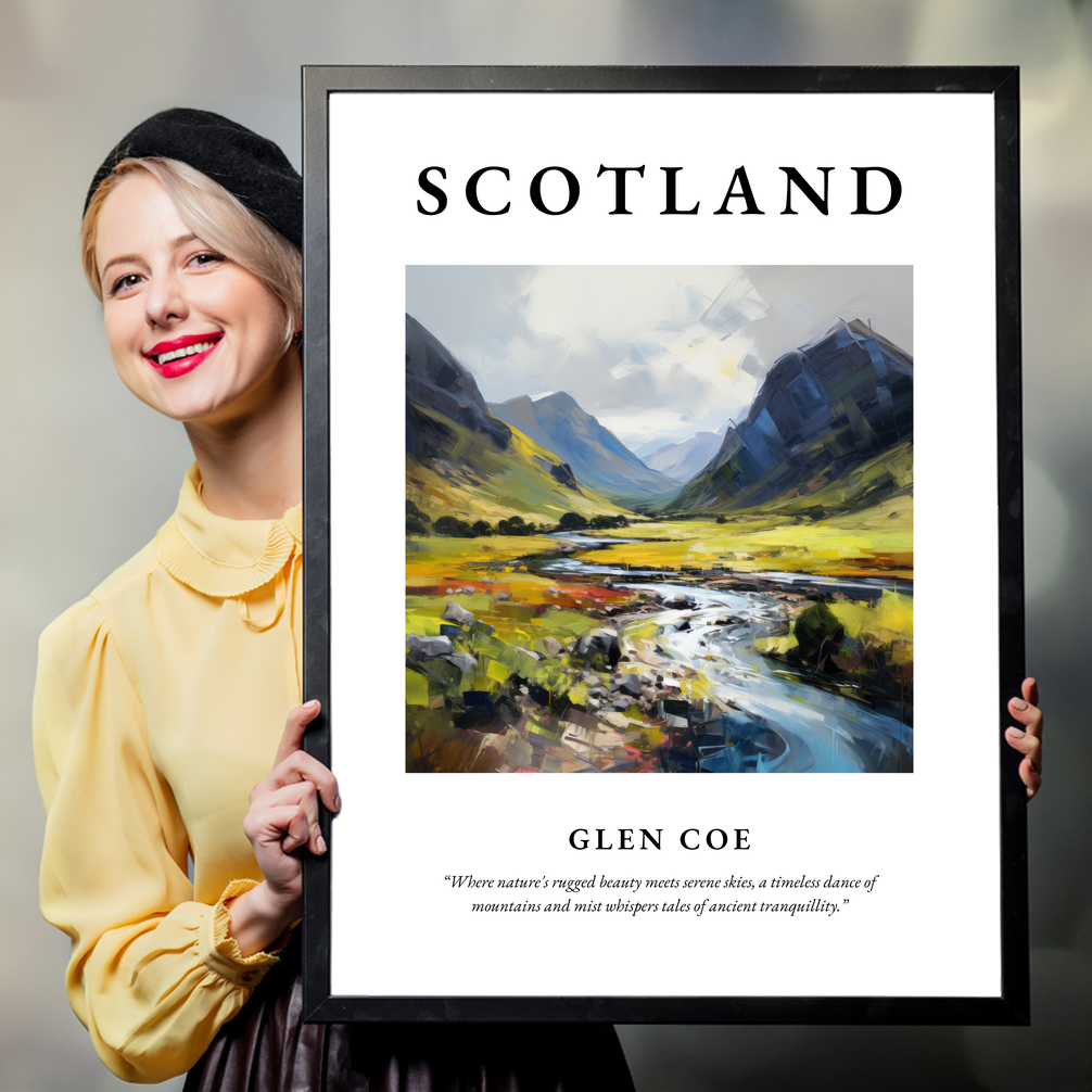 At the top, the bold lettering of "SCOTLAND" captures the essence of this captivating land. Below, the expressionistic painting of Glen Coe comes alive with vibrant strokes and dynamic contrasts. The scene bursts with colours that suggest a blend of emotions, showcasing the dramatic landscape where towering mountains meet lush valleys. The quote, “Where nature's rugged beauty meets serene skies, a timeless dance of mountains and mist whispers tales of ancient tranquillity,” beautifully encapsulates the soul of this remarkable place.