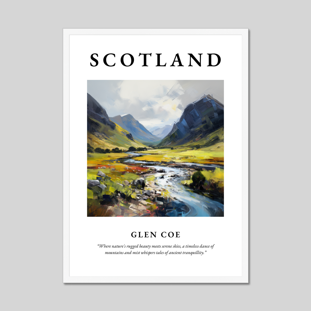 Glen Coe, often referred to as the ‘Glen of Weeping,’ is steeped in history and dramatic natural beauty. Known for its breathtaking landscapes, it has inspired countless artists and adventurers. Its rugged beauty and serene skies marry perfectly in this artwork, capturing not only the physical allure but also the emotional depth of the region. Whether you have walked its ancient trails, breathed its crisp mountain air, or simply dream of its splendor, this poster is a heartfelt tribute to a truly magical place.