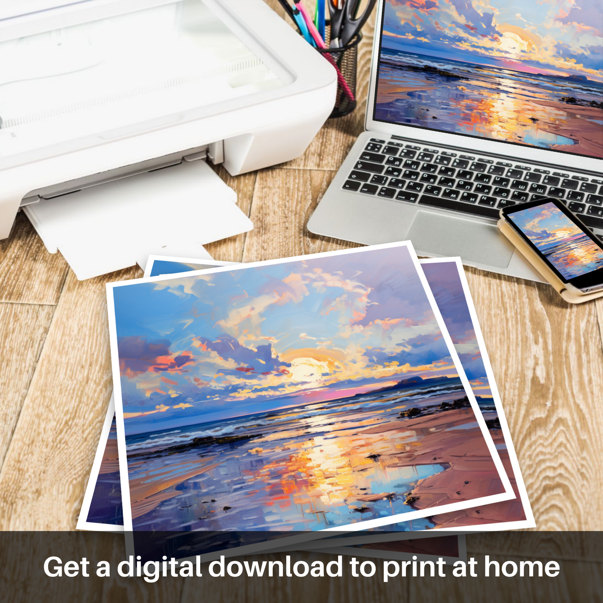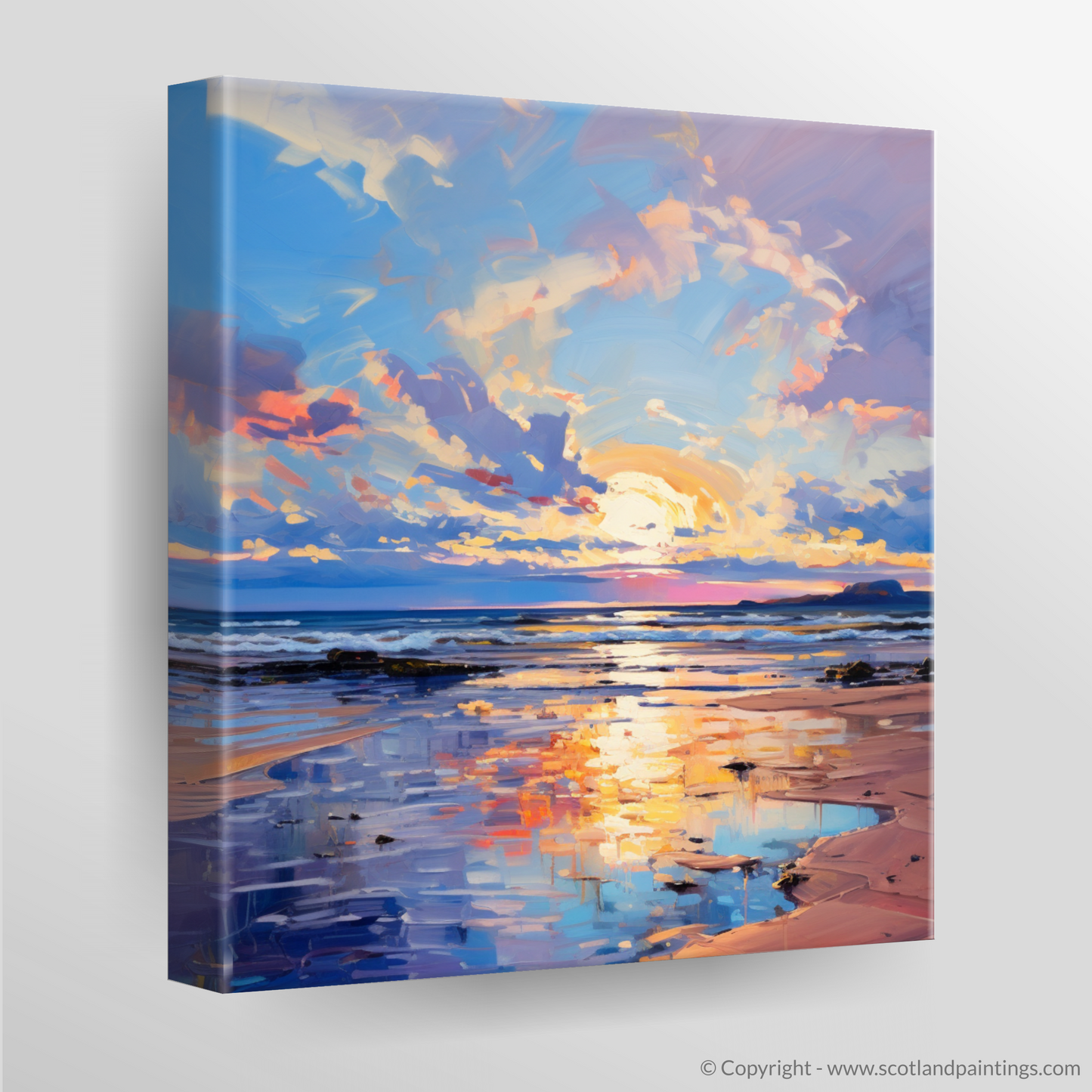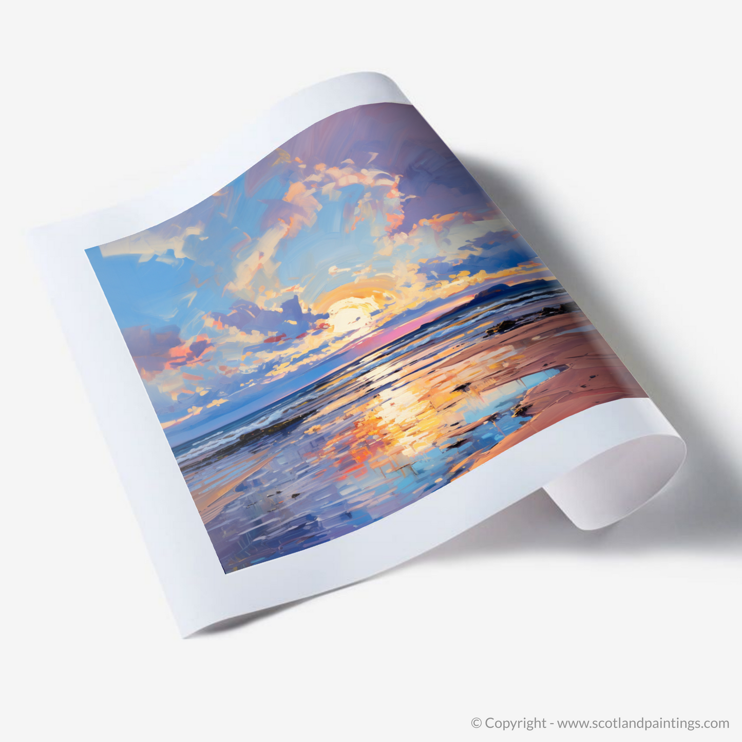 Capturing the captivating serenity of Longniddry Beach at the day's end, this evocative piece is a feast for the senses, resonating with the raw emotion and dynamic brushwork characteristic of Expressionism. Swirls of vibrant oranges, pinks, and blues dance across the canvas, reflecting the fiery orb of the setting sun as it makes its descent towards the horizon. The sky, a spectacular canvas in itself, is a tumultuous symphony of hues that mirror the ephemeral beauty of a Scottish sunset.