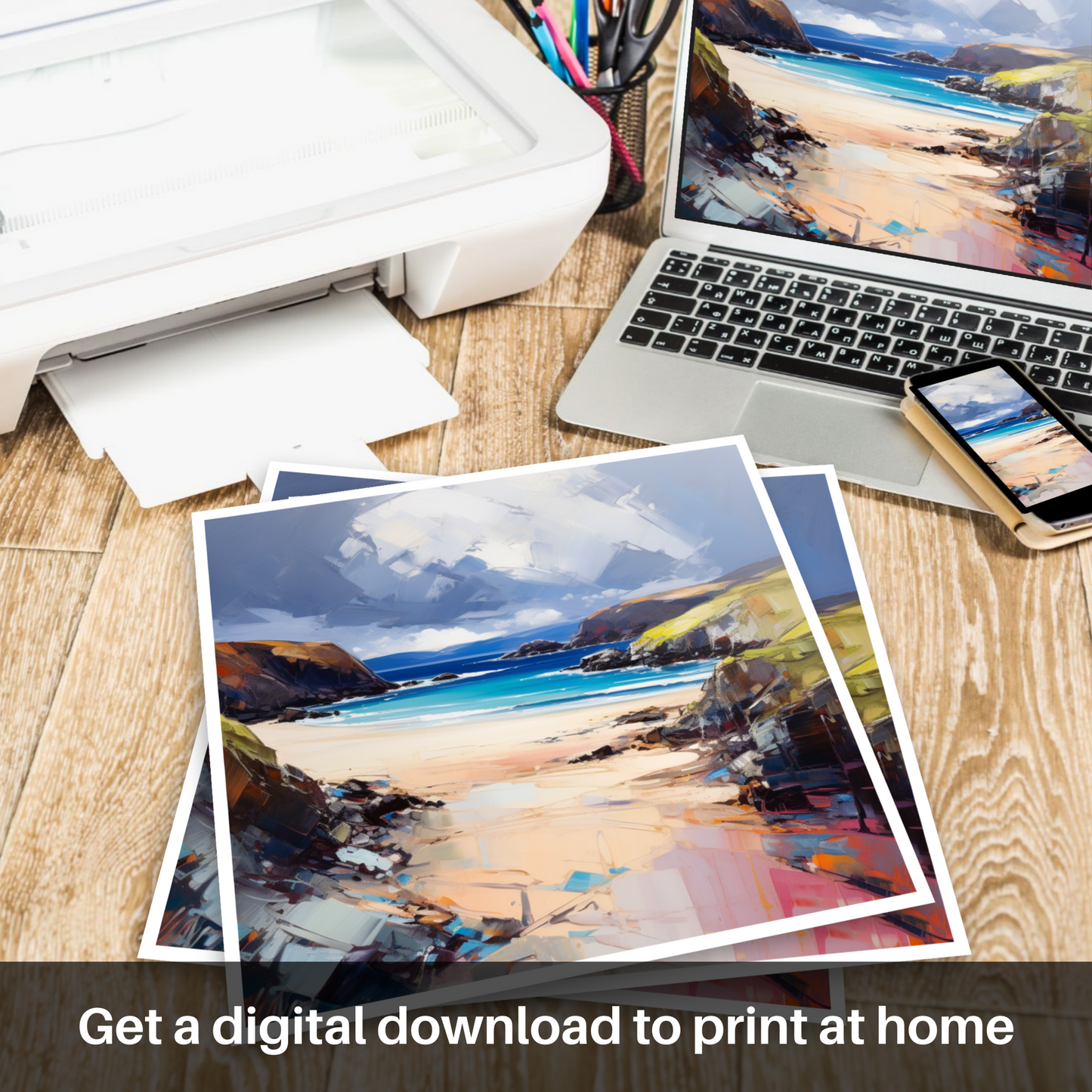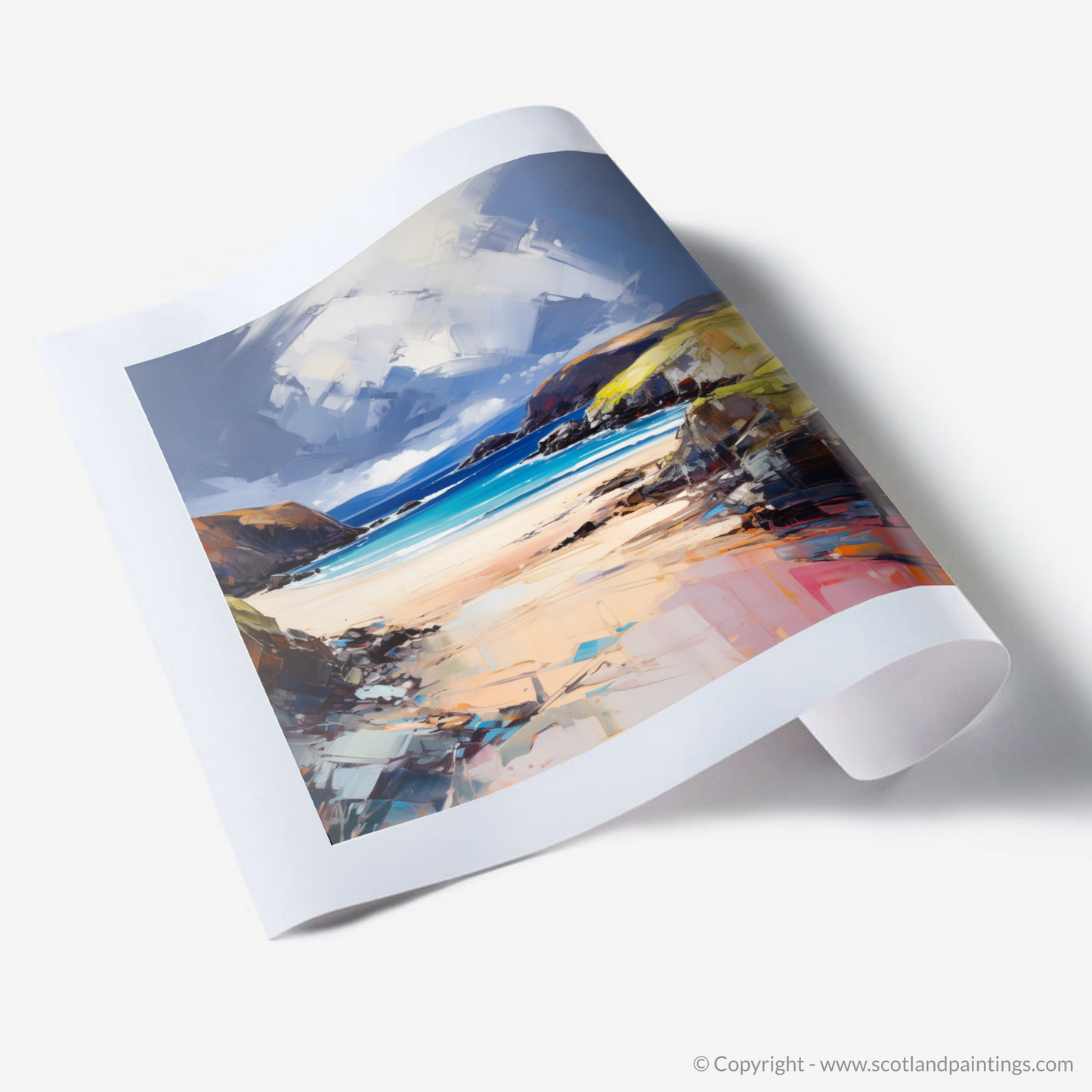 This captivating print is a dynamic and vibrant interpretation of Balnakeil Bay, Durness, Sutherland, showcasing the untamed beauty of Scottish coves. The piece features an explosion of colour and emotion, indicative of the expressionist style. Bold strokes and an energetic palette capture the raw essence of the landscape, with azure blues and turquoise hues suggesting the crisp, refreshing waters of the bay. Contrasting touches of warm ochres and sandy beiges evoke the soft, inviting sands of the cove, while deep siennas and rusty reds mirror the rugged cliffs that stand as silent guardians of this secluded haven.