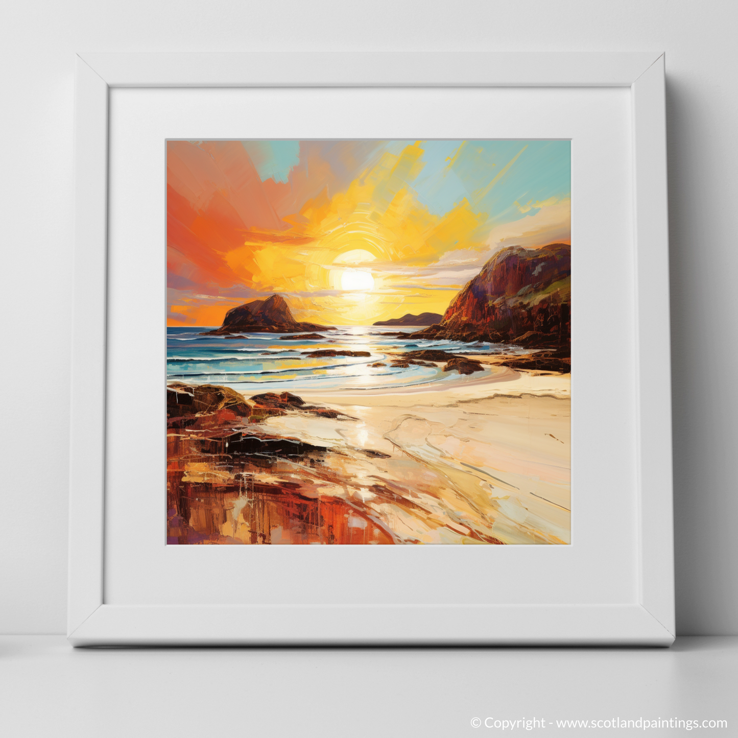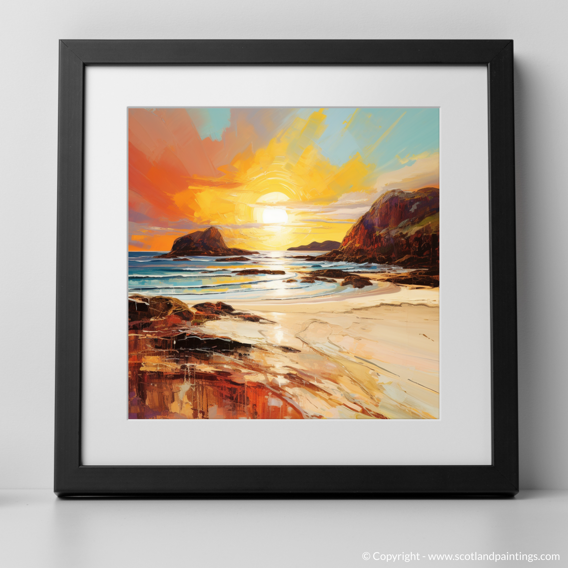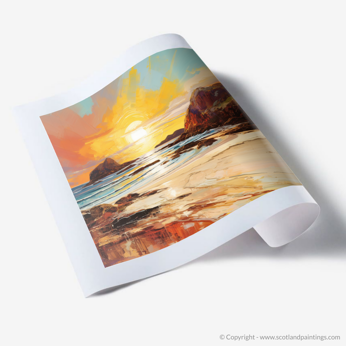 Capturing the mesmerising essence of Achmelvich Bay at the magical golden hour, this exceptional print invites the viewer into a vivid and passionate interpretation of one of Scotland's hidden treasures. Expressed through bold, impasto strokes and a radiant palette of blazing oranges, deep reds, and luminous yellows, the sky is rendered with an almost tangible intensity, reminiscent of the vivid and emotional power of Expressionism.