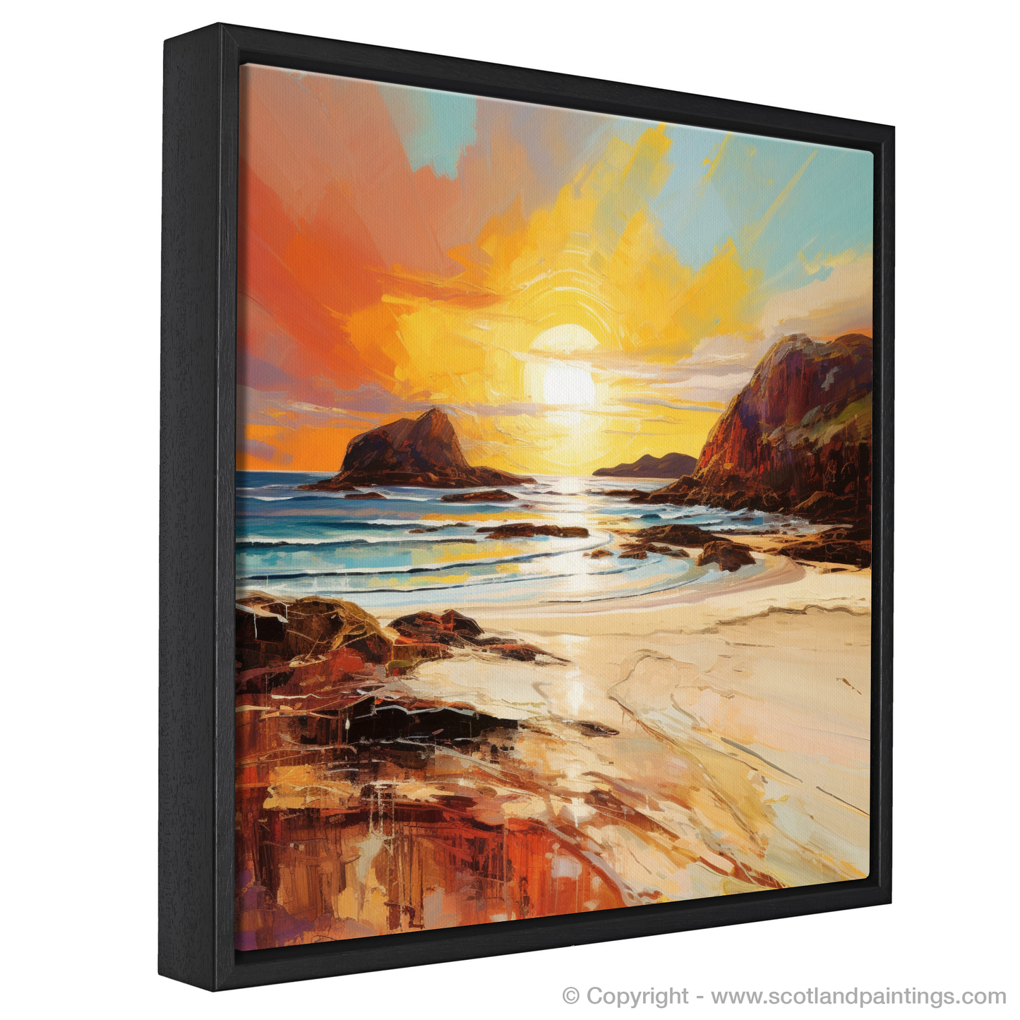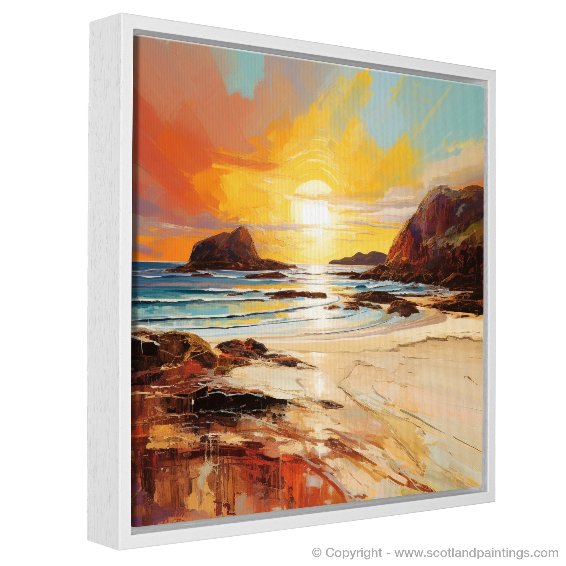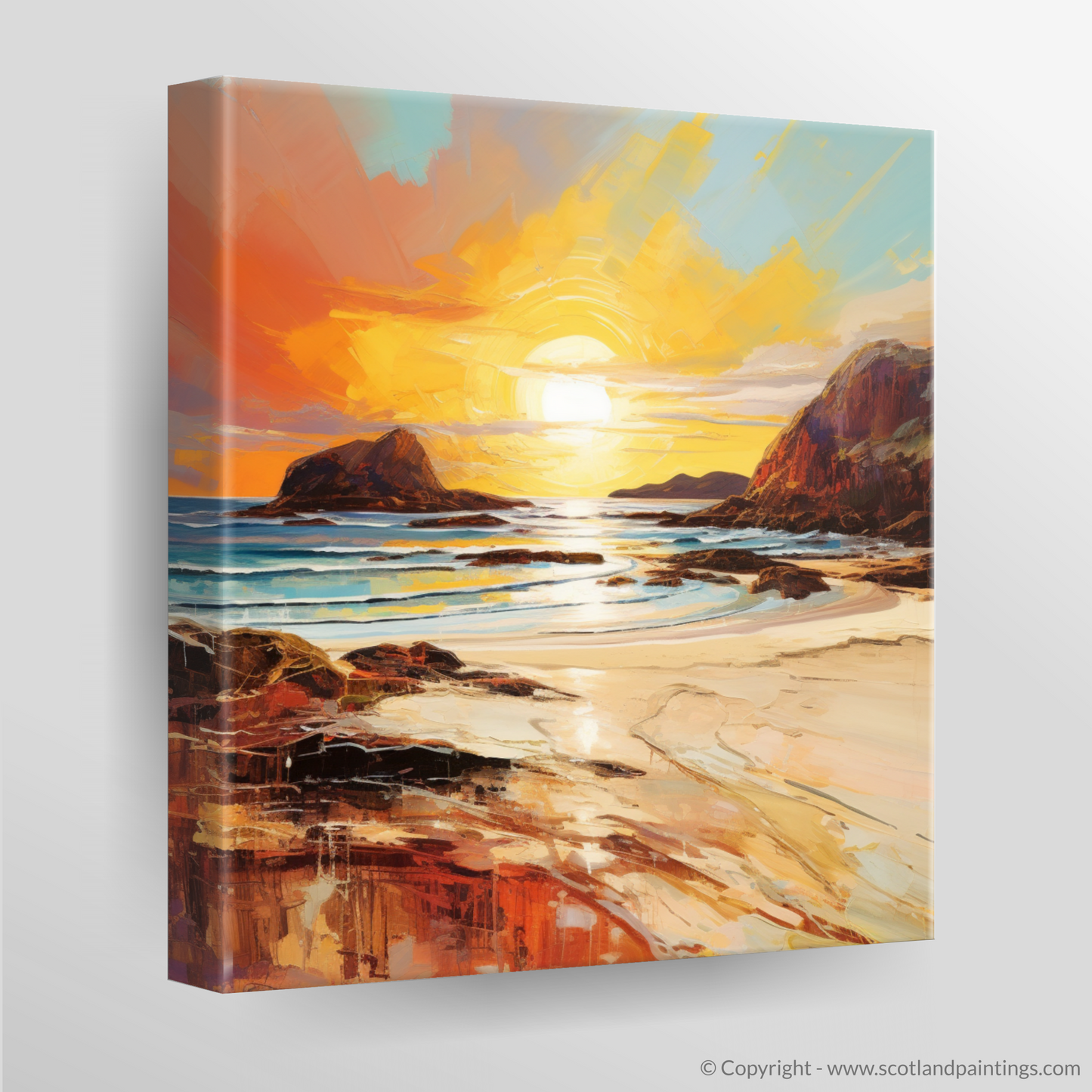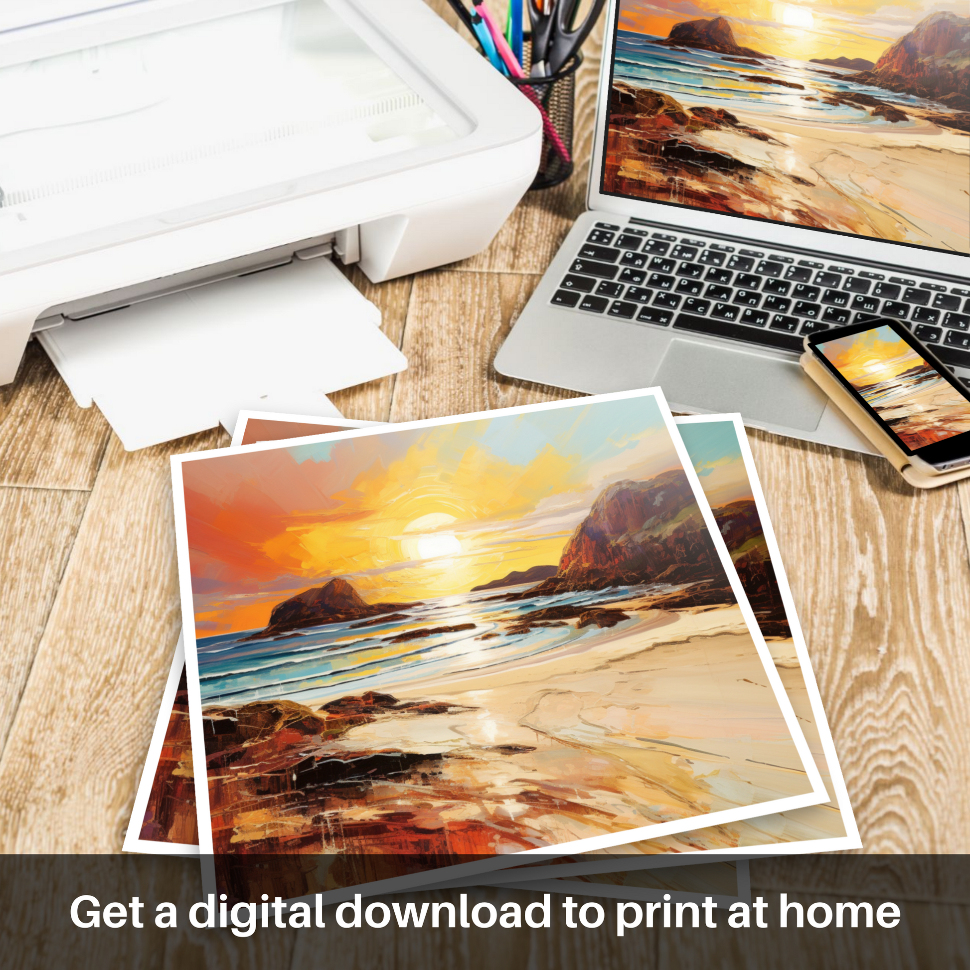 Capturing the mesmerising essence of Achmelvich Bay at the magical golden hour, this exceptional print invites the viewer into a vivid and passionate interpretation of one of Scotland's hidden treasures. Expressed through bold, impasto strokes and a radiant palette of blazing oranges, deep reds, and luminous yellows, the sky is rendered with an almost tangible intensity, reminiscent of the vivid and emotional power of Expressionism.