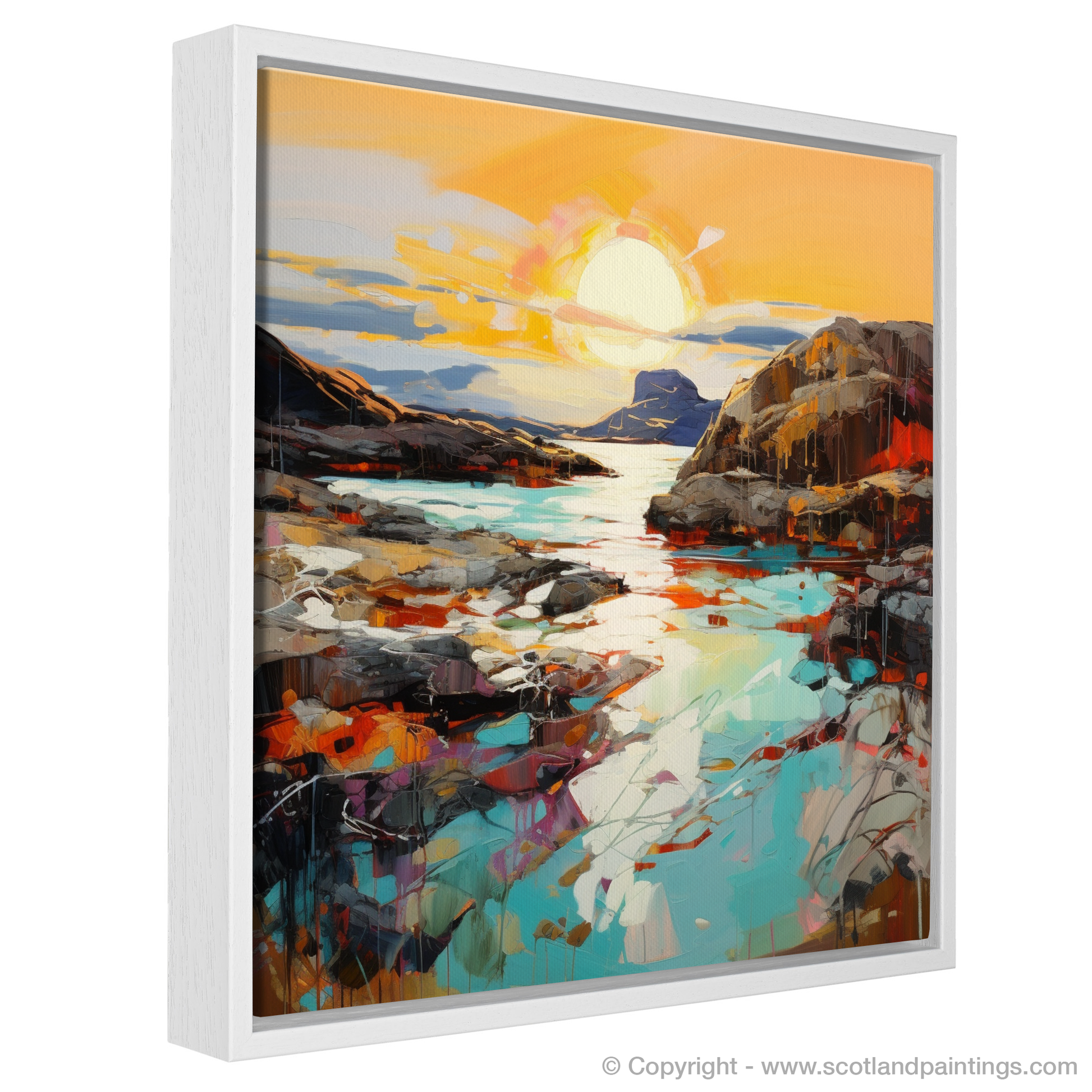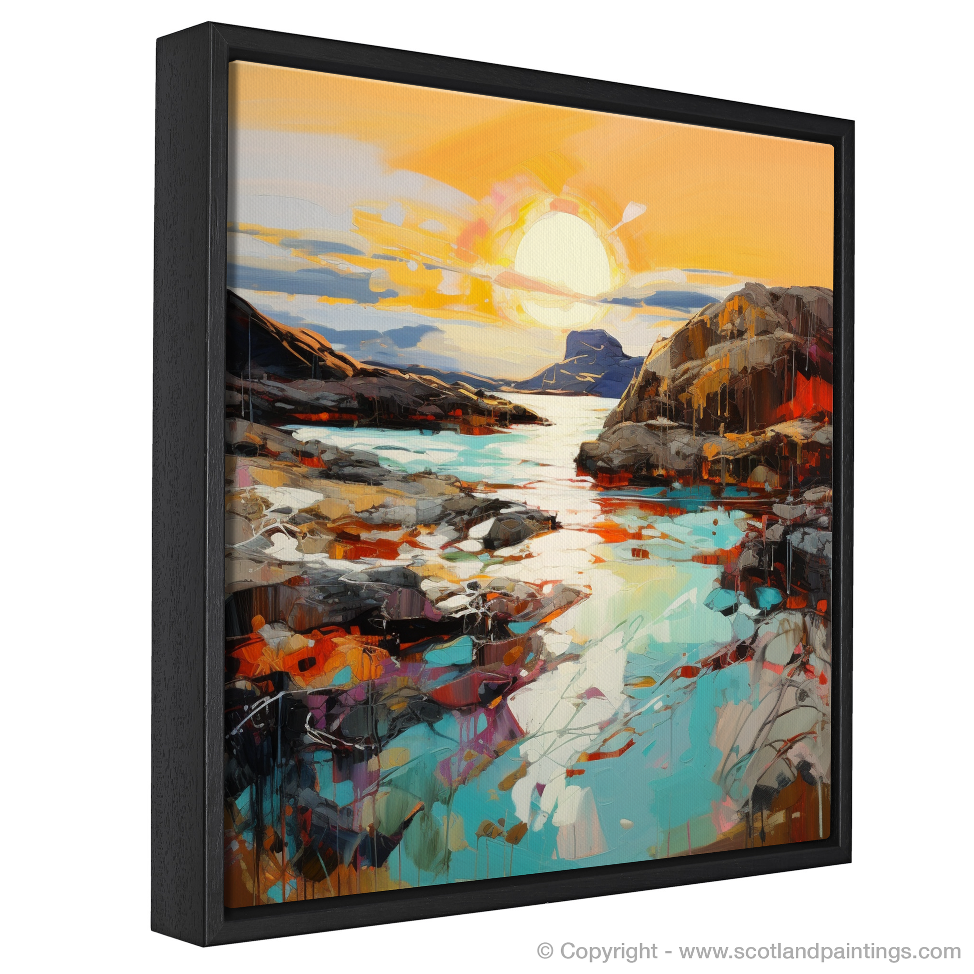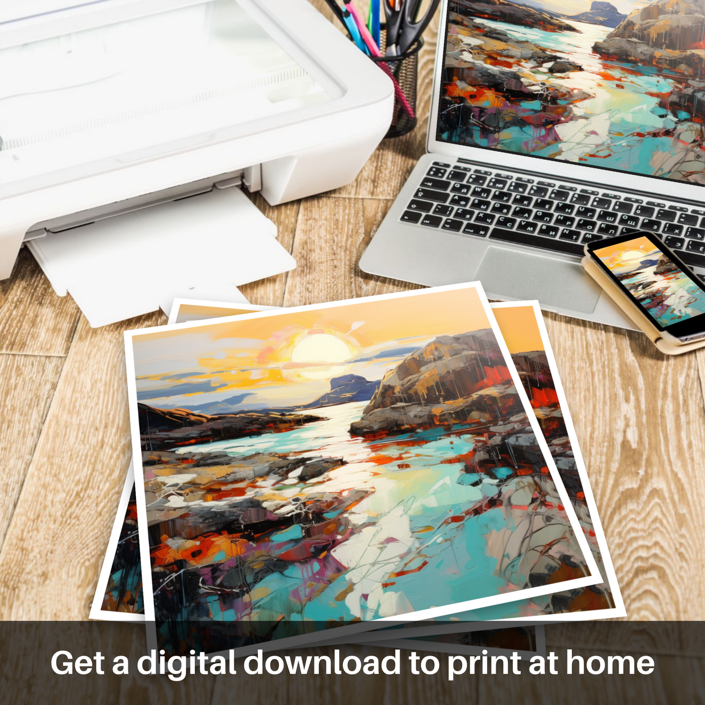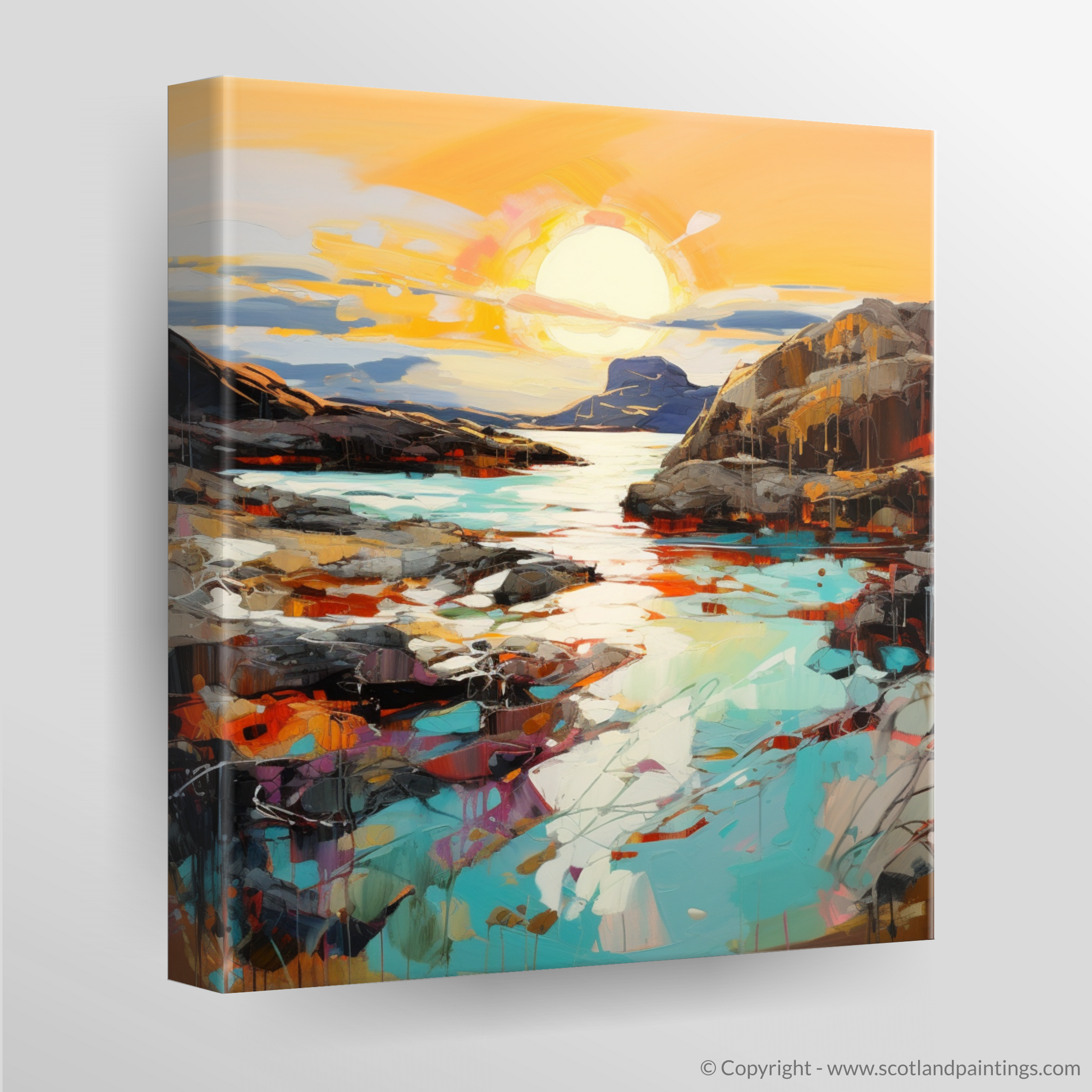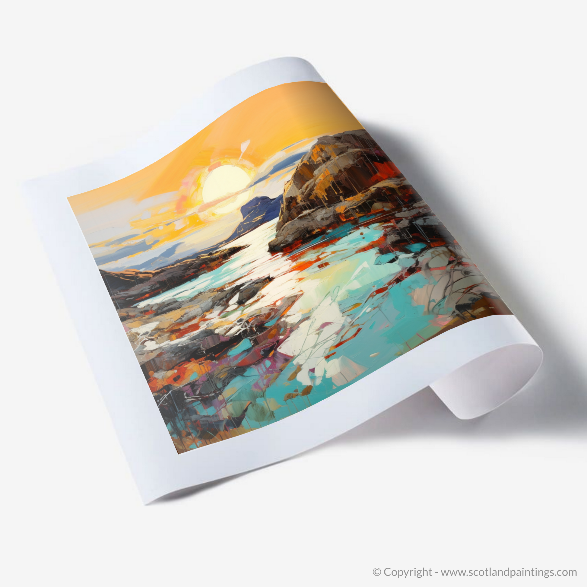 Capturing the ephemeral grace of Achmelvich Bay at the enchanting golden hour, this expressionist piece exudes a vibrant energy that brings the Scottish coast to life. The canvas is awash with a rich palette of fiery oranges and sumptuous golds, as the setting sun casts its warm gaze over the serene waters, illuminating the sky with a captivating glow that marries the day with the onset of evening.