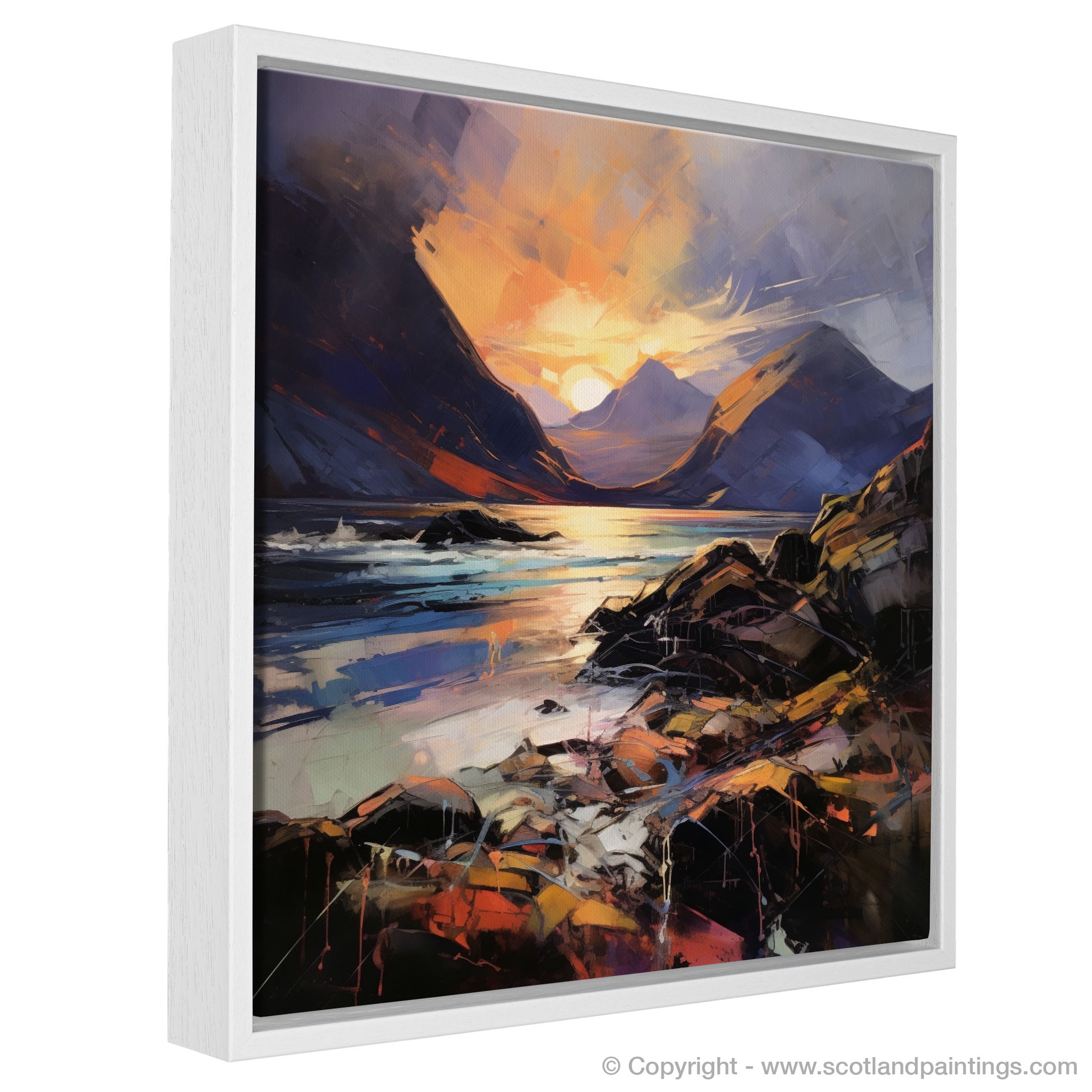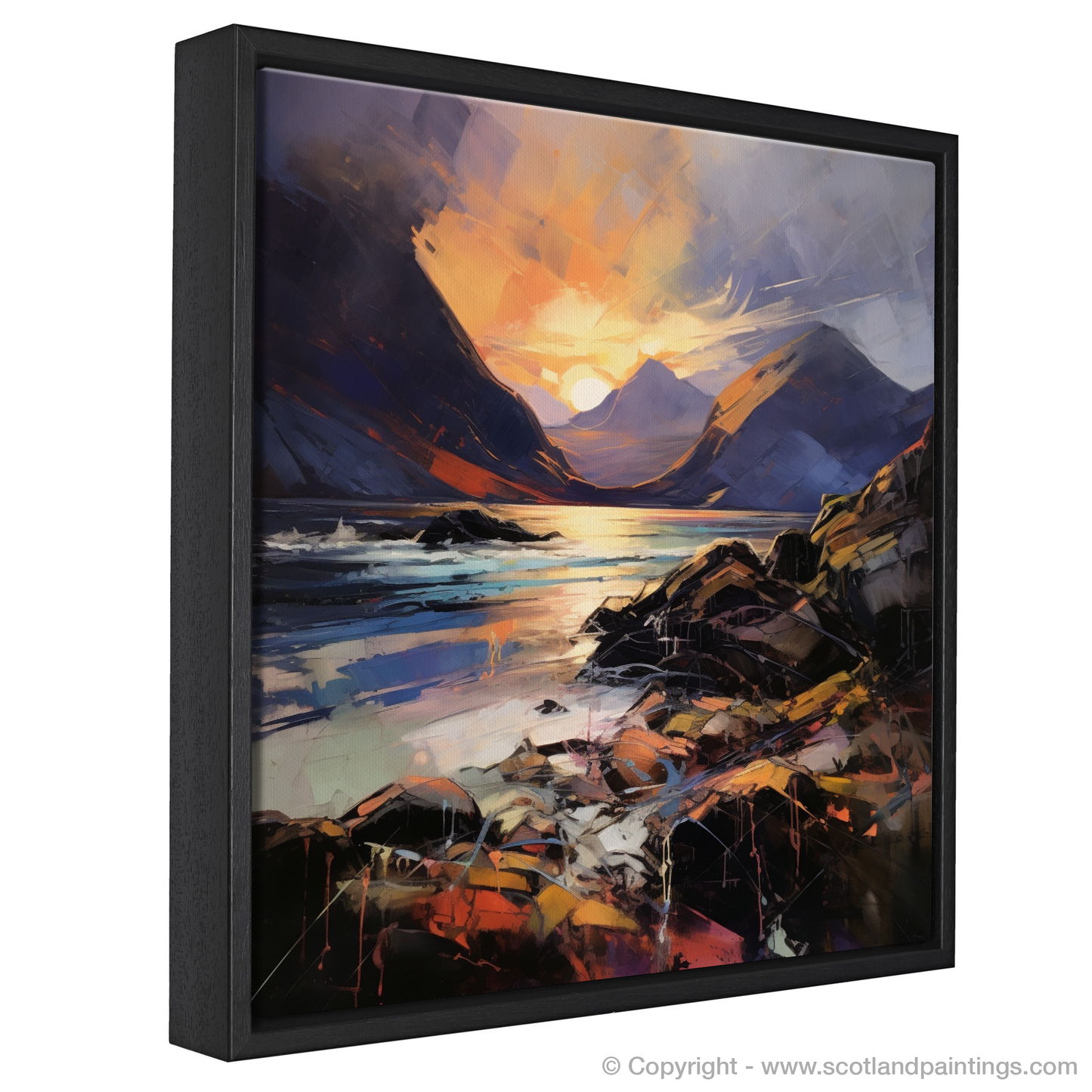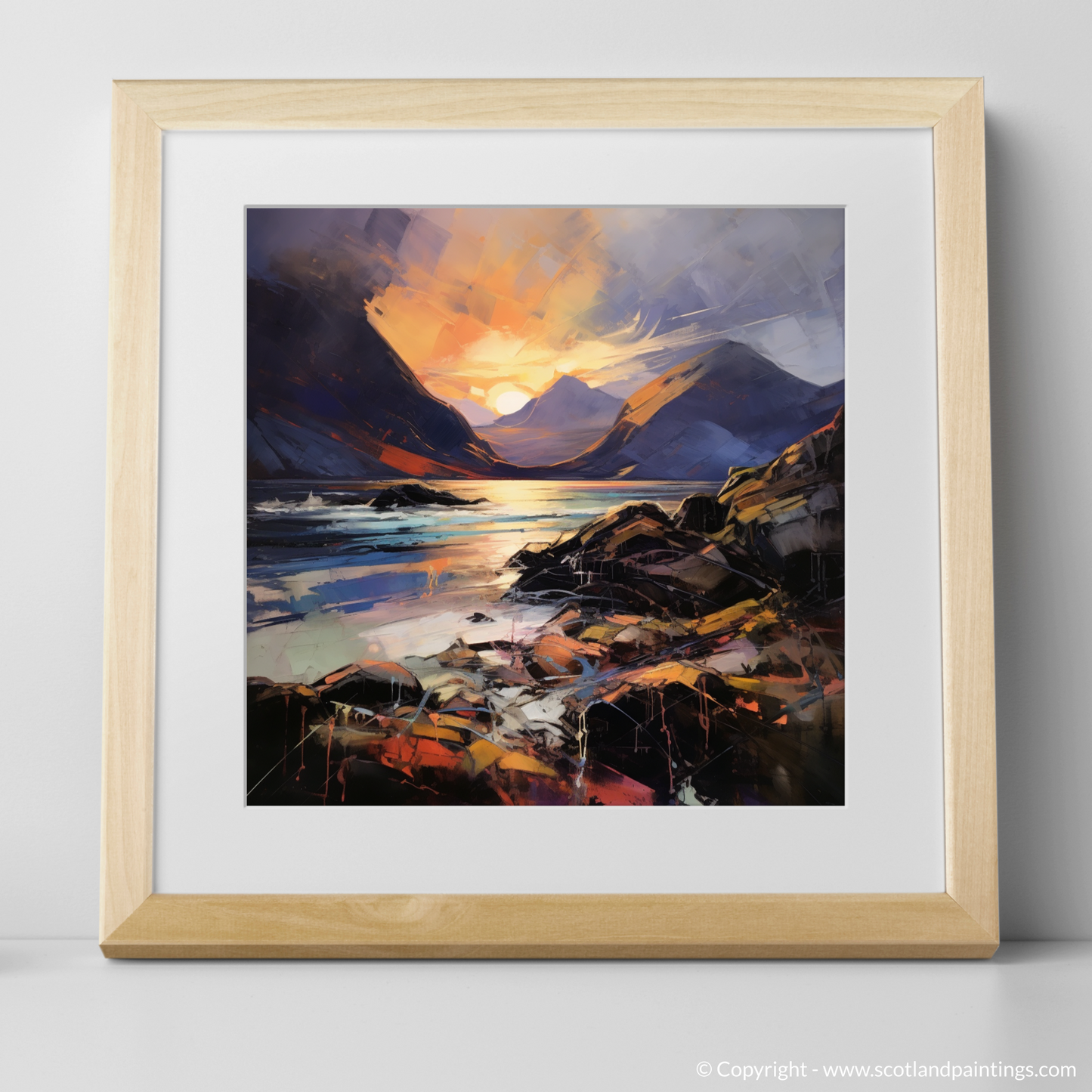 Captured in the emotive strokes of Expressionism, this evocative print of Elgol Bay at sunset is a symphony of colour and contrast that speaks to the rugged beauty of the Scottish coastline. The viewer's gaze is drawn across the tranquil waters, shimmering with reflections of the waning sun, as it dips behind the commanding silhouettes of jagged peaks.