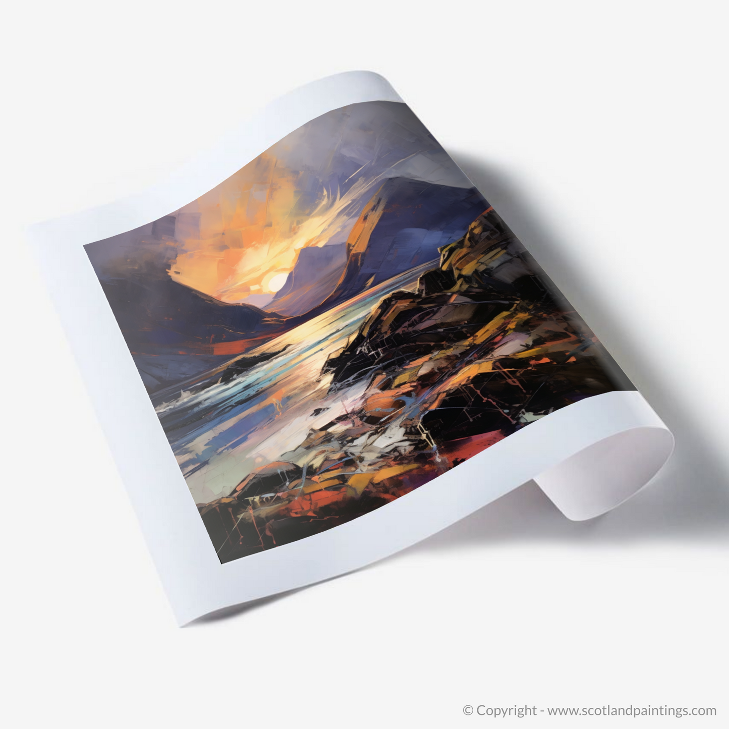The dynamism of the brushwork adds a palpable energy to the stillness of the scenery, inviting the observer into a moment of awe and reflection. This print, a treasure from the 'Scottish Coves' collection, offers a window into the untamed splendour of Scotland's shores, a testament to the enduring allure of Elgol Bay at the close of day.