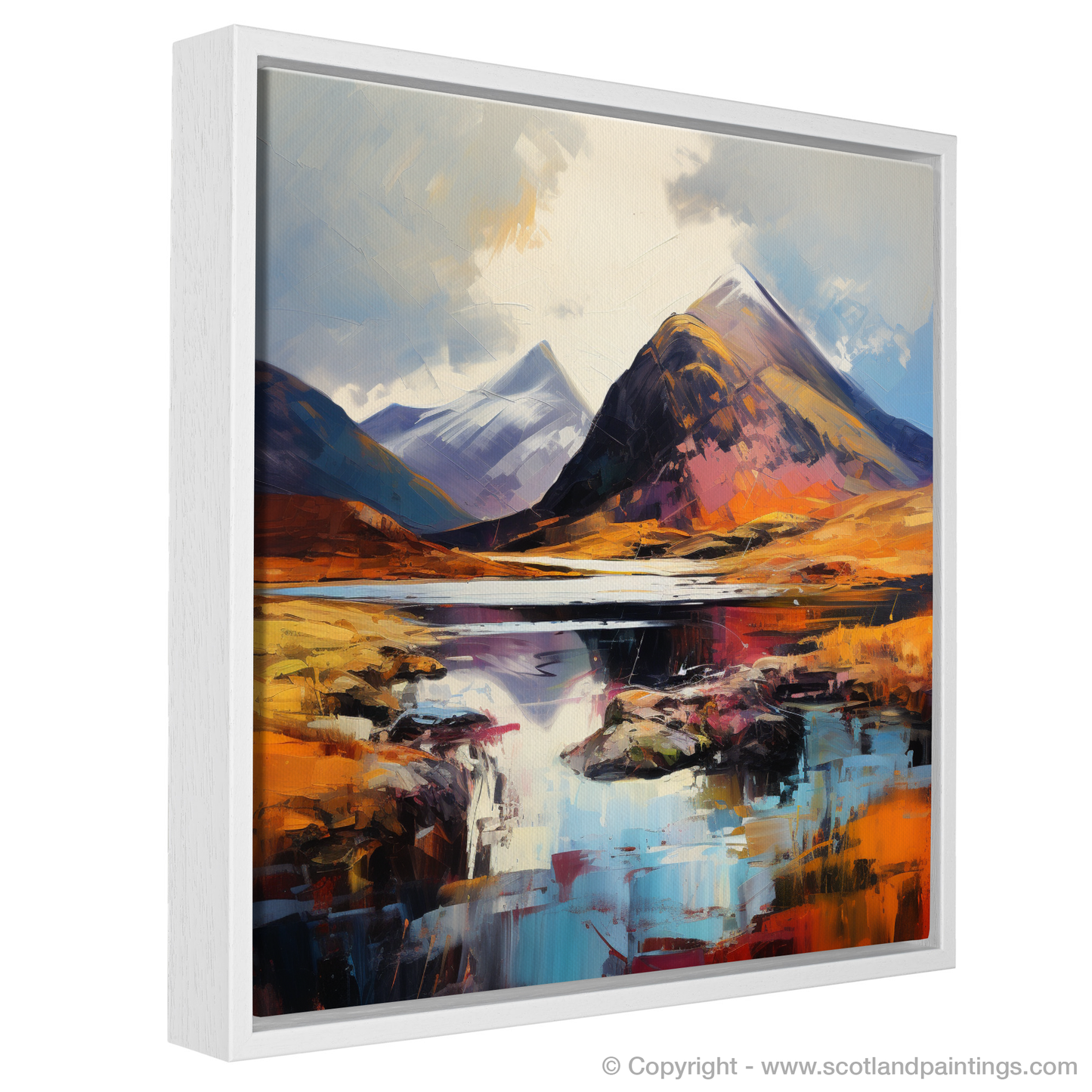 Below, an almost ethereal body of water mirrors the heavens, its surface broken by expressive strokes of white, capturing the glassy calm of a highland loch. Reflections of the mountain and sky intermingle in blues and purples, crafting a serene yet dynamic element that anchors the composition.
