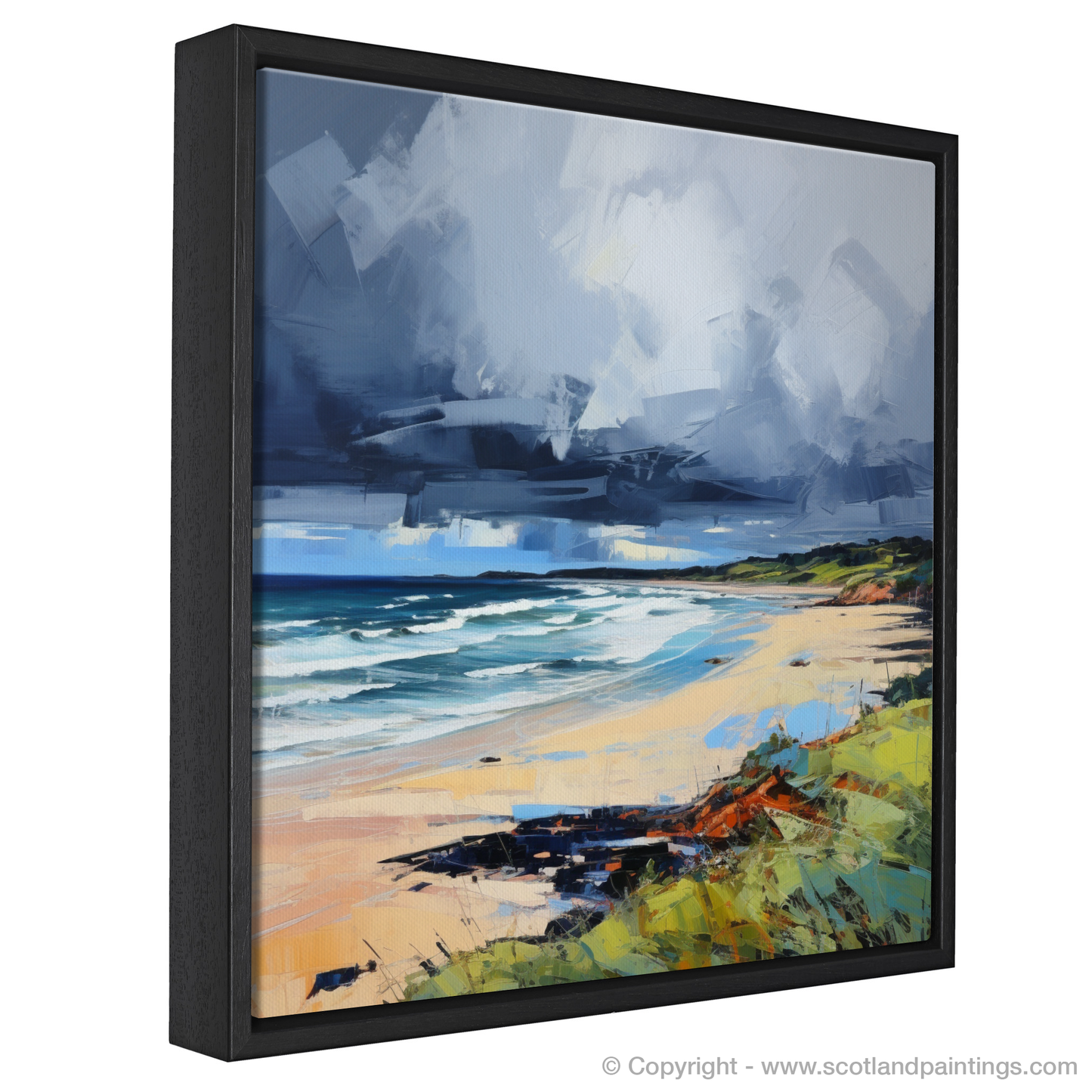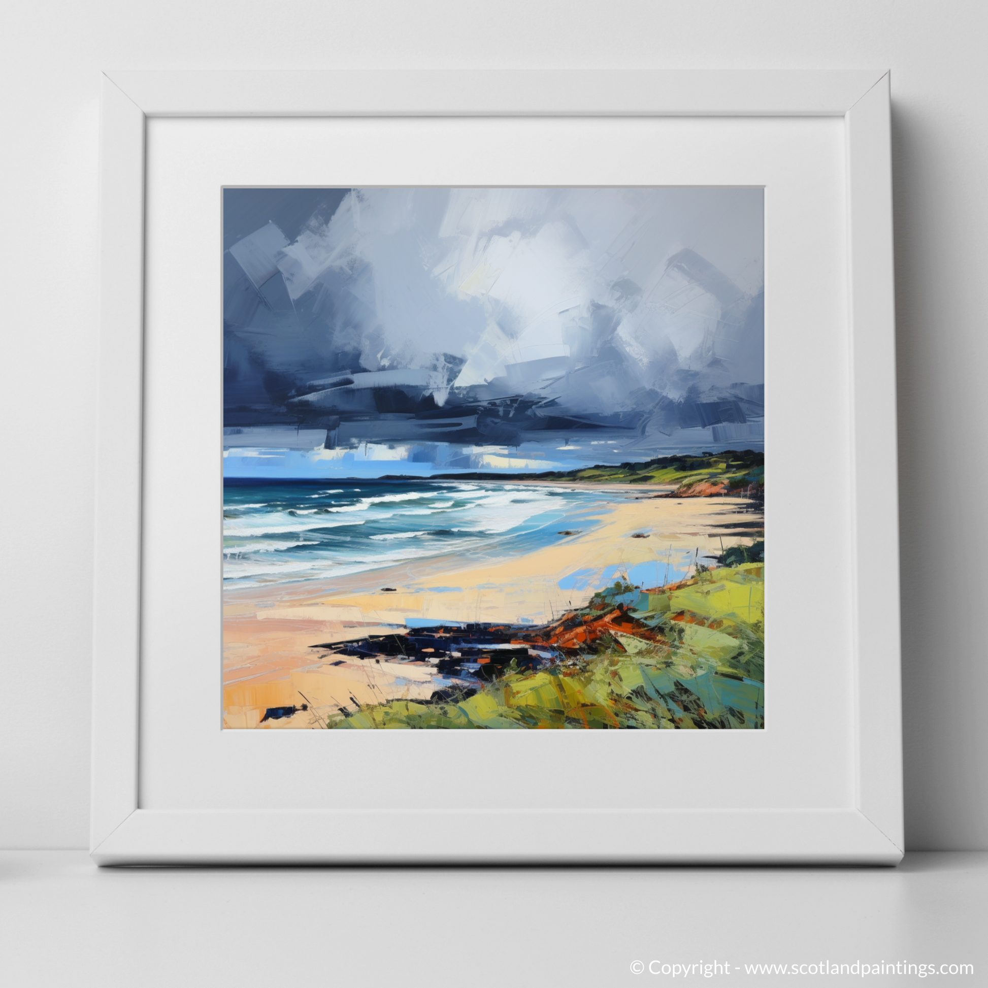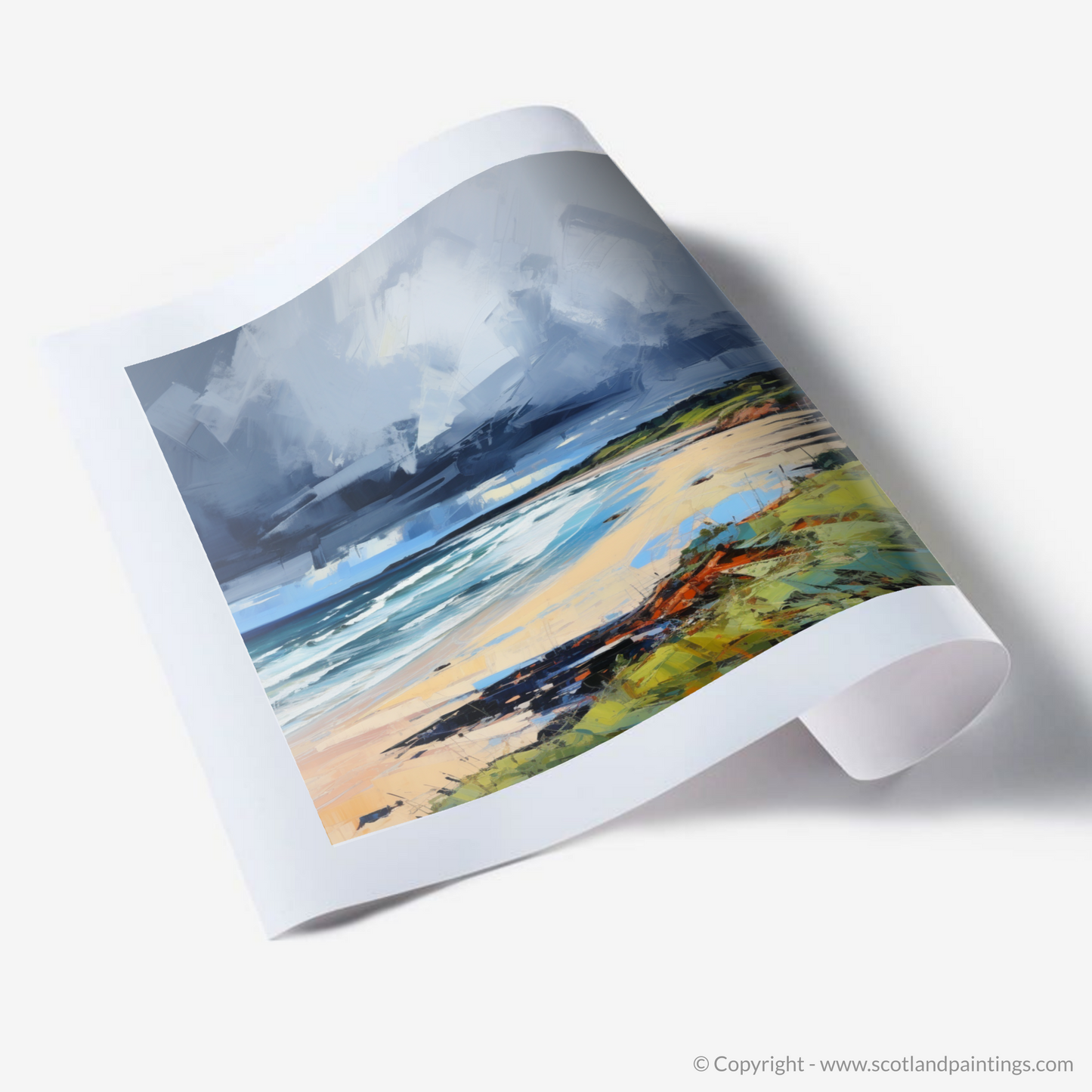 Capturing the raw beauty and dramatic ambience of Gullane Beach, this expressionist rendering invites the onlooker to witness the tempestuous side of Scotland's coastline. The image is a vivid tableau, alive with the play of contrast and movement, where the untamed waves of the tumultuous sea meet the tranquil shores.