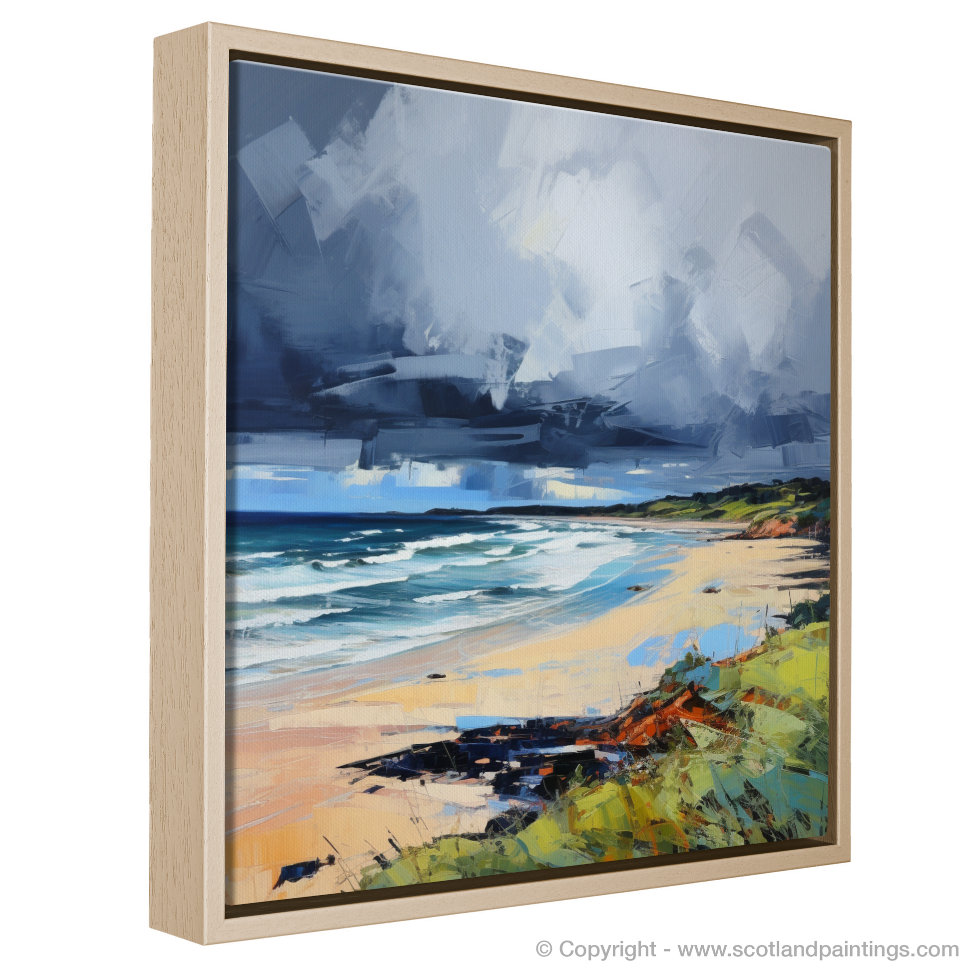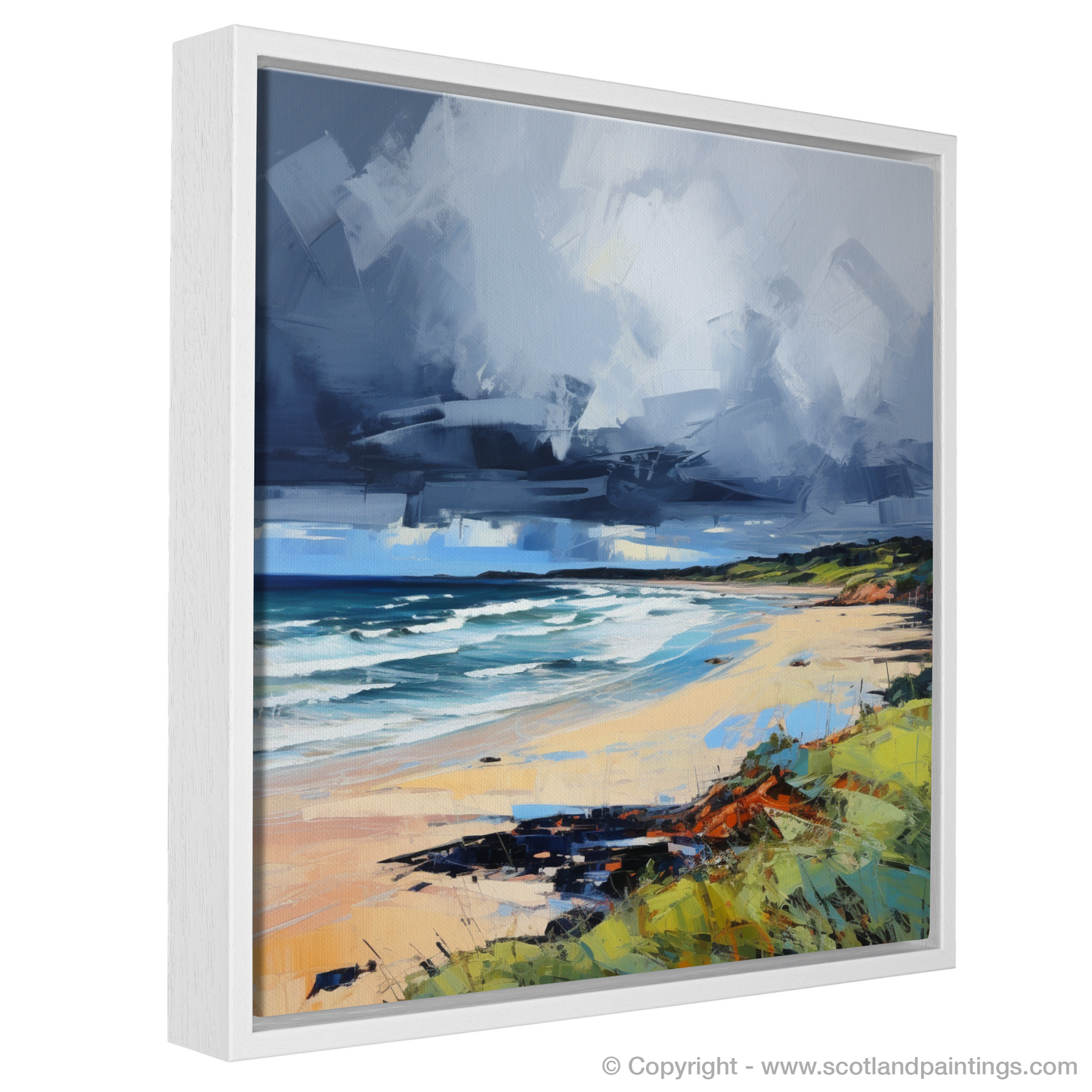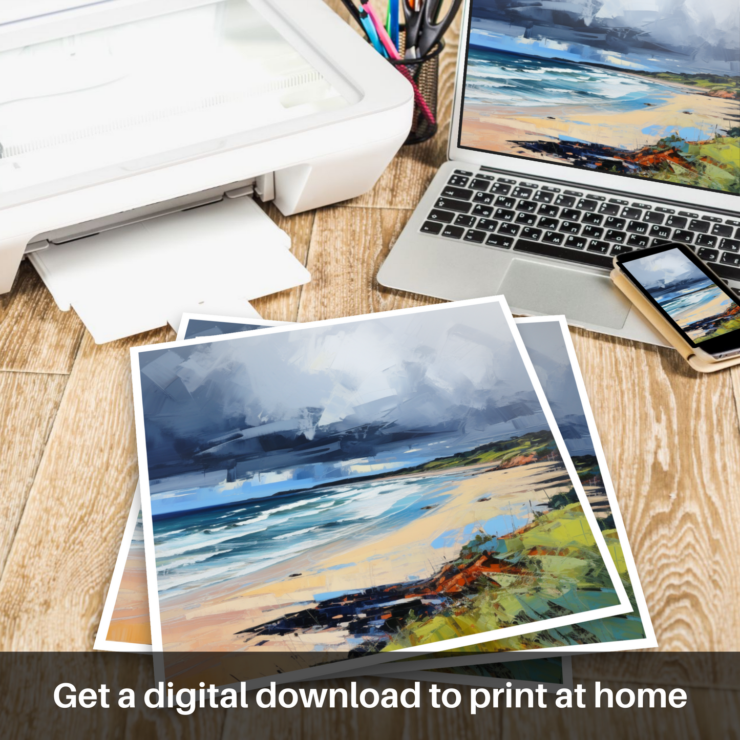 Capturing the raw beauty and dramatic ambience of Gullane Beach, this expressionist rendering invites the onlooker to witness the tempestuous side of Scotland's coastline. The image is a vivid tableau, alive with the play of contrast and movement, where the untamed waves of the tumultuous sea meet the tranquil shores.