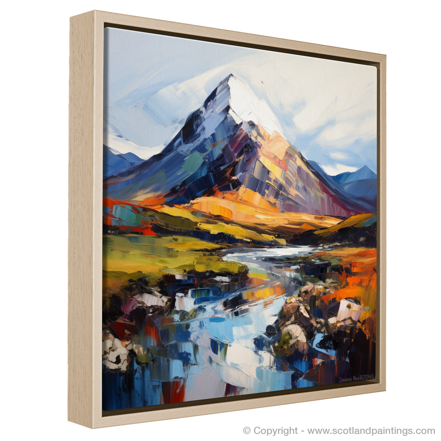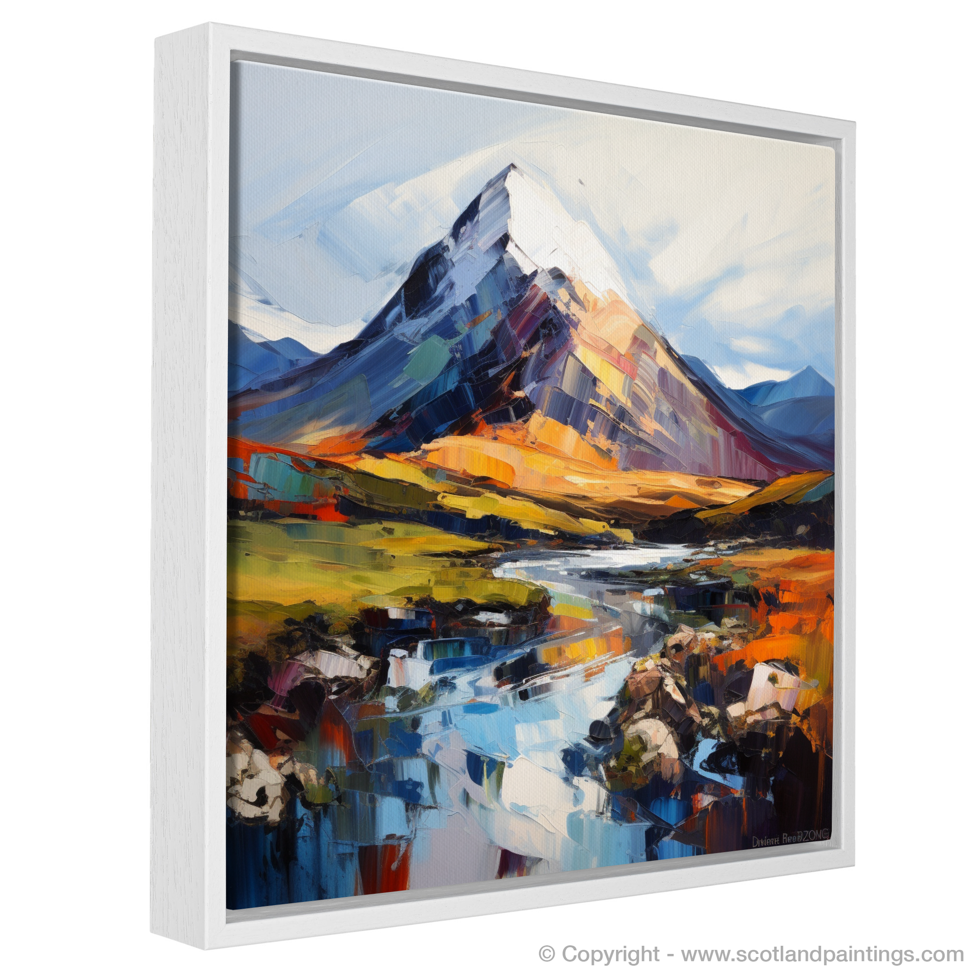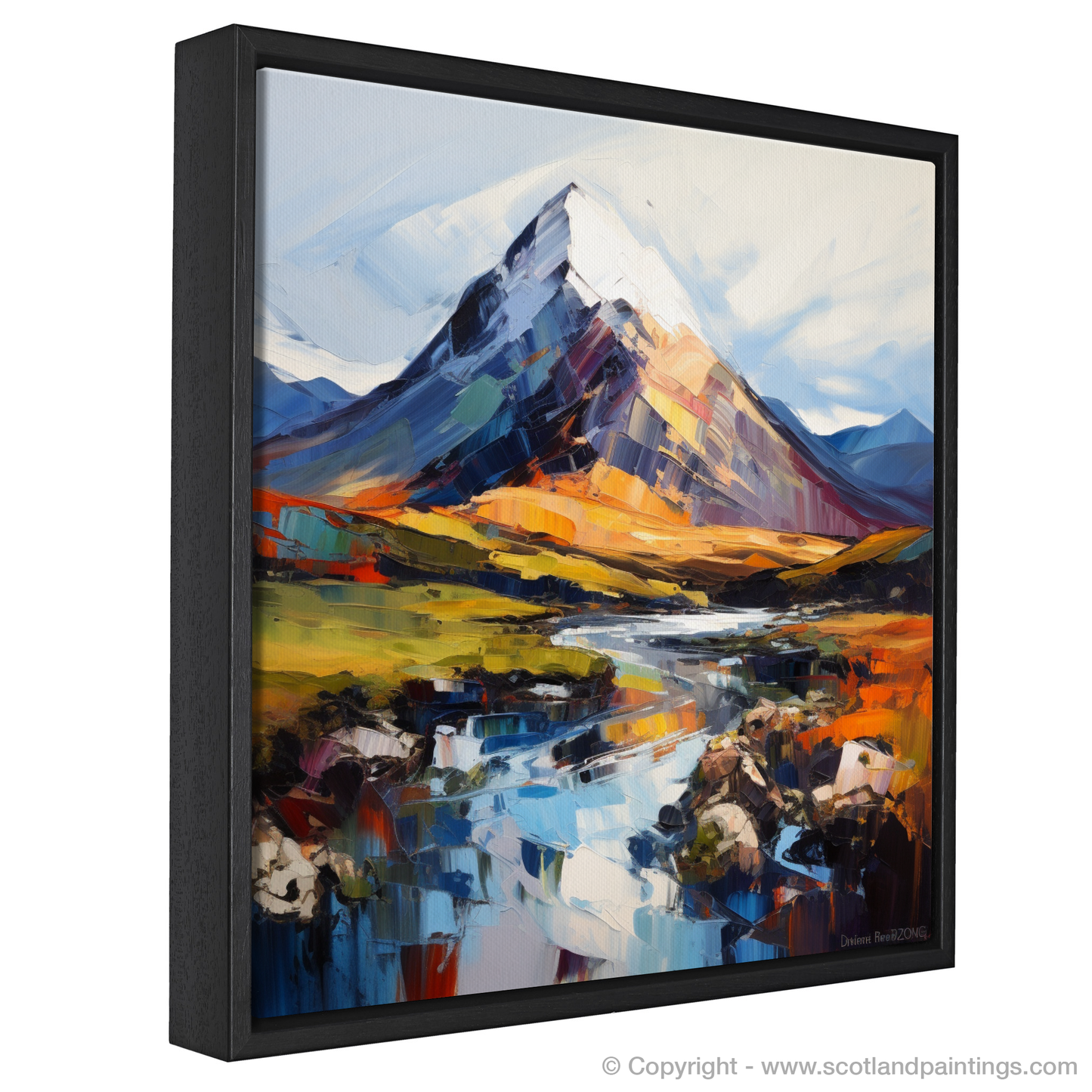 The artwork is a symphony of emotion, with the tumultuous Scottish weather mirrored in the passionate application of paint. Blues and purples convey the cool shadows found amongst the mountain's crevices, while warmer hues of orange and yellow hint at the touch of the sun's rays during a fleeting break in the clouds. The foreground is an intricate dance of reflections in water, a mirror-like canvas broken by the stones that rest in the still, clear depths.