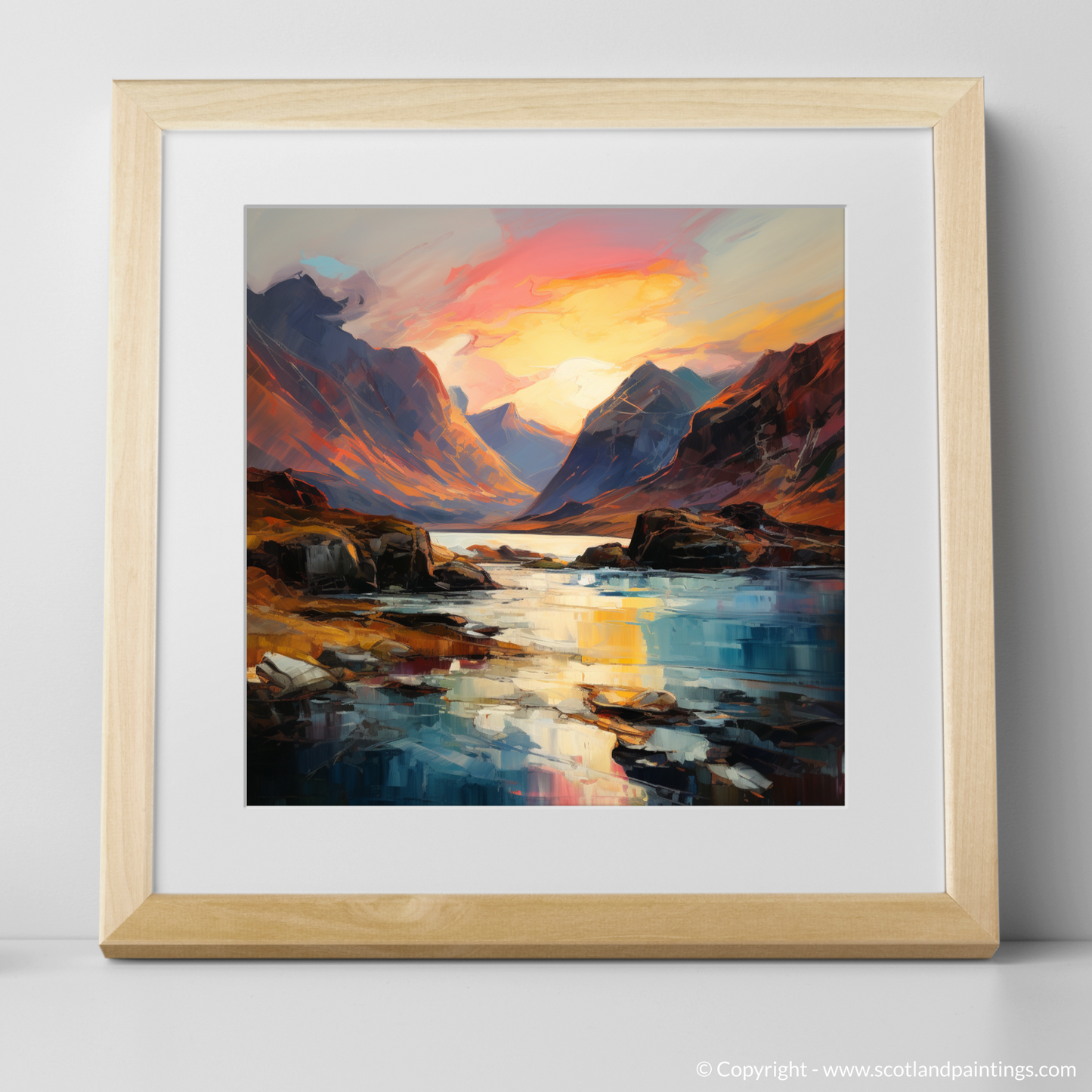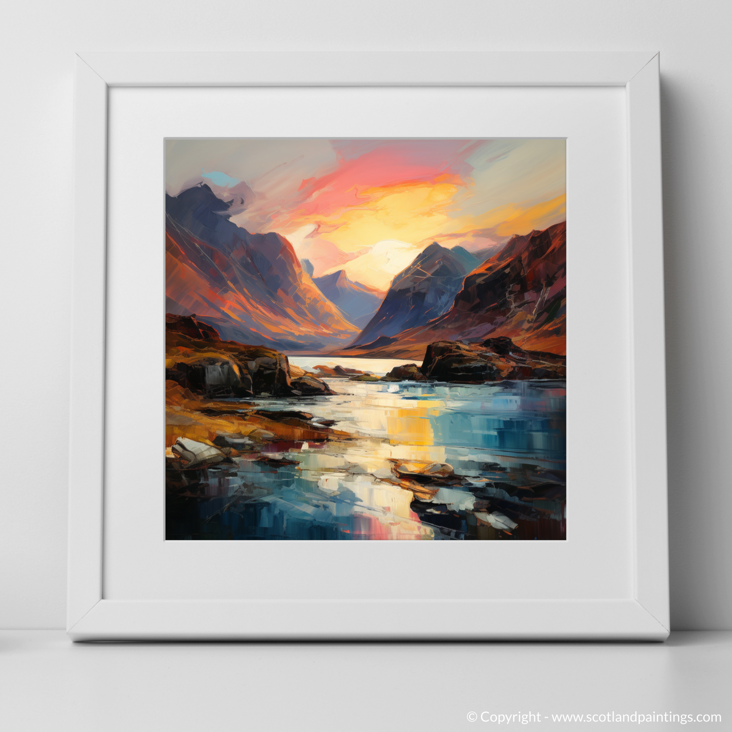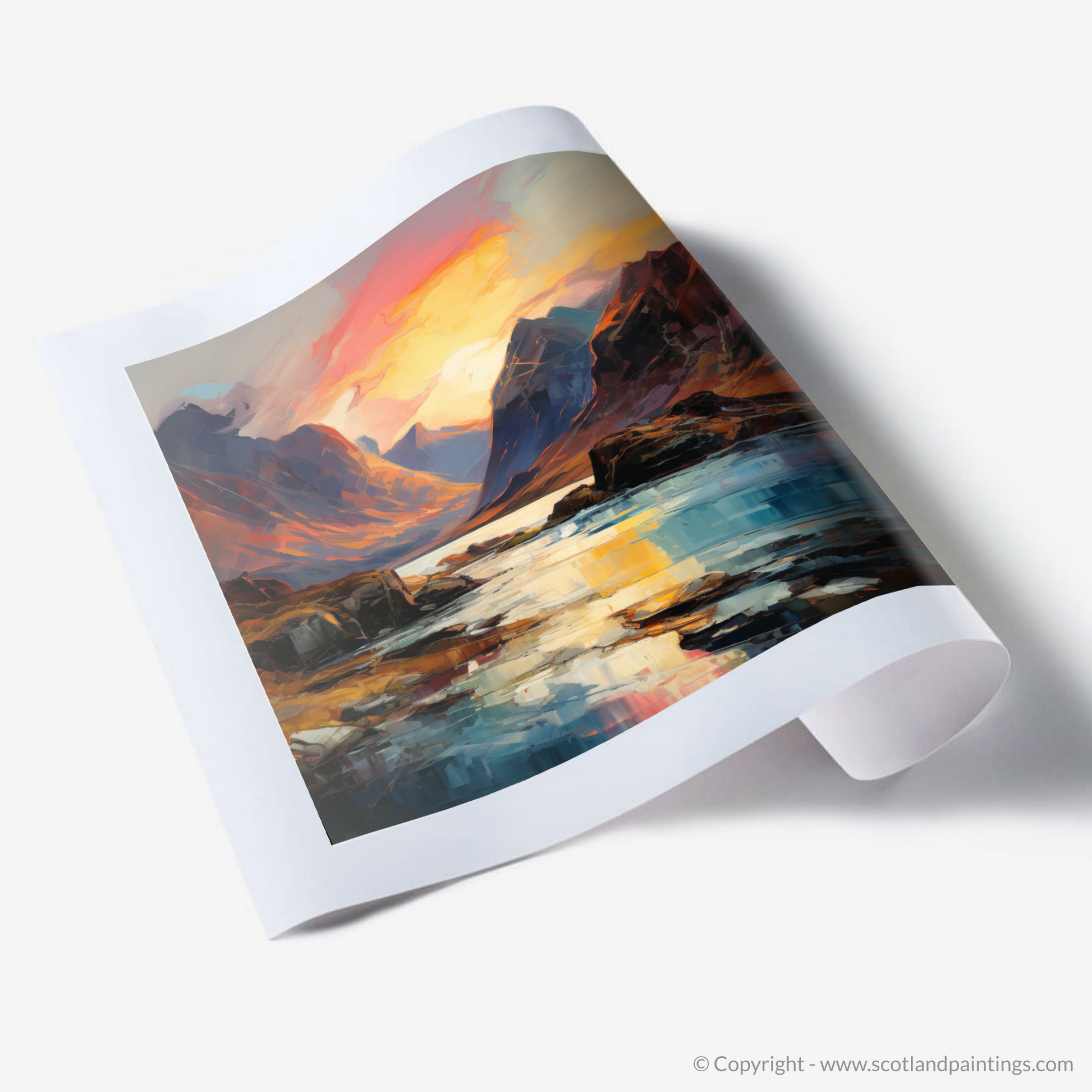 Captured within this striking expressionist print is the breath-taking grandeur of Loch Coruisk at the heart of the Scottish Highlands. The dynamic brushstrokes and vibrant colours evoke the raw emotion of nature's display as the sun sets behind the towering, rugged peaks that encase this secluded spot.
