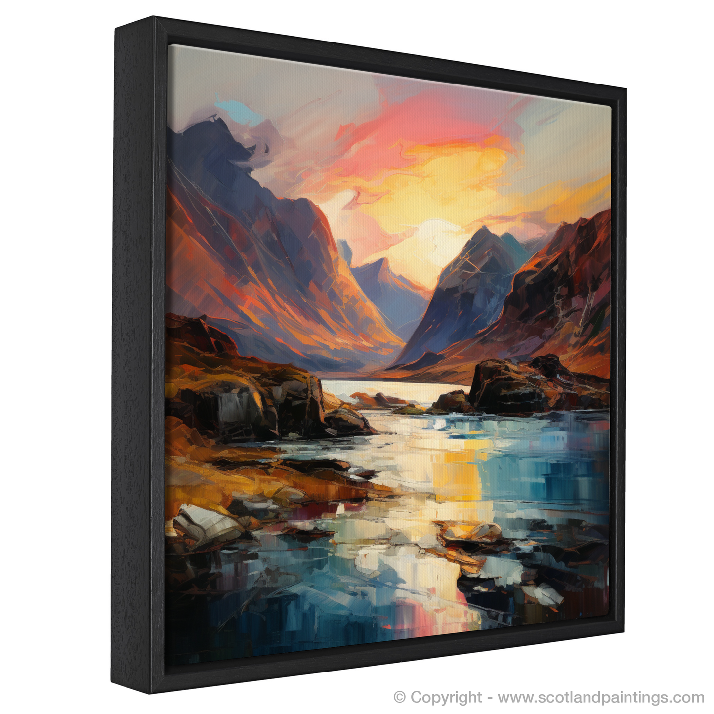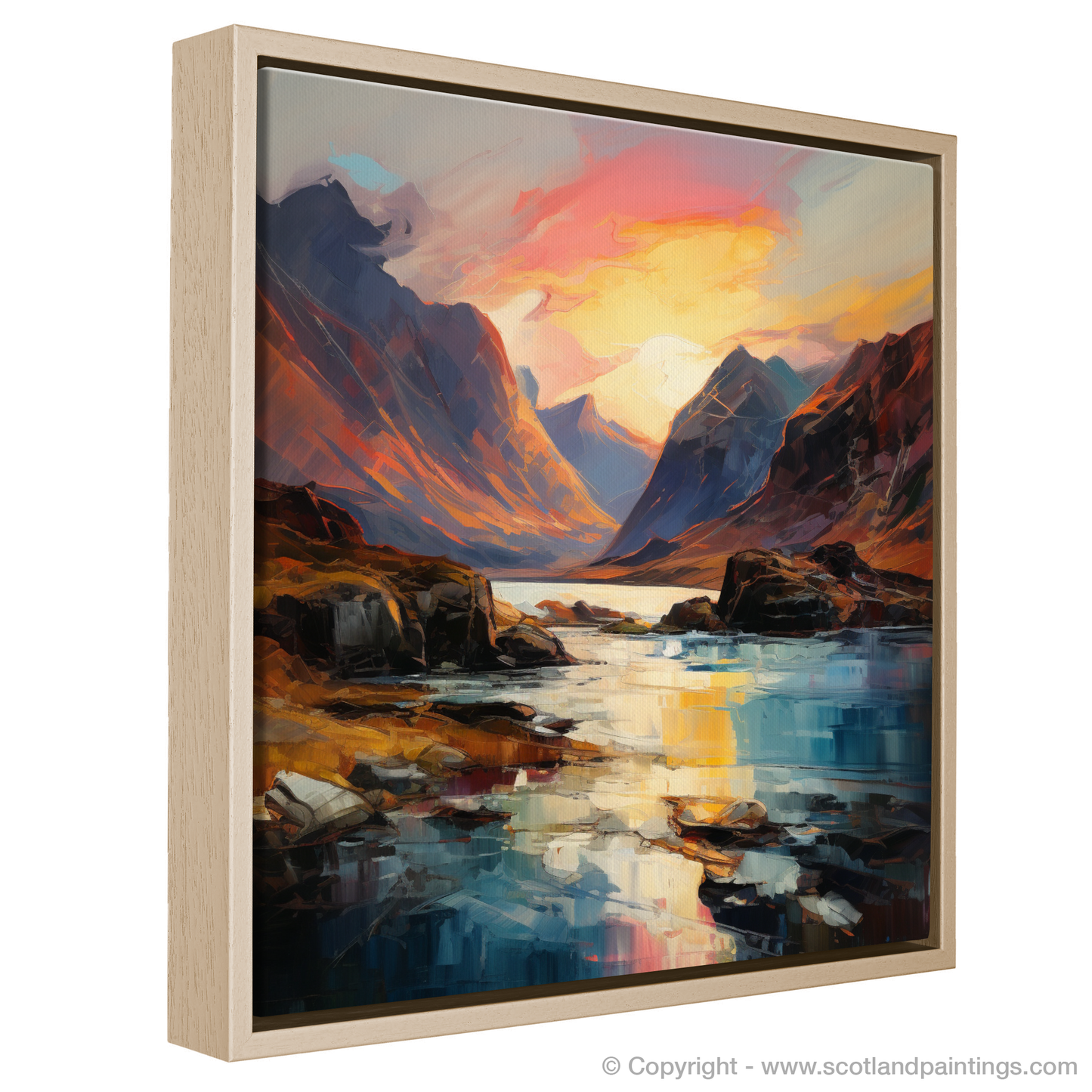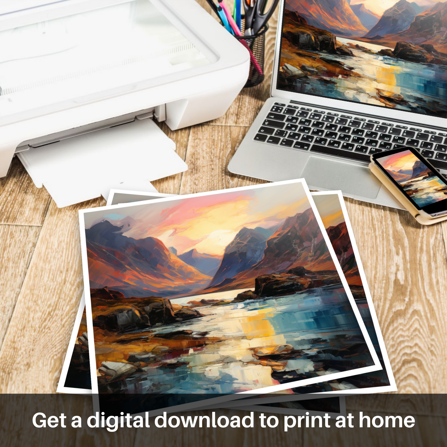 Captured within this striking expressionist print is the breath-taking grandeur of Loch Coruisk at the heart of the Scottish Highlands. The dynamic brushstrokes and vibrant colours evoke the raw emotion of nature's display as the sun sets behind the towering, rugged peaks that encase this secluded spot.