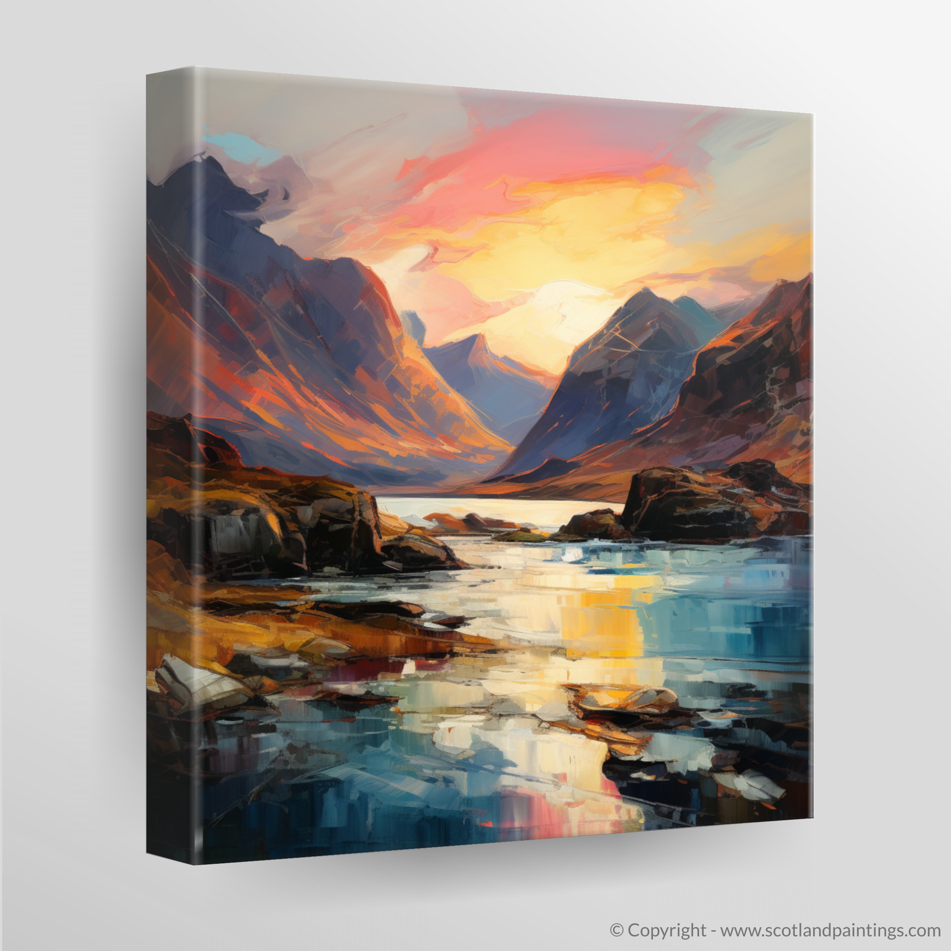 Painting and Art Print of Loch Coruisk at sunset entitled "Sunset Embrace at Loch Coruisk - An Expressionist Ode".