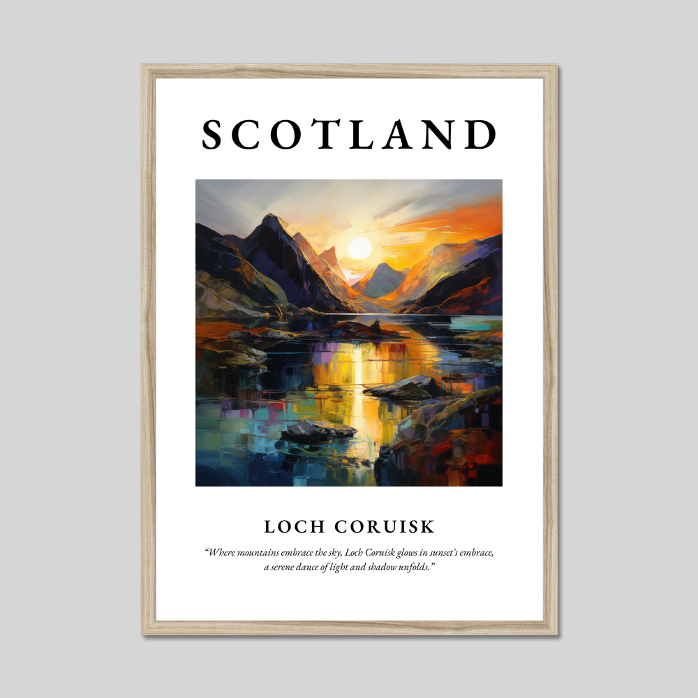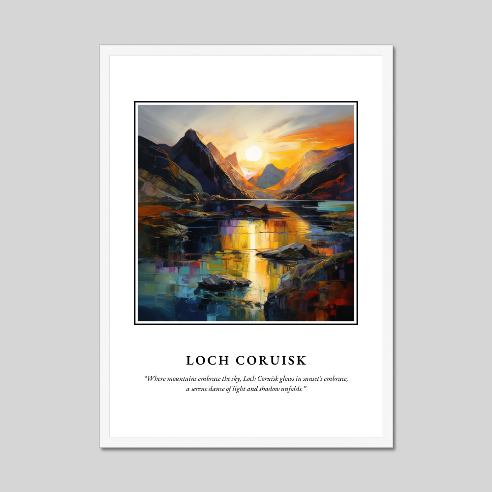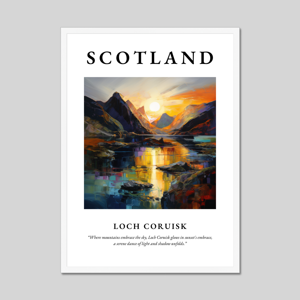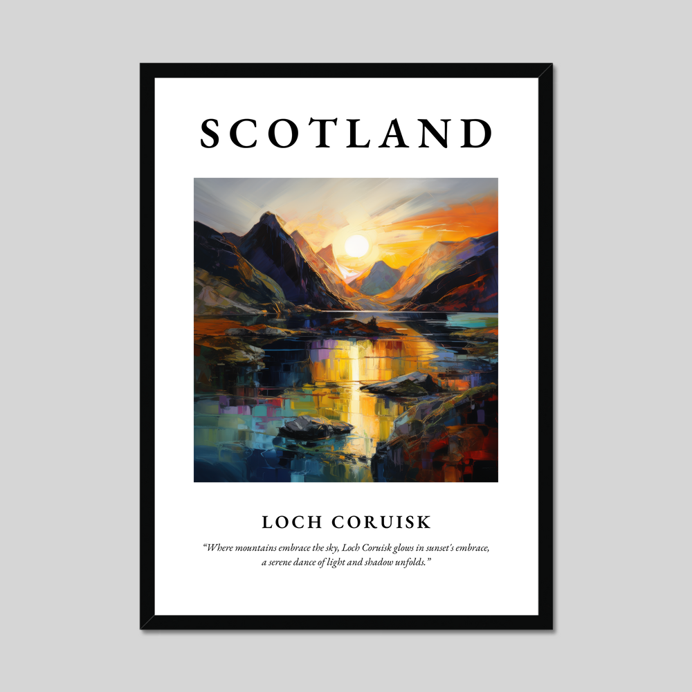 Underneath the artwork, a poetic quote gently beckons: “Where mountains embrace the sky, Loch Coruisk glows in sunset's embrace, a serene dance of light and shadow unfolds.” This sentiment perfectly encapsulates the mystical allure of Loch Coruisk, making this poster an ideal choice for anyone who cherishes Scotland—whether you’ve visited the locale, have a personal connection, or simply admire expressive art that evokes powerful emotions.