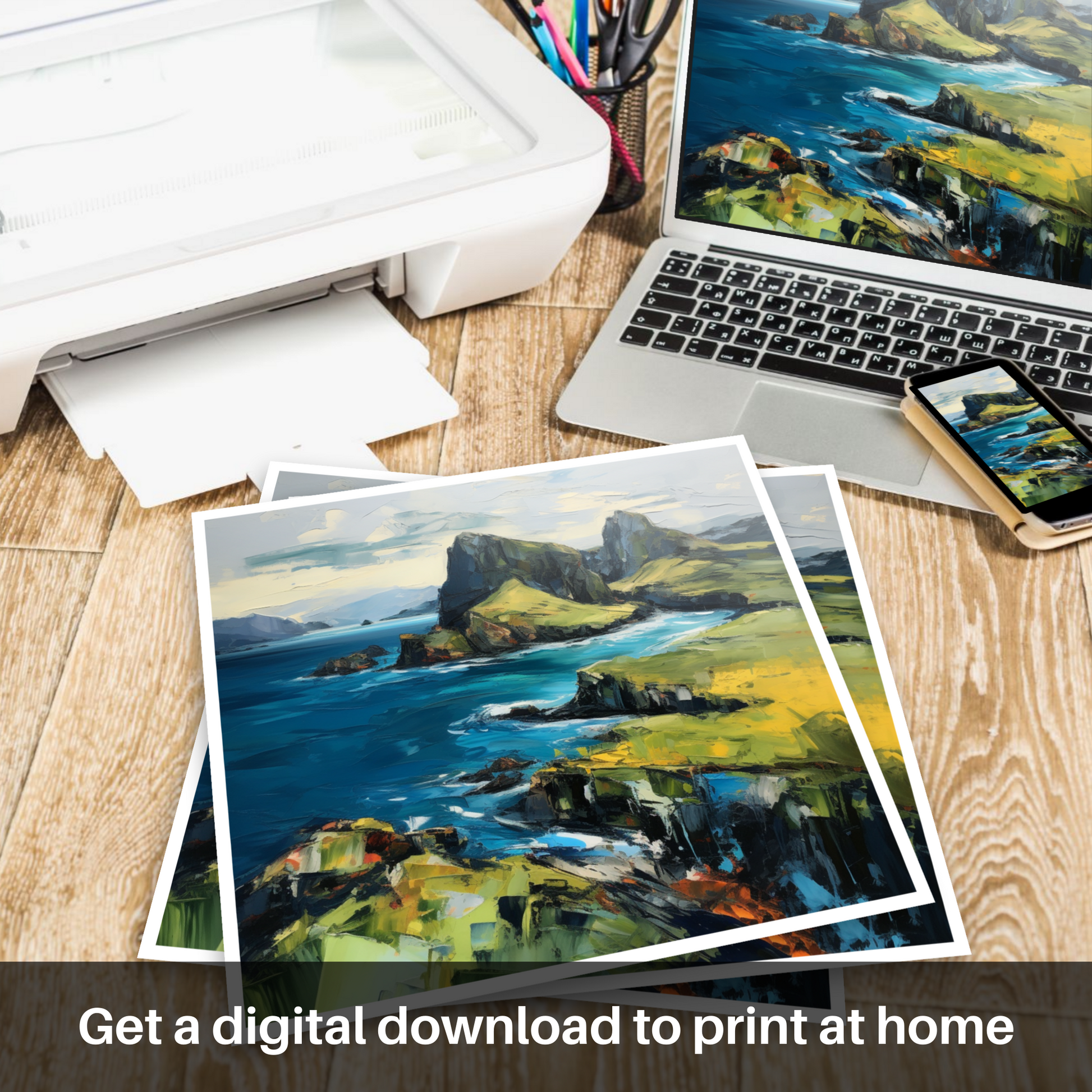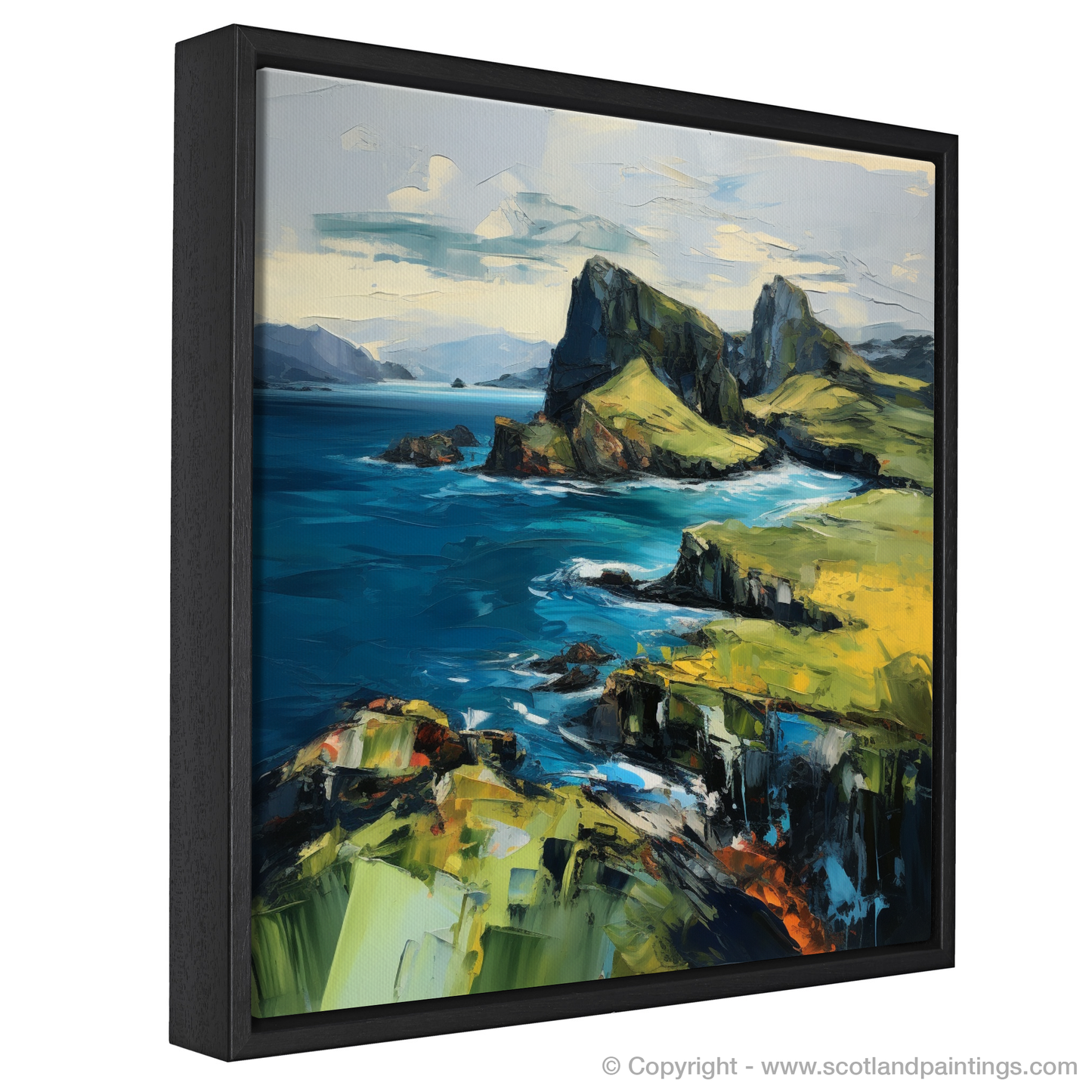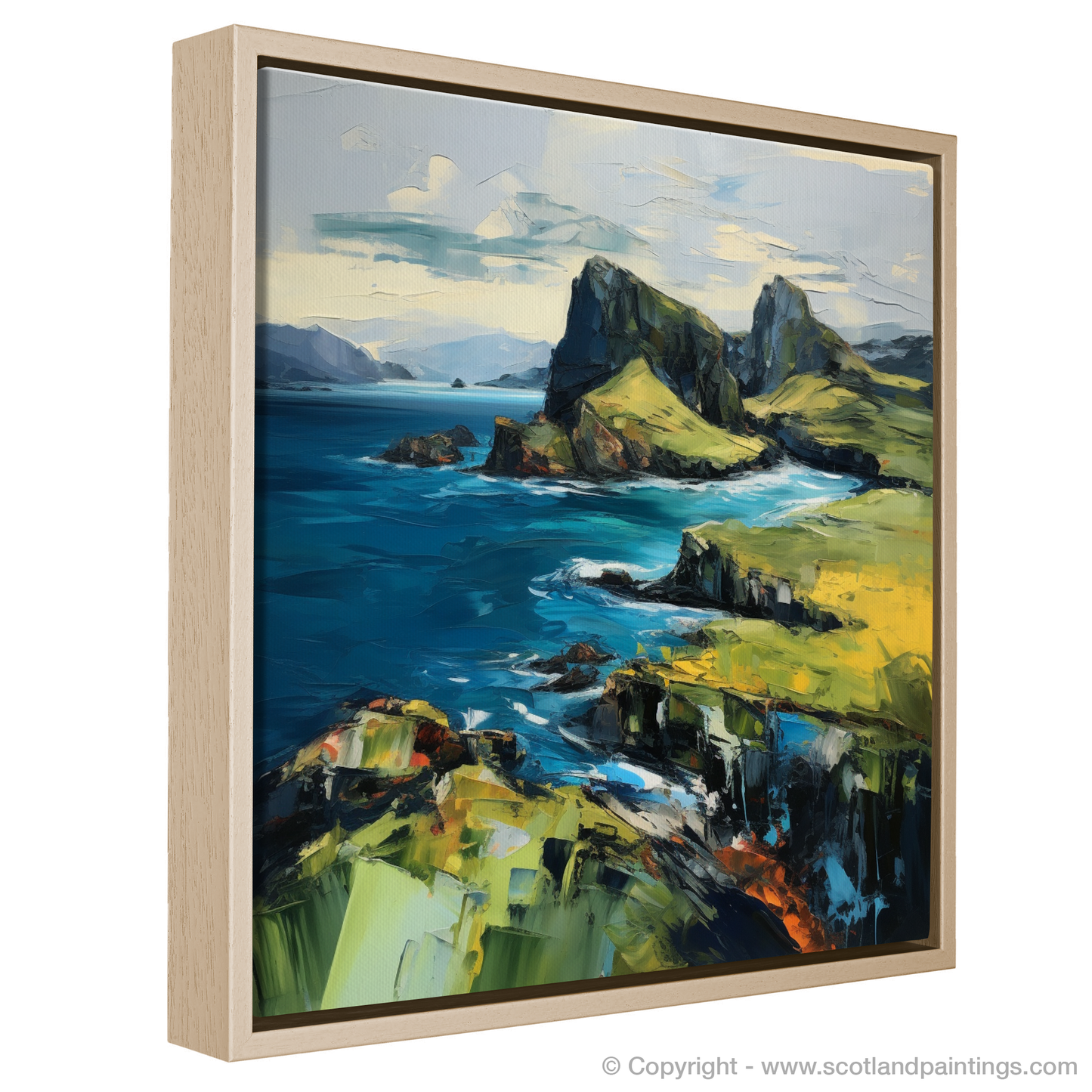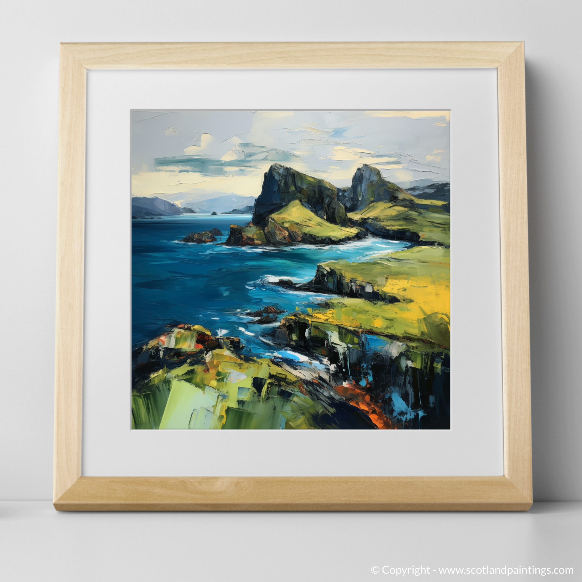 This captivating piece, part of our 'Scottish Islands' collection, evokes the raw and enchanting beauty of the Isle of Skye's smaller isles in the Inner Hebrides. Through the dynamic brushstrokes typical of Expressionism, the artist brings to life the vivid contrasts of land and sea, capturing the untamed spirit of this picturesque locale.