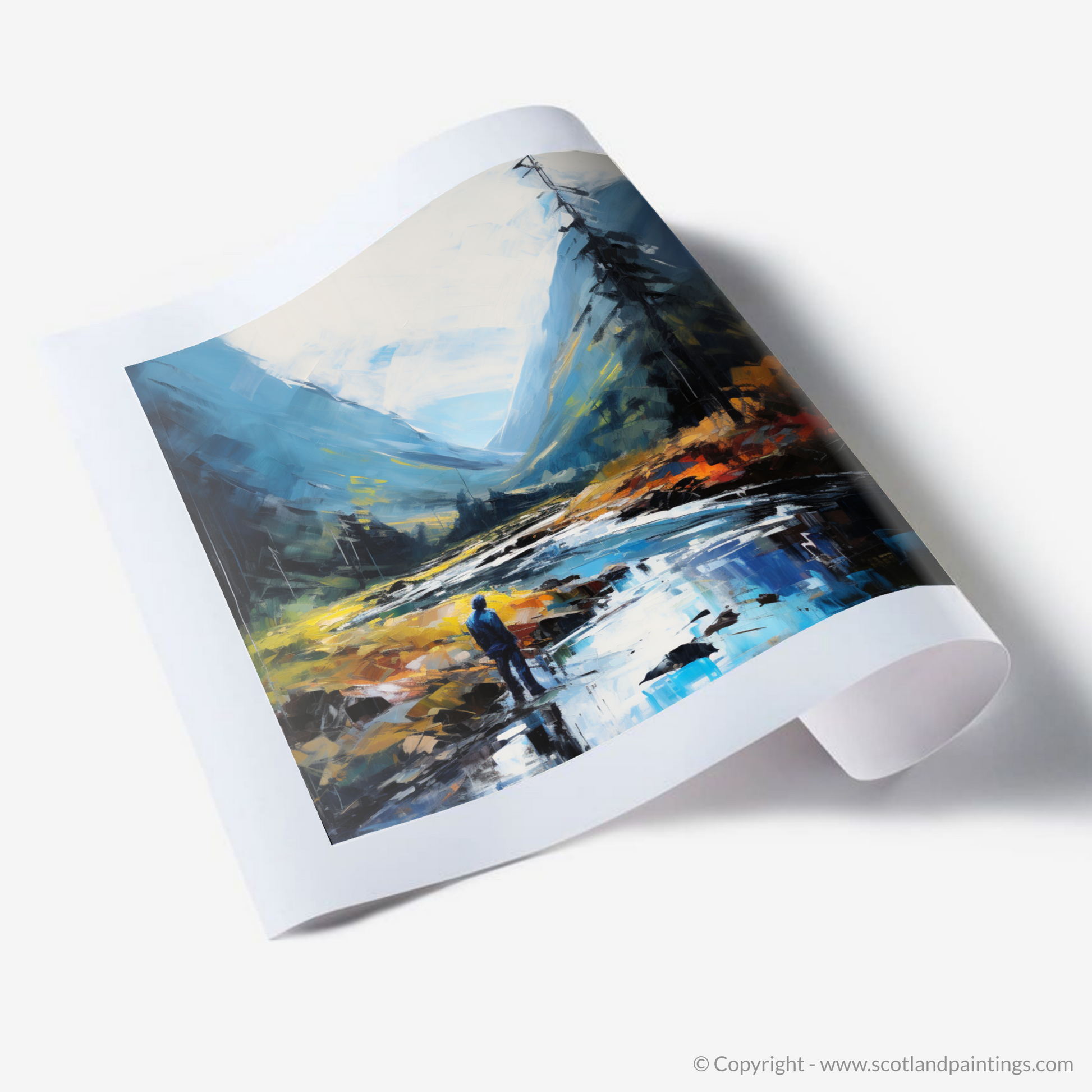 Captured within this evocative expressionist composition is a lone figure, standing contemplatively by the serene waters of River Coe, surrounded by the majestic ruggedness of Glencoe. The dynamic brushstrokes and rich palette infuse the landscape with a sense of movement and immediacy, reflecting the raw, untamed beauty of the Scottish Highlands.