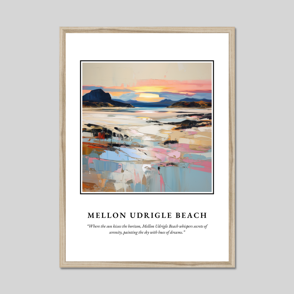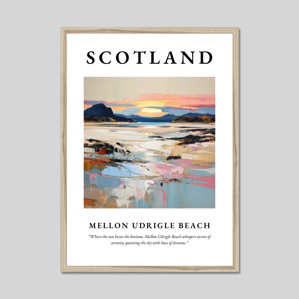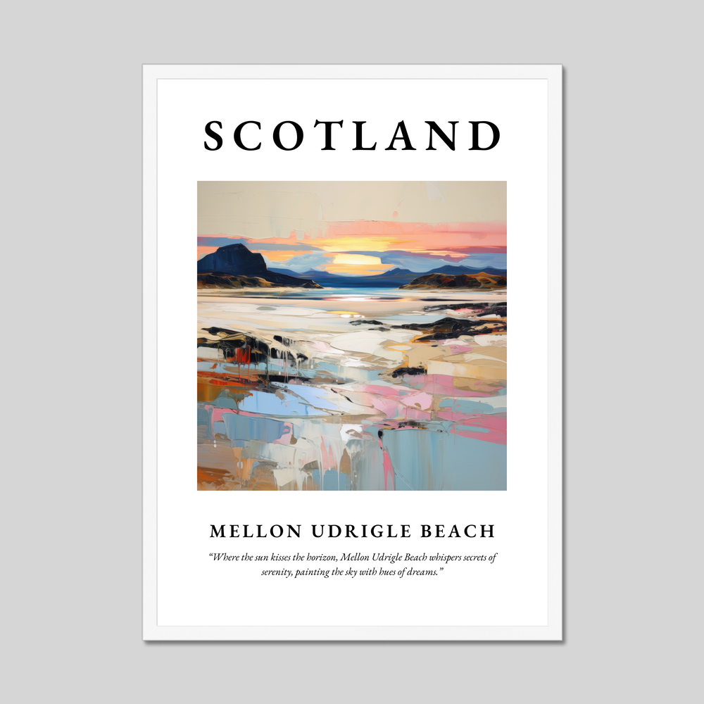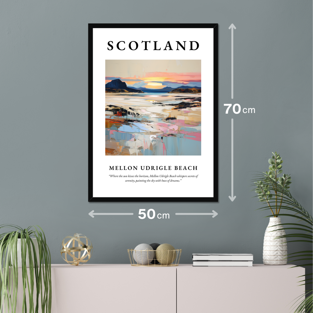 Immerse yourself in the breathtaking beauty of Scotland with our meticulously crafted framed poster of Mellon Udrigle Beach, measuring an impressive 50cm x 70cm. This piece from our "Scottish Coves" collection is more than just a depiction of a landscape; it’s an invitation to step into a realm where the sky is painted with the hues of dreams.