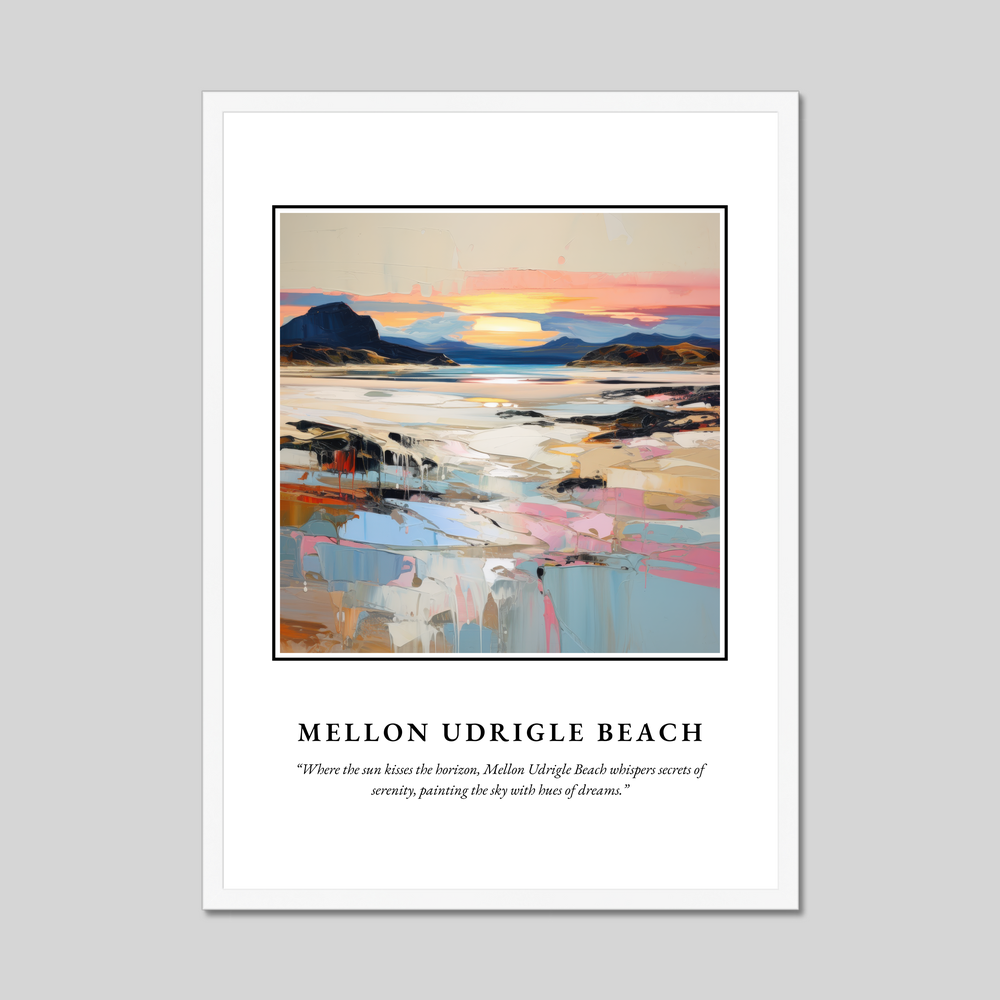 Mellon Udrigle Beach, nestled along the northwestern coast of Scotland, is a hidden gem known for its pristine sands and crystal-clear waters. The beach offers stunning views of the towering peaks of Suilven and Cùl Mòr, which are beautifully represented in the artwork. As the sun sets, the sky transforms into a canvas of warm oranges and cool blues, echoing the vibrant strokes found in our poster.