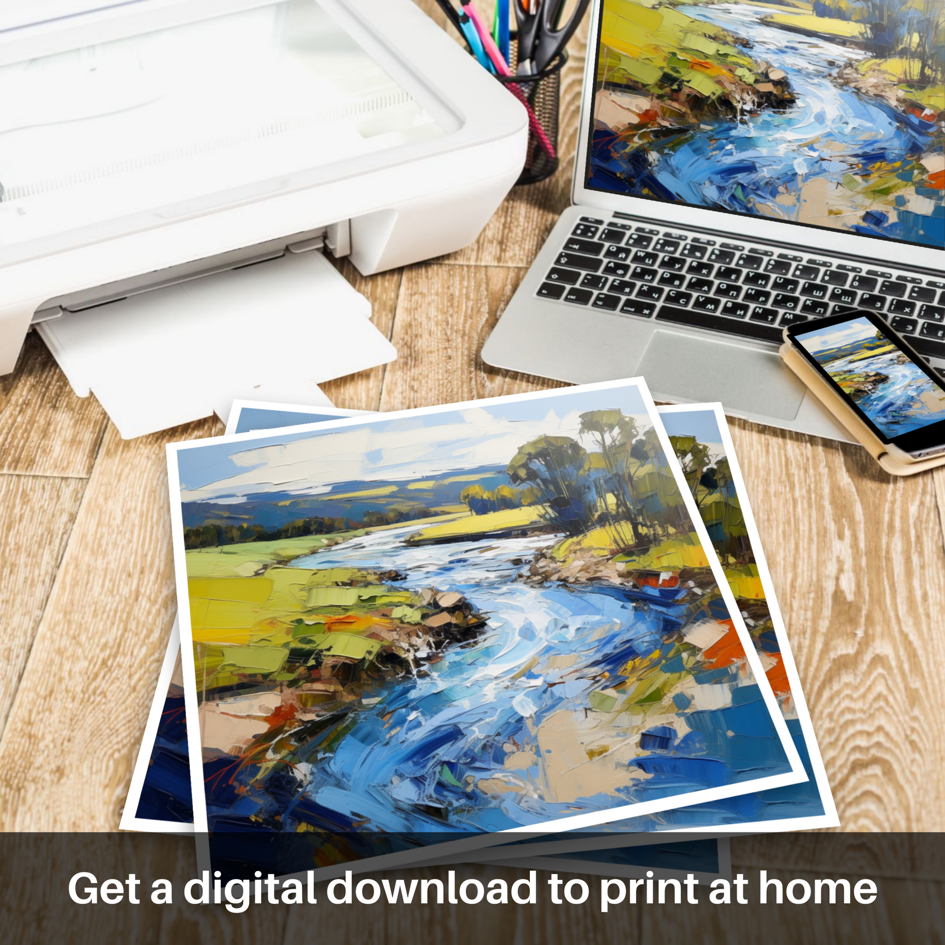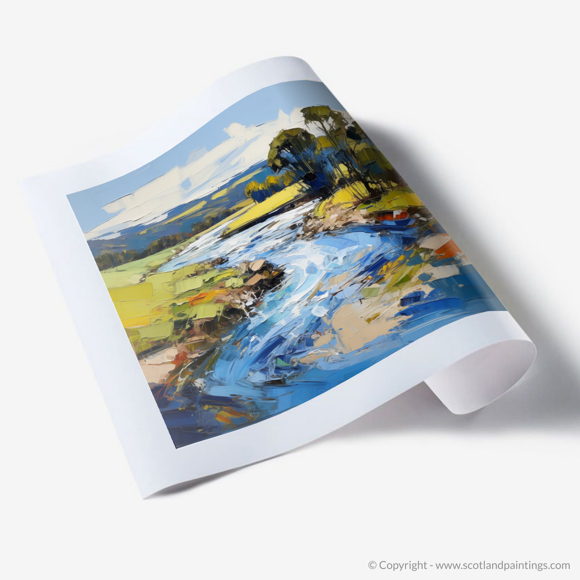 Capturing the vibrant spirit of Aberdeenshire's natural landscape, this striking print is a celebration of the River Deveron's dynamic beauty. The piece is bathed in an array of colours, with bold strokes and an arresting execution that conveys the raw, untamed essence of the Scottish terrain.
