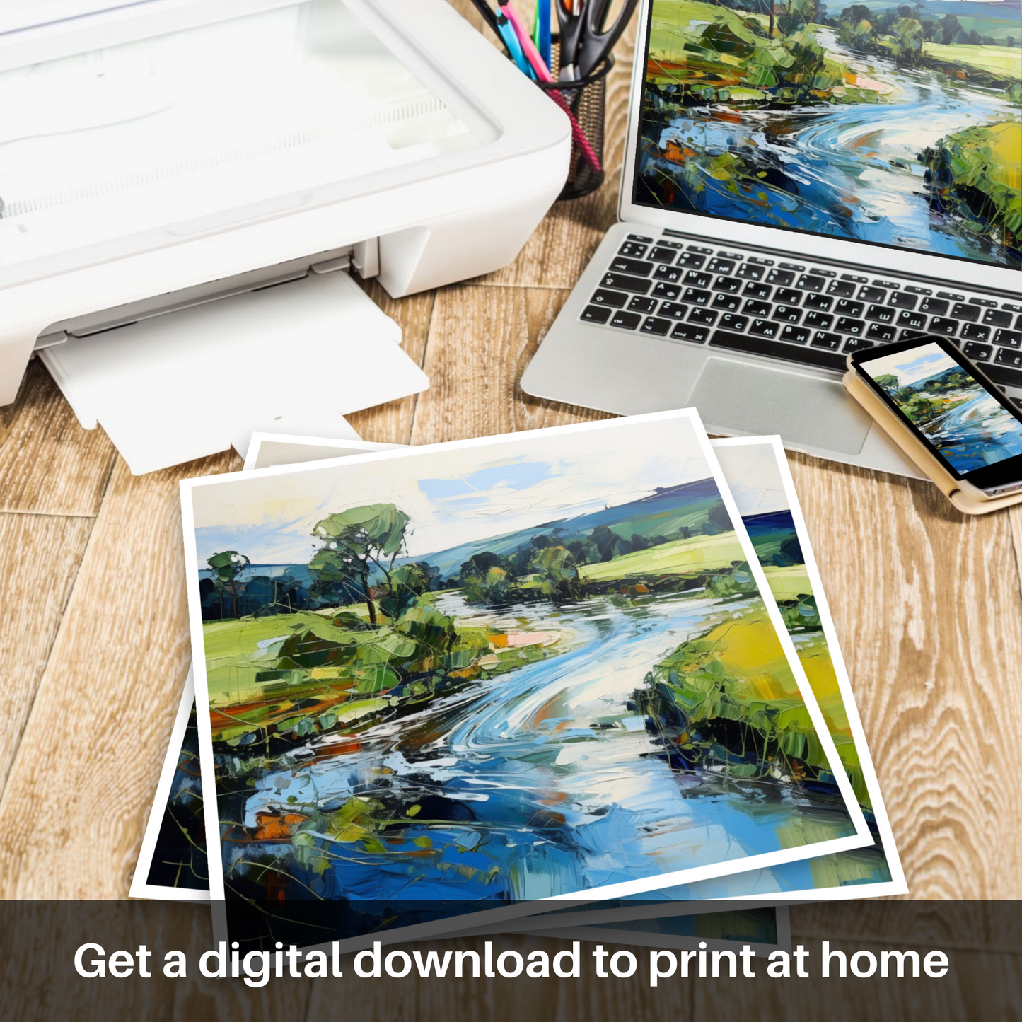 Embrace the captivating allure of one of Scotland's hidden gems with this entrancing expressionistic portrayal of the River Deveron in Aberdeenshire. The dynamic brushstrokes and vibrant palette invite observers into a serene yet animated landscape where the rush of water becomes a lively dance of blues and whites. Flashes of orange, green and yellow pepper the surrounding foliage, suggesting the wild, untamed beauty of nature.