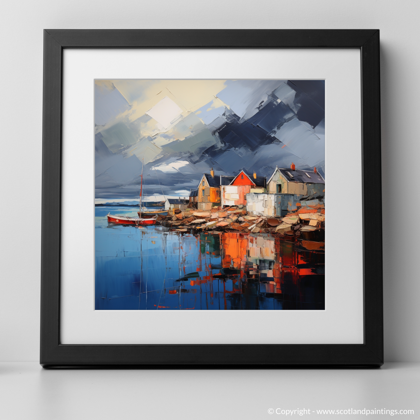 This captivating print draws its inspiration from the rugged beauty of Dunbar Harbour, depicted under a tempestuous sky. The essence of Expressionism breathes through every brushstroke, capturing the vivacity and emotional intensity of the coastal scene. Bold, sweeping strokes of dark blues and greys collide overhead, evoking the dramatic atmosphere of an impending storm.