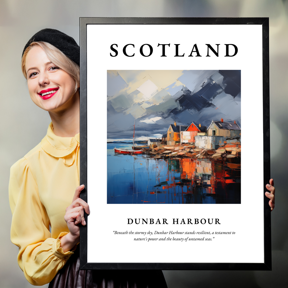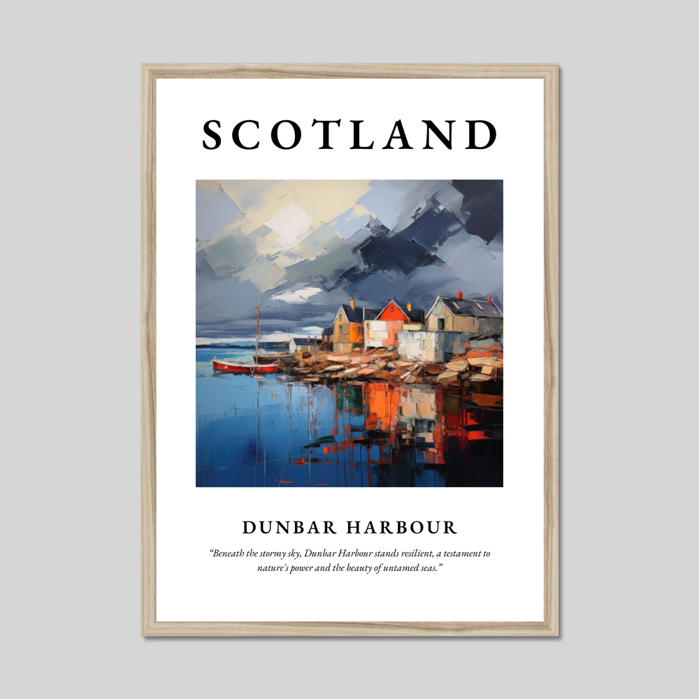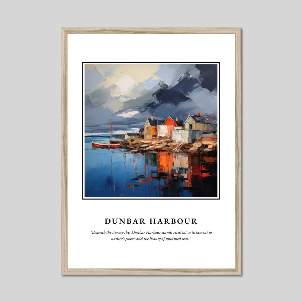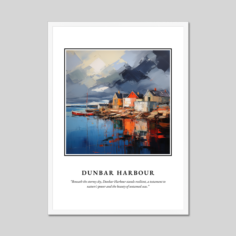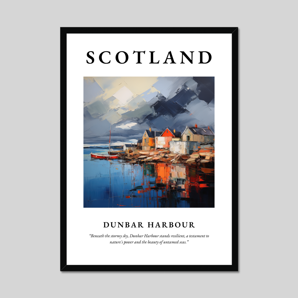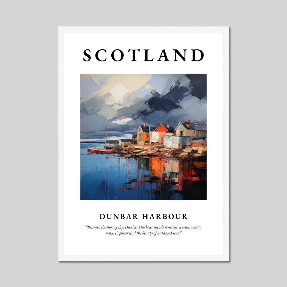 Available in sleek black, classic white, or a natural wood-effect frame, this artwork adapts easily to any decor, blending effortlessly into your environment while adding a touch of Scottish charm. The Expressionist style of the painting breathes life into the scene; evocative brushstrokes and rich, textured colours convey the vibrant energy and moodiness of Dunbar Harbour. Beneath the artwork, the quote captures the essence of this coastal wonder: “Beneath the stormy sky, Dunbar Harbour stands resilient, a testament to nature's power and the beauty of untamed seas.”