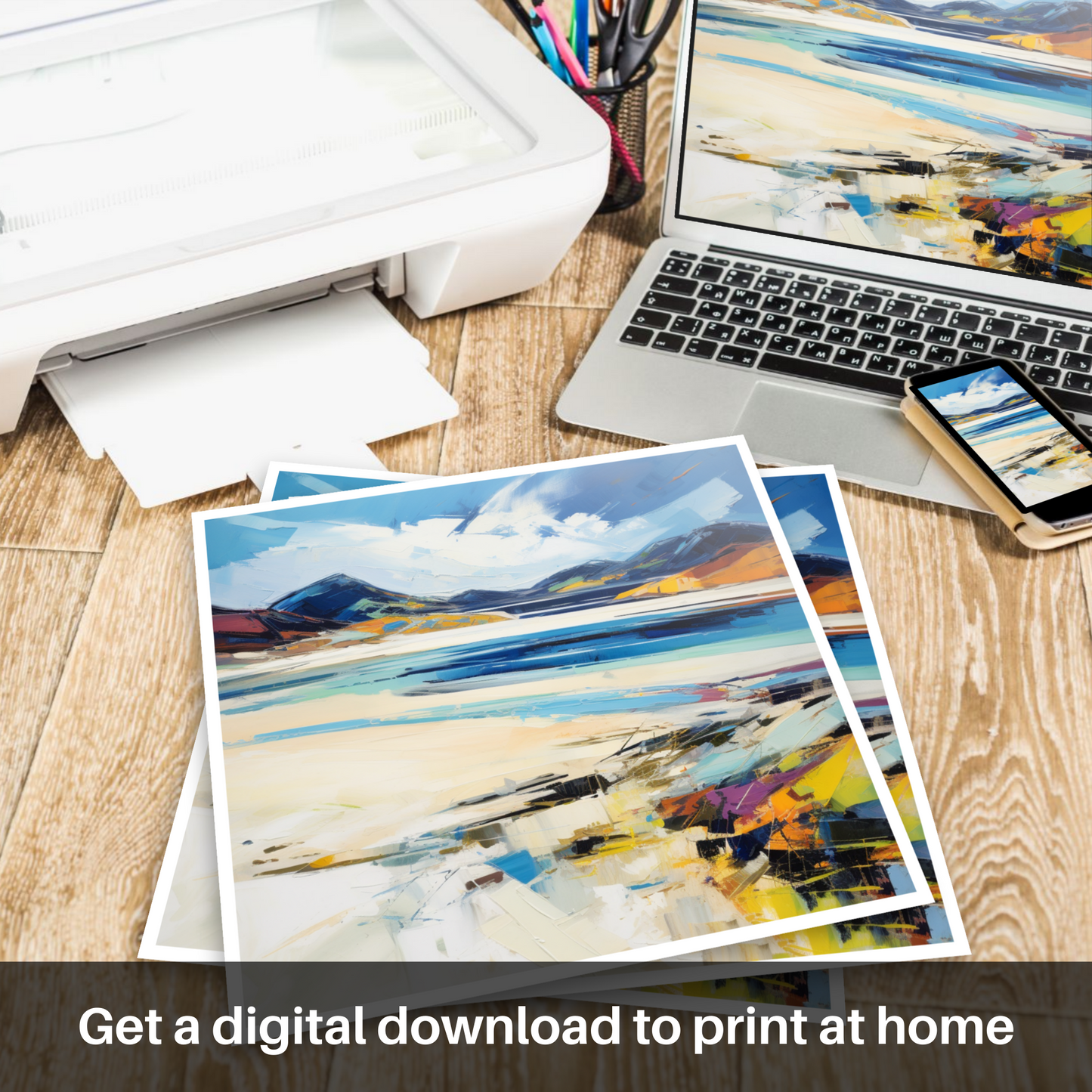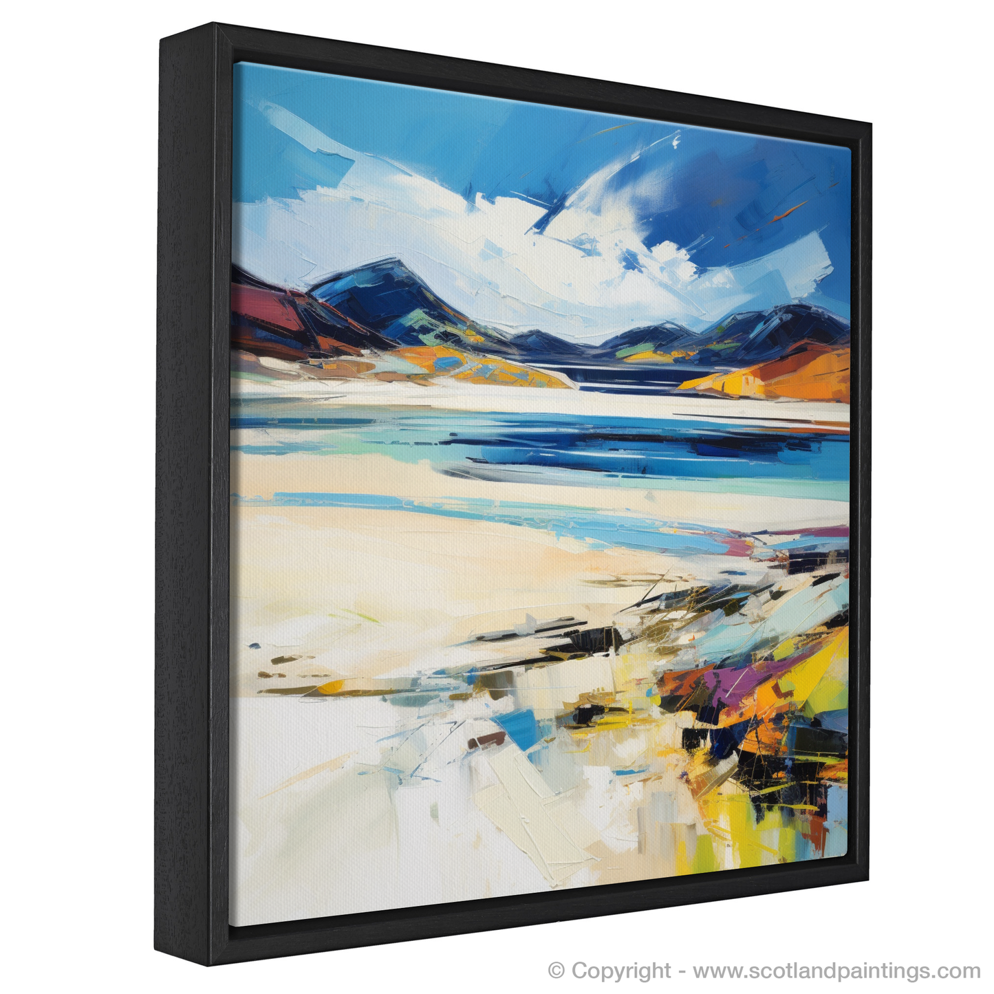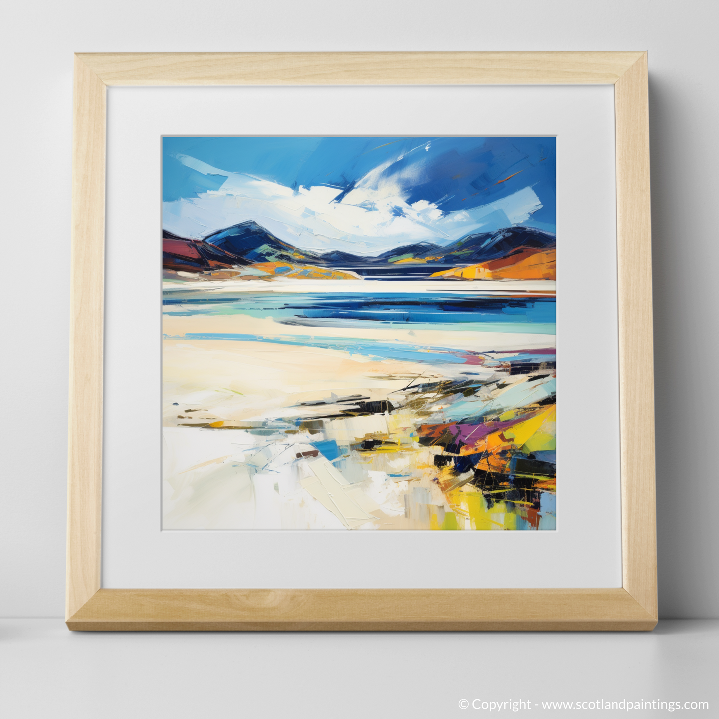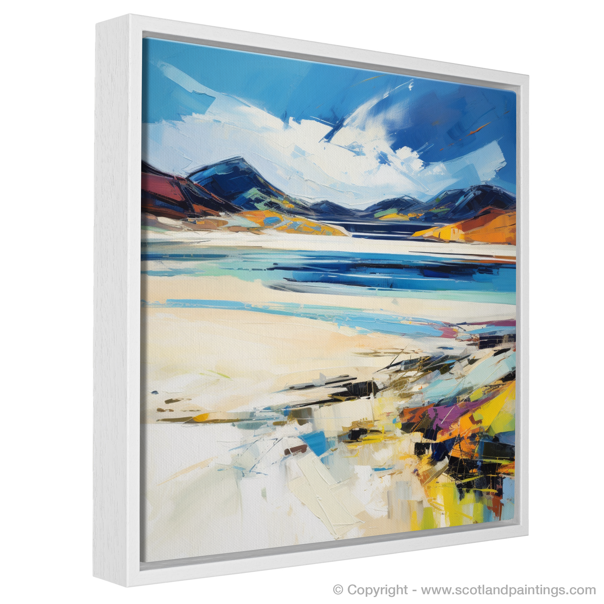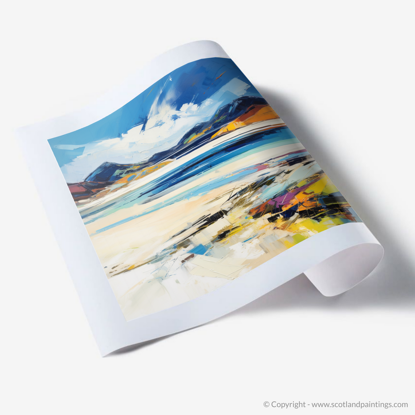 Captivating and vibrant, this expressive print offers a spirited interpretation of Luskentyre Sands, a treasured gem on the Isle of Lewis. The artwork embodies the raw and dynamic beauty of the Scottish coastline, with brisk, textured brushstrokes that evoke the untamed energy of the sea and the shifting skies above. Hues of azure and sapphire mingle with creamy whites and sandy beiges, mirroring the palette of the natural landscape, while vivid bursts of oranges and yellows suggest the warmth of sunlight kissing the dunes.