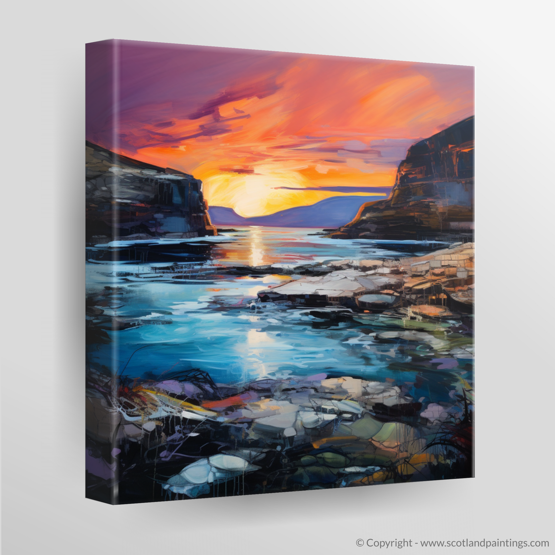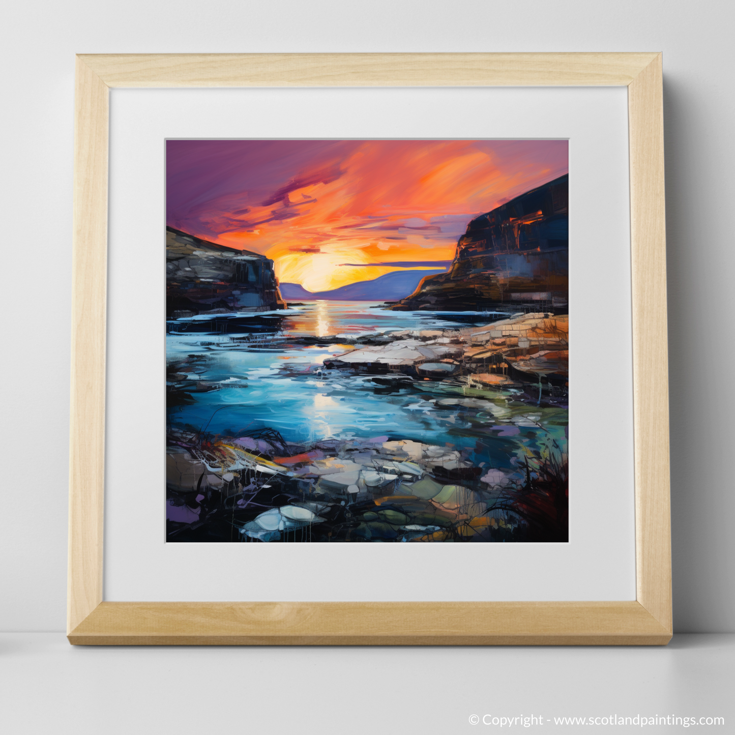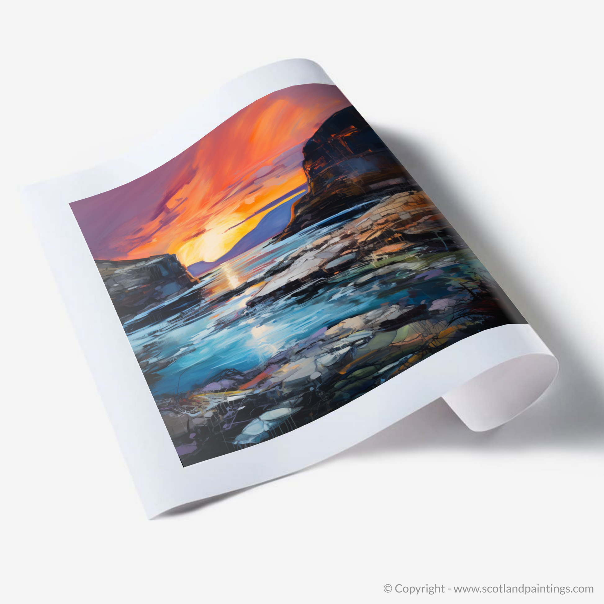 The dynamic use of colour and texture in this piece evokes the emotive power of the Expressionist tradition, bringing to life the wild, untamed beauty of the Scottish landscape. Whether it's the soothing blues and greens of the water or the stark contrast of the dark cliffs against the luminescent sky, this print promises to be a statement piece that transports its viewer to a place of natural splendour and dramatic allure, all from the comfort of their own home.