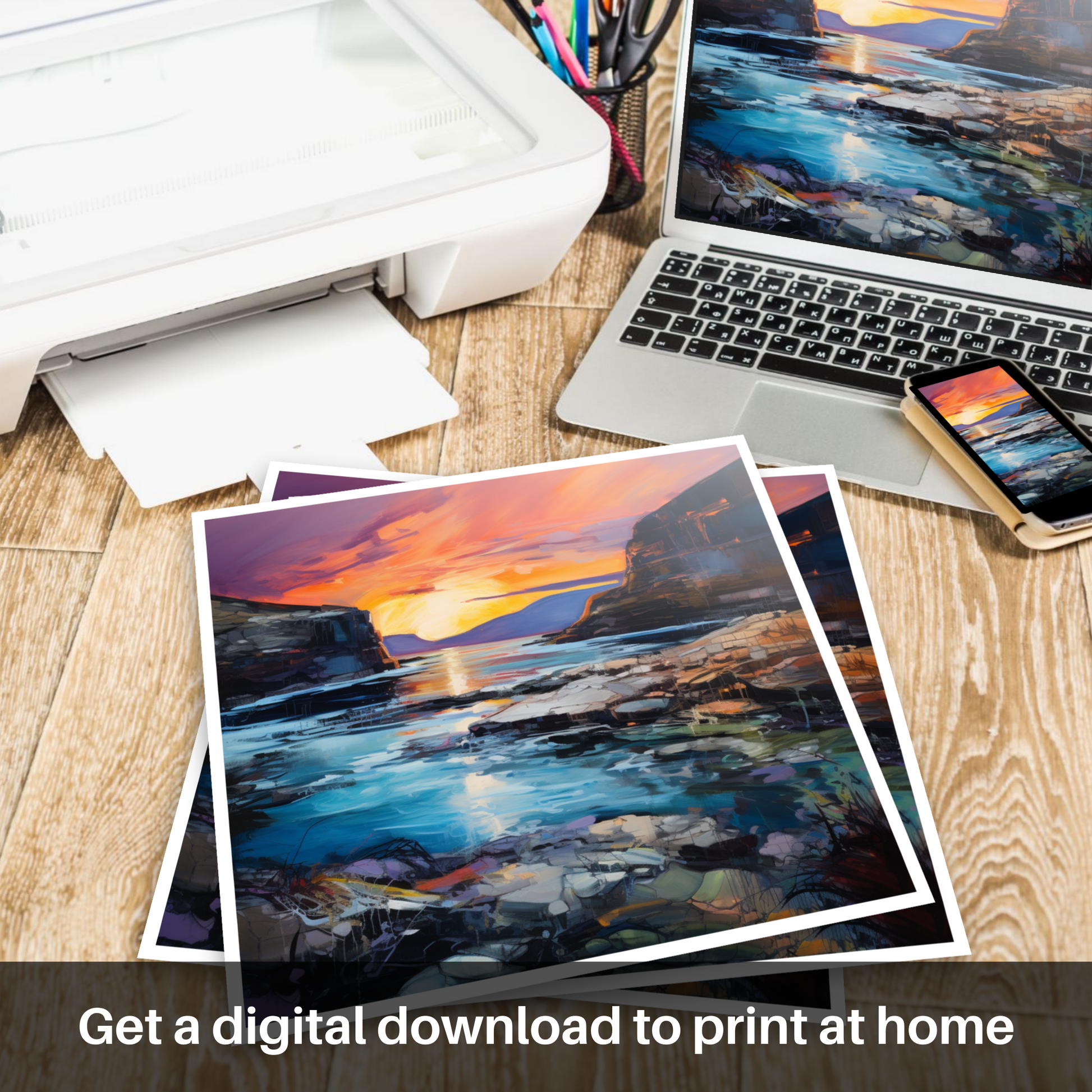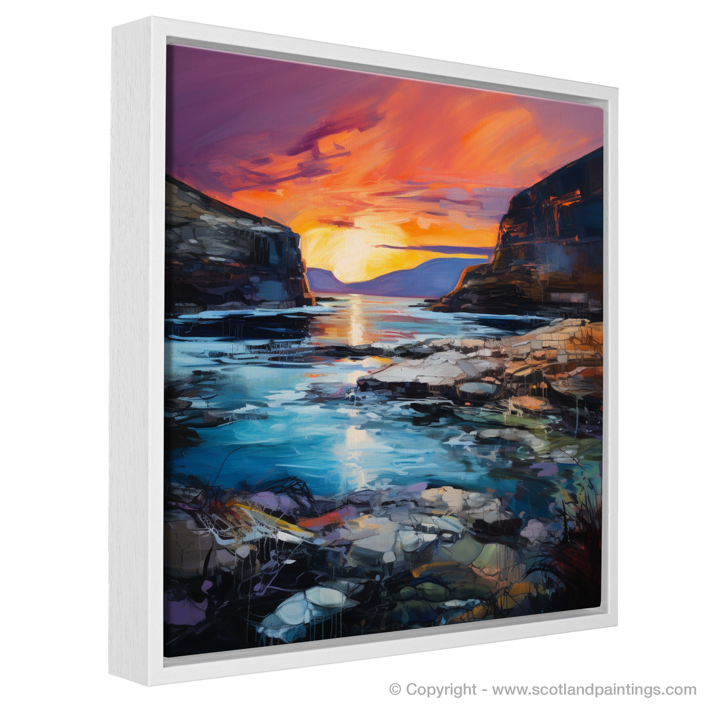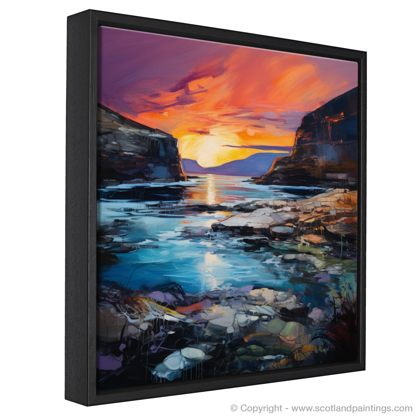 The dynamic use of colour and texture in this piece evokes the emotive power of the Expressionist tradition, bringing to life the wild, untamed beauty of the Scottish landscape. Whether it's the soothing blues and greens of the water or the stark contrast of the dark cliffs against the luminescent sky, this print promises to be a statement piece that transports its viewer to a place of natural splendour and dramatic allure, all from the comfort of their own home.