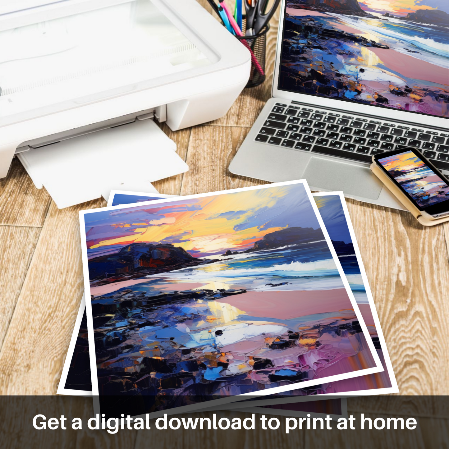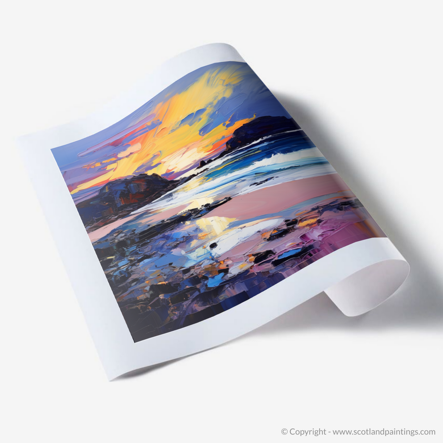 Capture the enchanting beauty of Seilebost Beach as dusk enfolds the sky in a dramatic interplay of colour and light with this evocative expressionist print. Bold brushstrokes in a symphony of vibrant hues depict the dynamic sky, ablaze with fiery oranges, deep purples, and radiant yellows that reflect poetically upon the wet sands below.