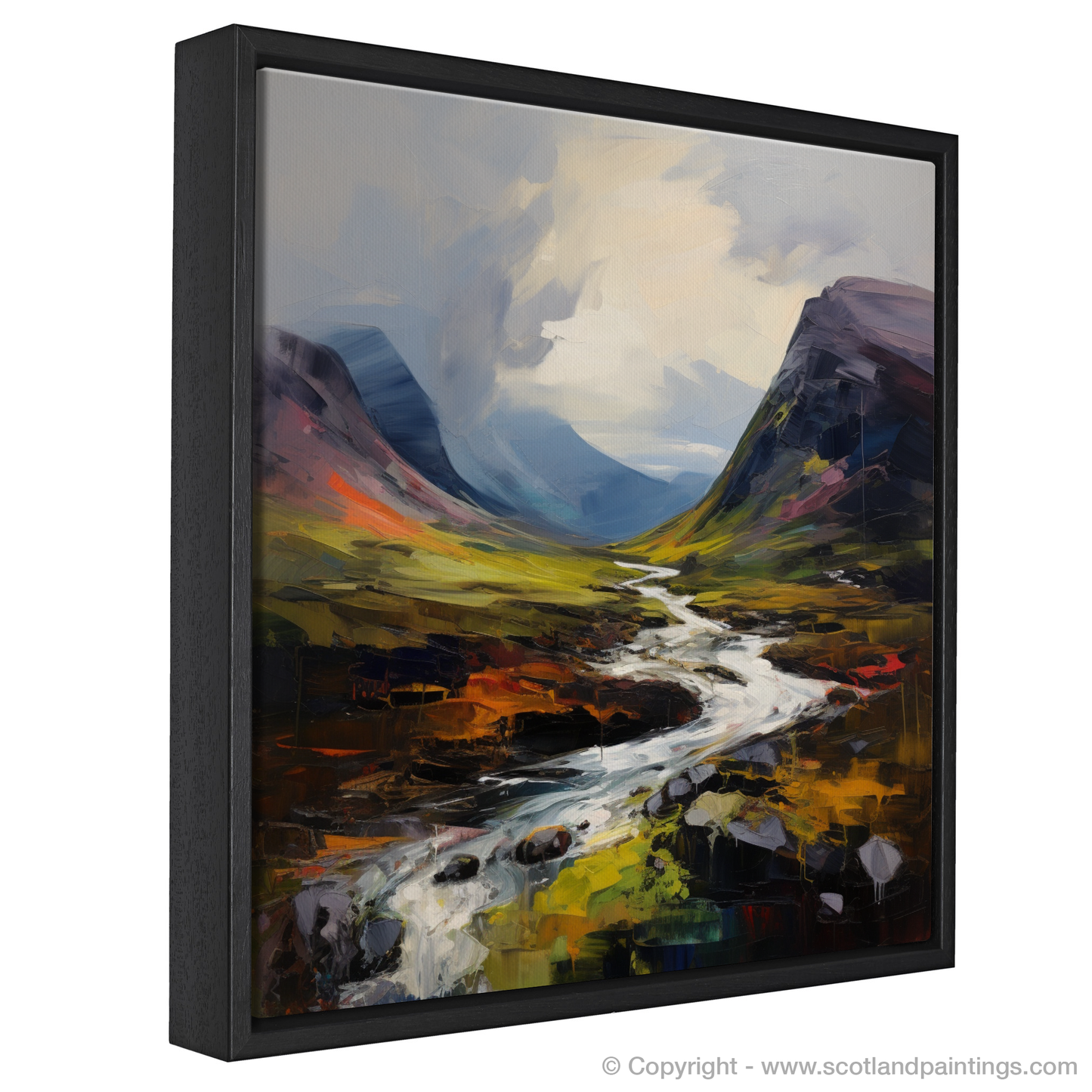 As you gaze upon the print, your eye is drawn to the energetic flow of a river, depicted with lively stokes of white and blue, meandering through a valley flanked by imposing mountains. The artist has masterfully employed a spectrum of colours to represent the Highland's rich tapestry of hues — with vivid greens, burnt oranges, and deep purples suggesting an otherworldly vista at a moment of transient light.