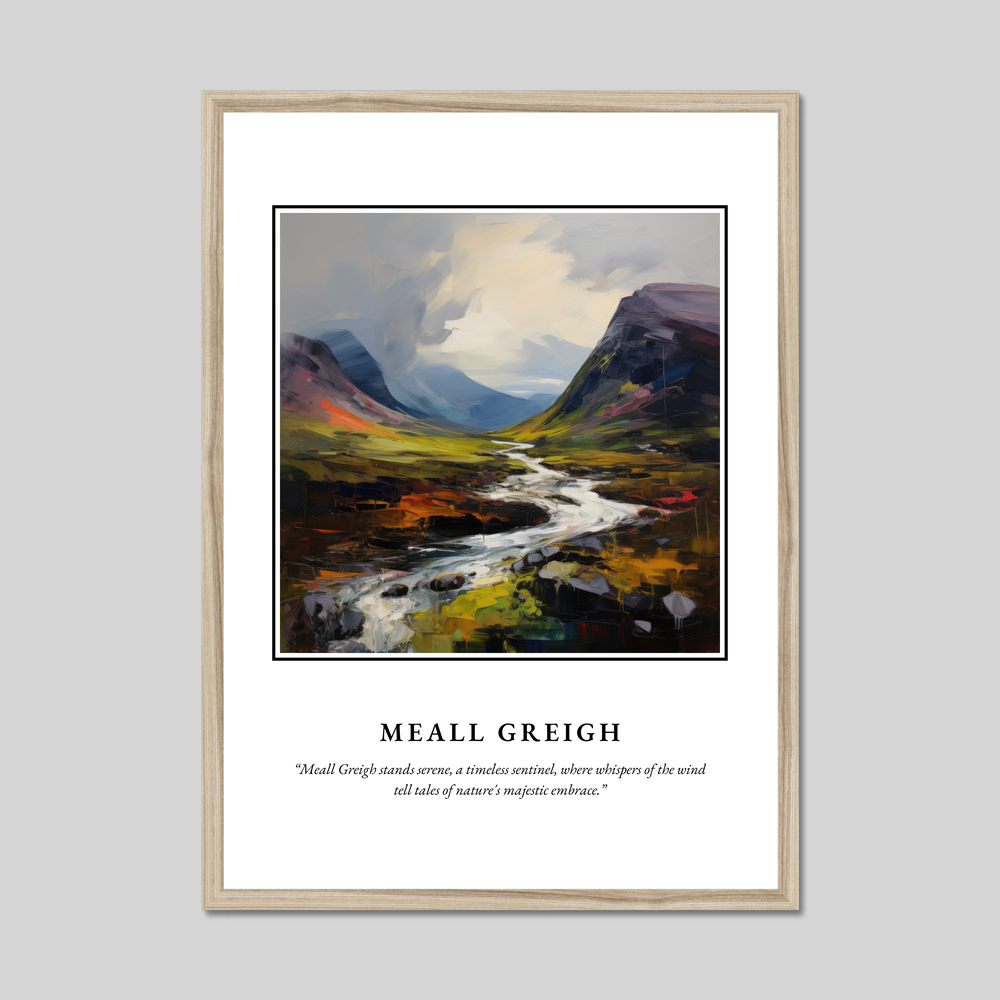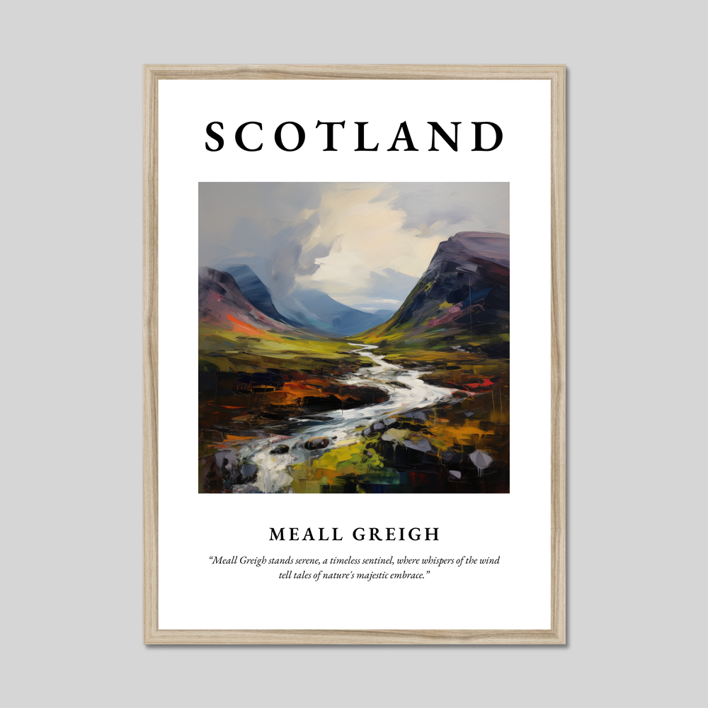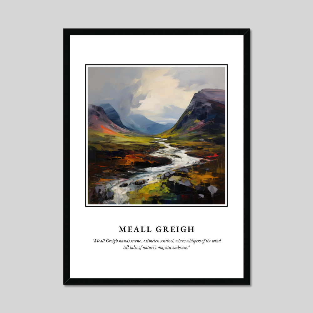 Rich with history and folklore, Meall Greigh offers panoramic views that extend over the surrounding landscapes, creating a perfect backdrop for stories of ancient clans and whispered legends. Whether you've stood atop its summit, gazed upon it from afar, or simply imagined its splendour, this framed poster invites you to hold a piece of Scotland's heart within your home.