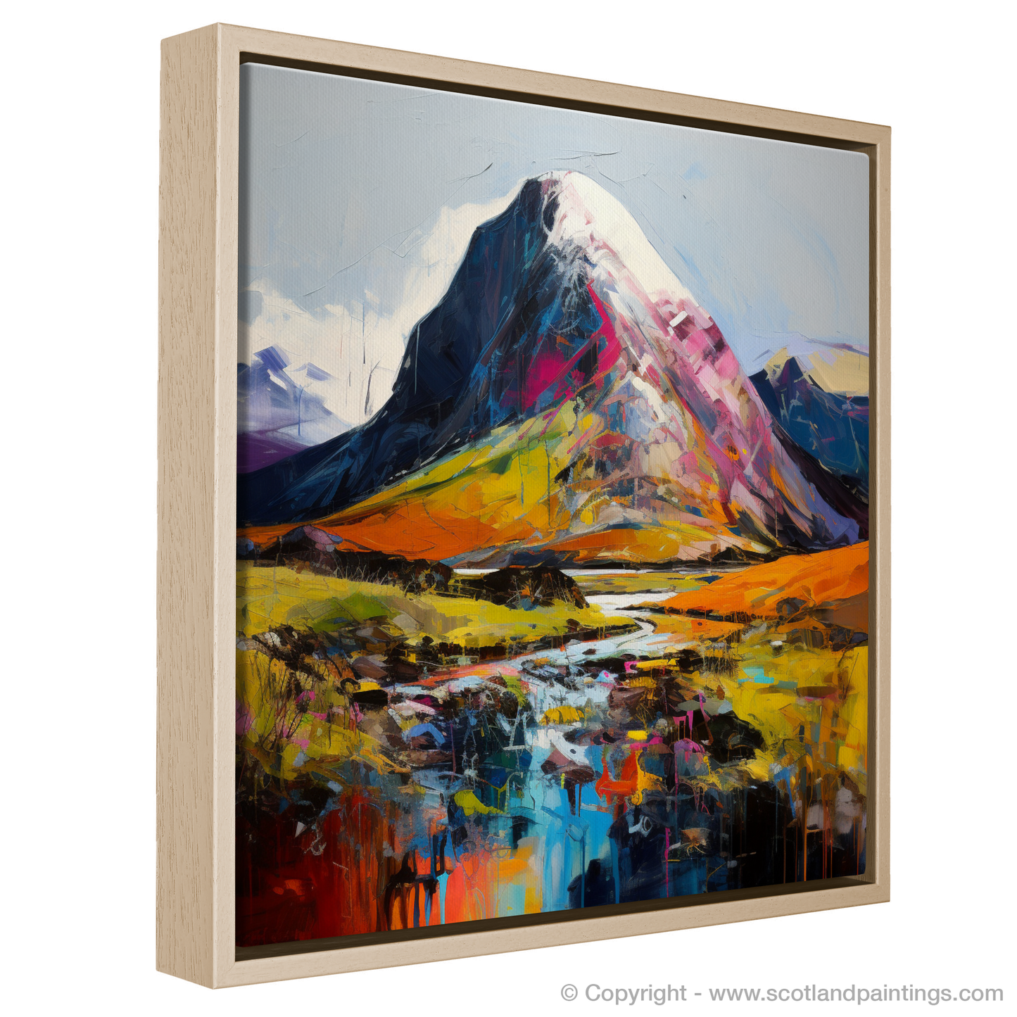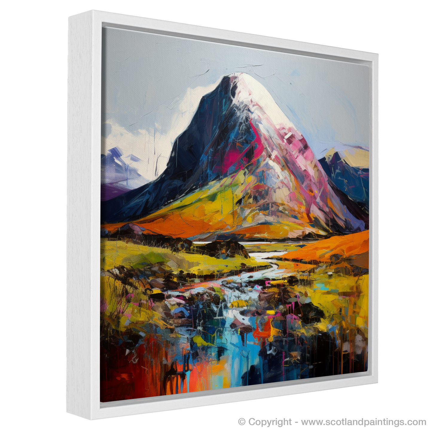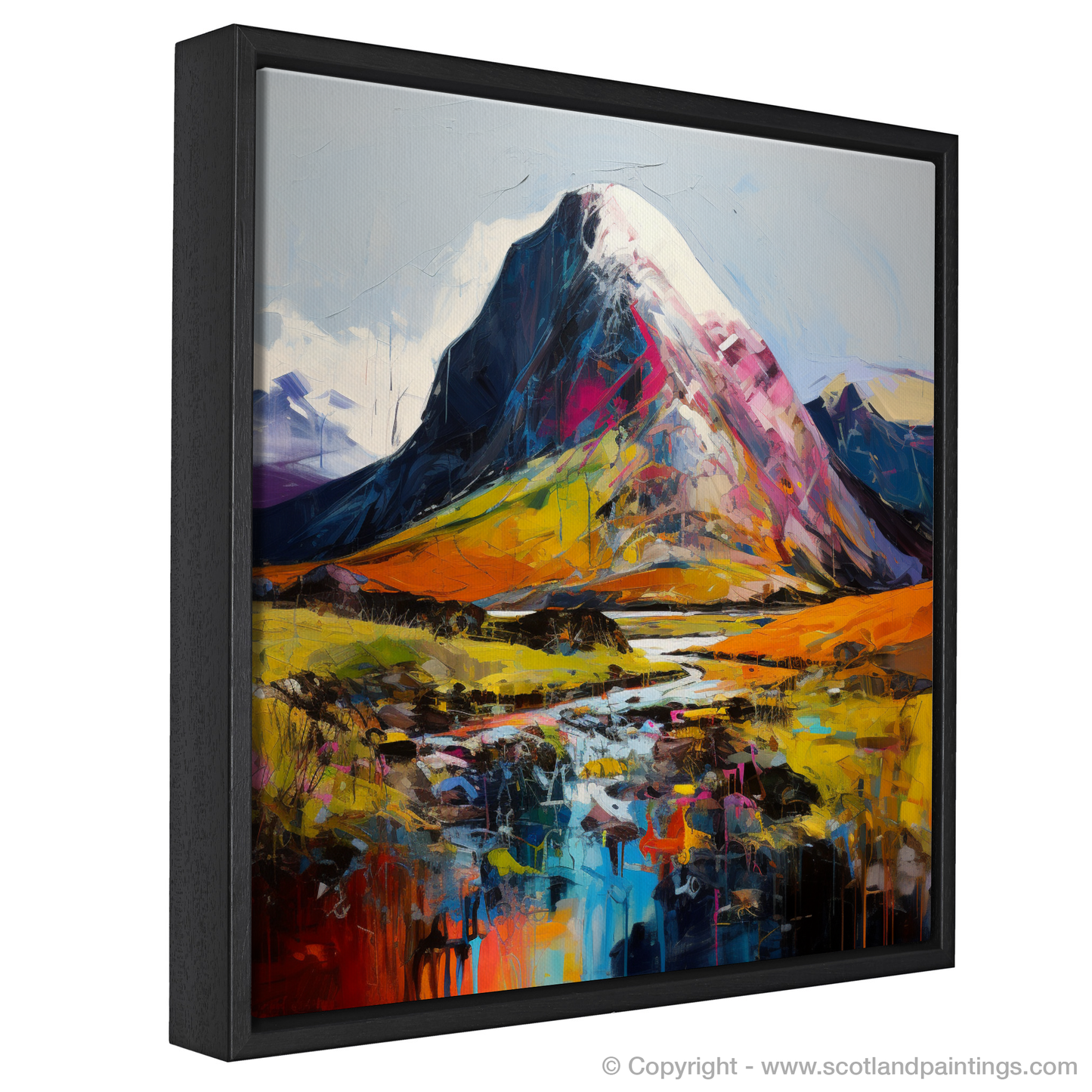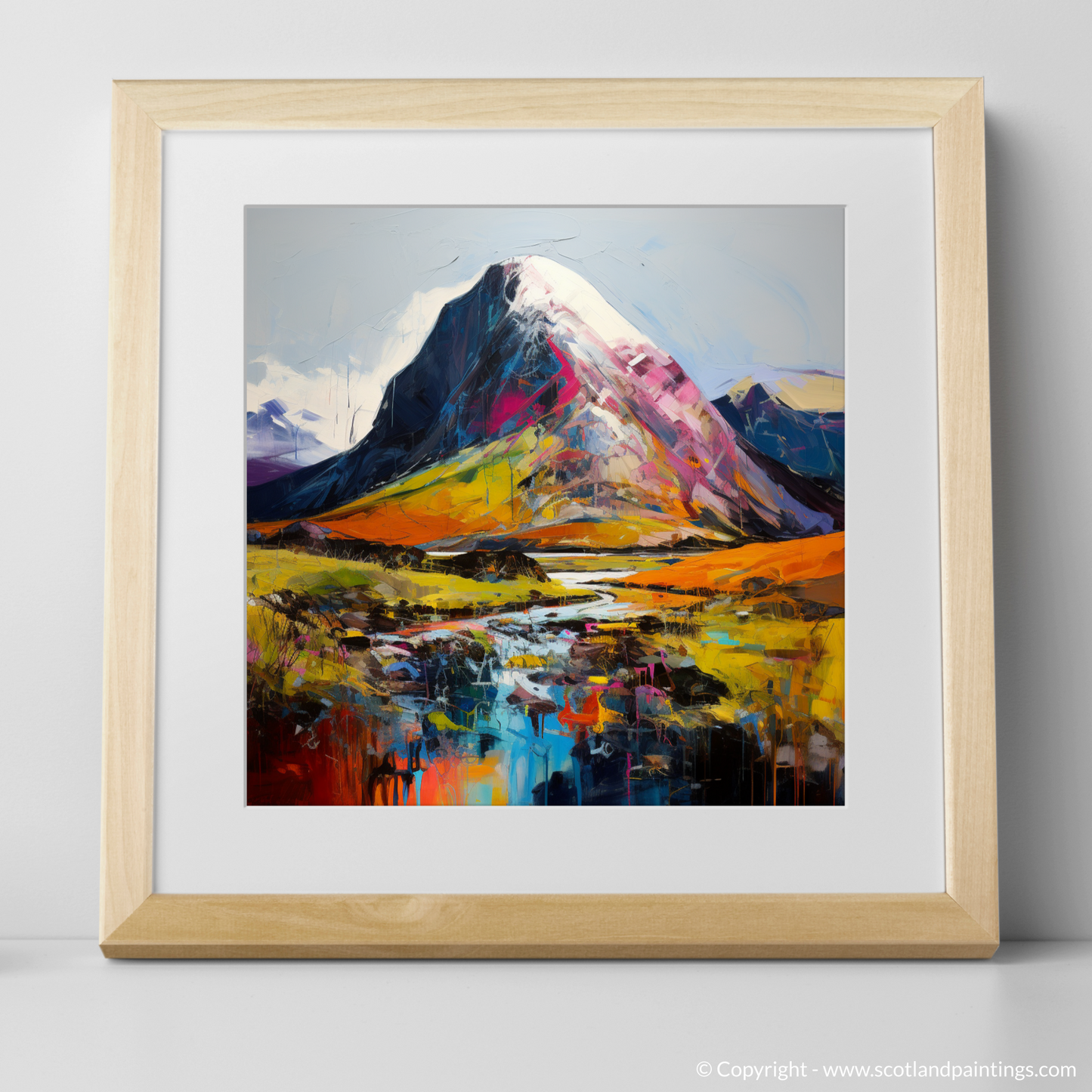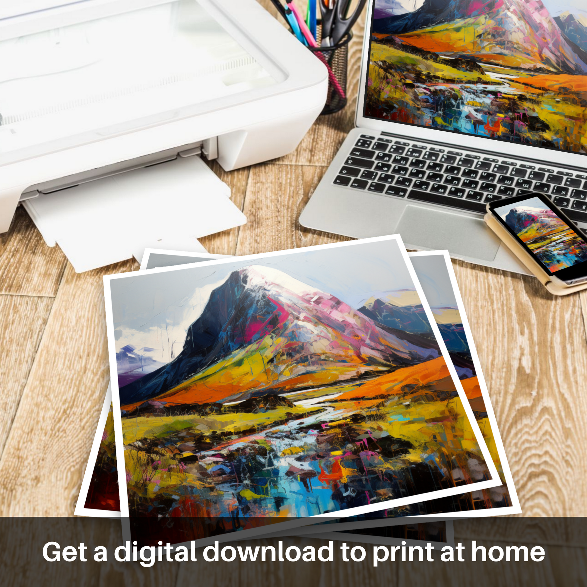Captivate your senses with this vibrant, expressionist interpretation of Ben Nevis, the jewel in the crown of the 'Scottish Munros'. This evocative piece captures the majesty of Scotland's highest peak with bold, impasto brushstrokes that lend a tactile texture to the canvas. The print explodes with a symphony of colour; strokes of electric blue, fiery orange, and bursts of fuchsia clash and contrast against the natural hues to evoke a feeling of wild, untamed beauty. The artist's perspective leads the eye across the golden, undulating moorland, past the meandering path of a reflecting river, toward the imposing mountain bathed in a powerful play of light and shadow.