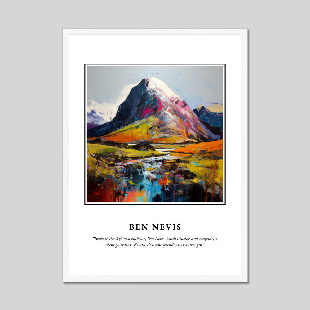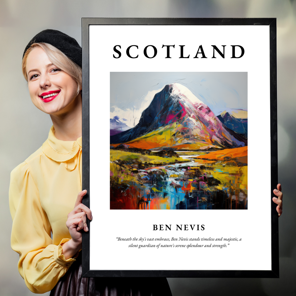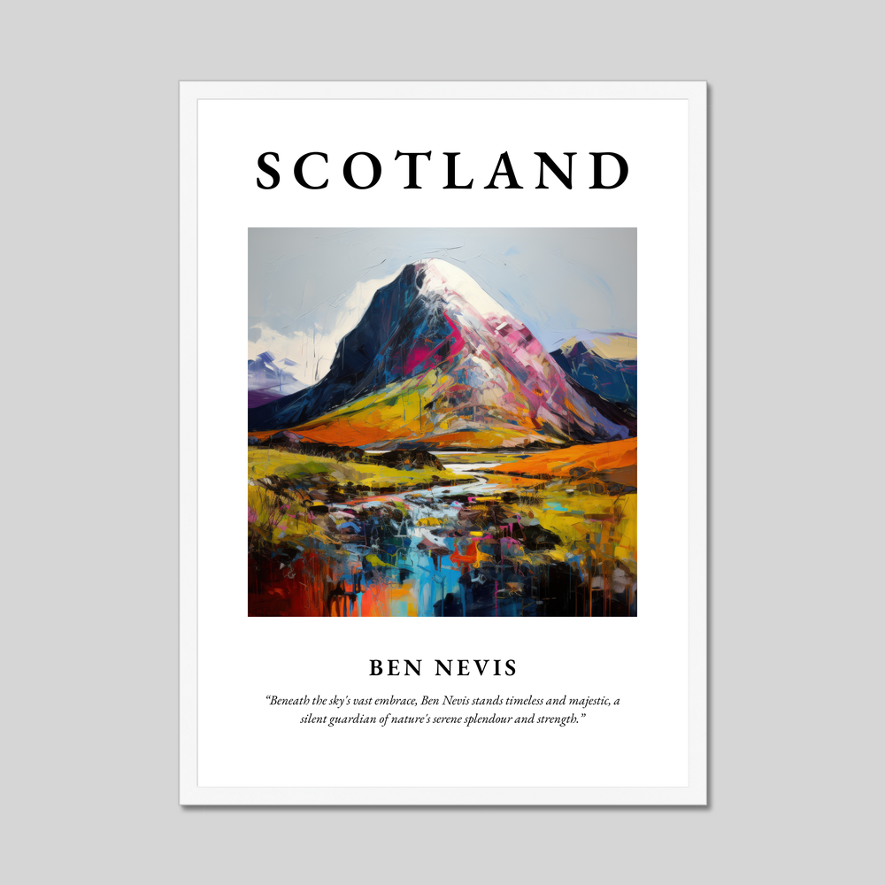 The word “SCOTLAND” boldly crowns this exquisite composition, immediately drawing the eye to the vibrant painting of Ben Nevis below. The artist's expressive brushstrokes capture the essence of this majestic peak, with a kaleidoscope of colours that breathe life into the landscape. The rich blues, greens, and fiery oranges create a dynamic interplay, imbuing the painting with a sense of movement and vitality. Beneath the breathtaking visual, the quote aptly captures the scene: “Beneath the sky's vast embrace, Ben Nevis stands timeless and majestic, a silent guardian of nature's serene splendour and strength.”