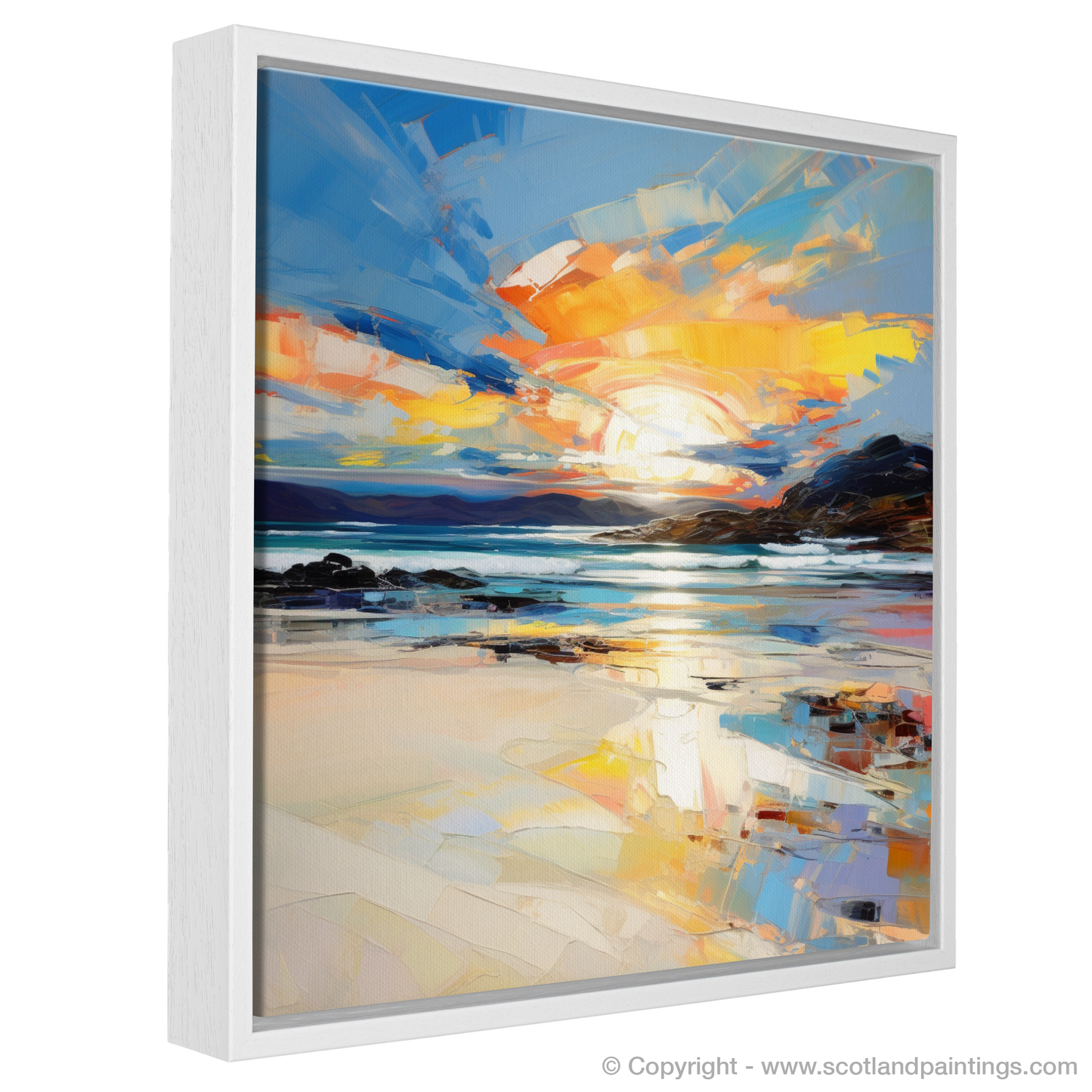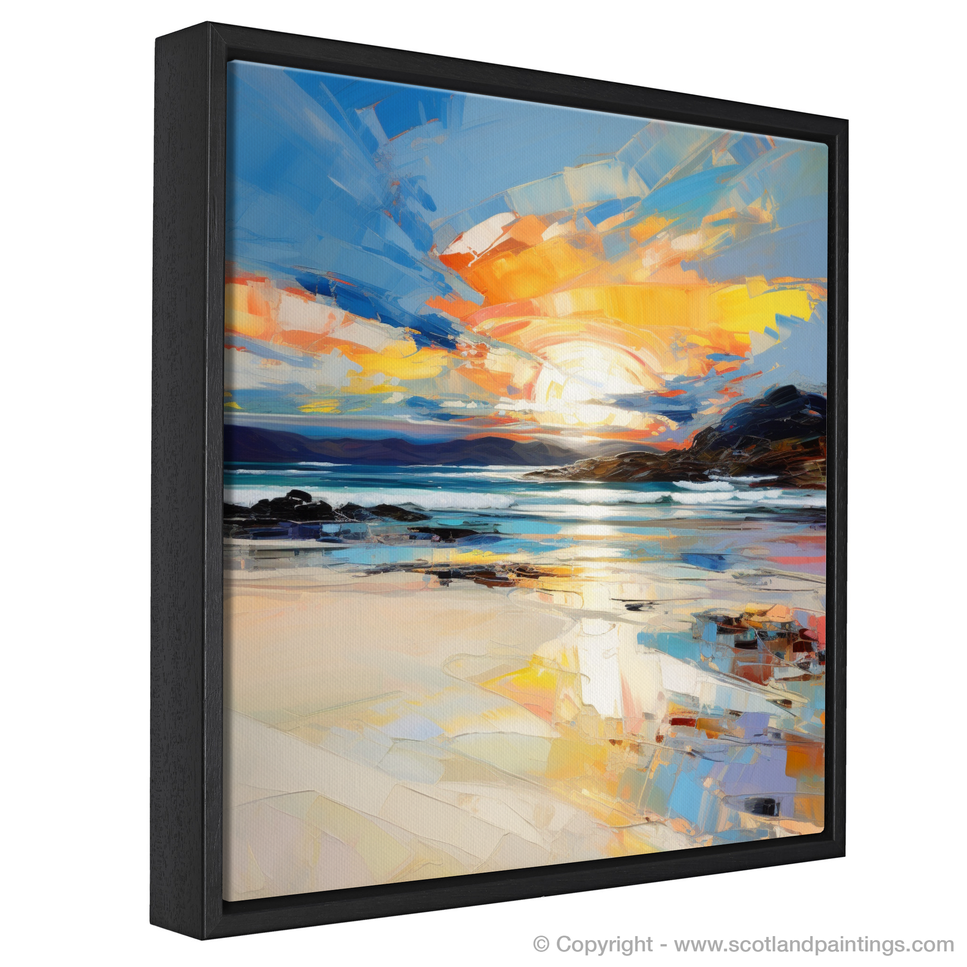 Capturing the breathtaking beauty of Traigh Mhor at the day's end, this vibrant expressionist print brings the dynamic Scottish coast to life. The scene is dominated by a dramatic sunset, with bold, fiery hues of orange and red that bleed into the sky, meeting streaks of tranquil blues and purples that mirror the waters below.