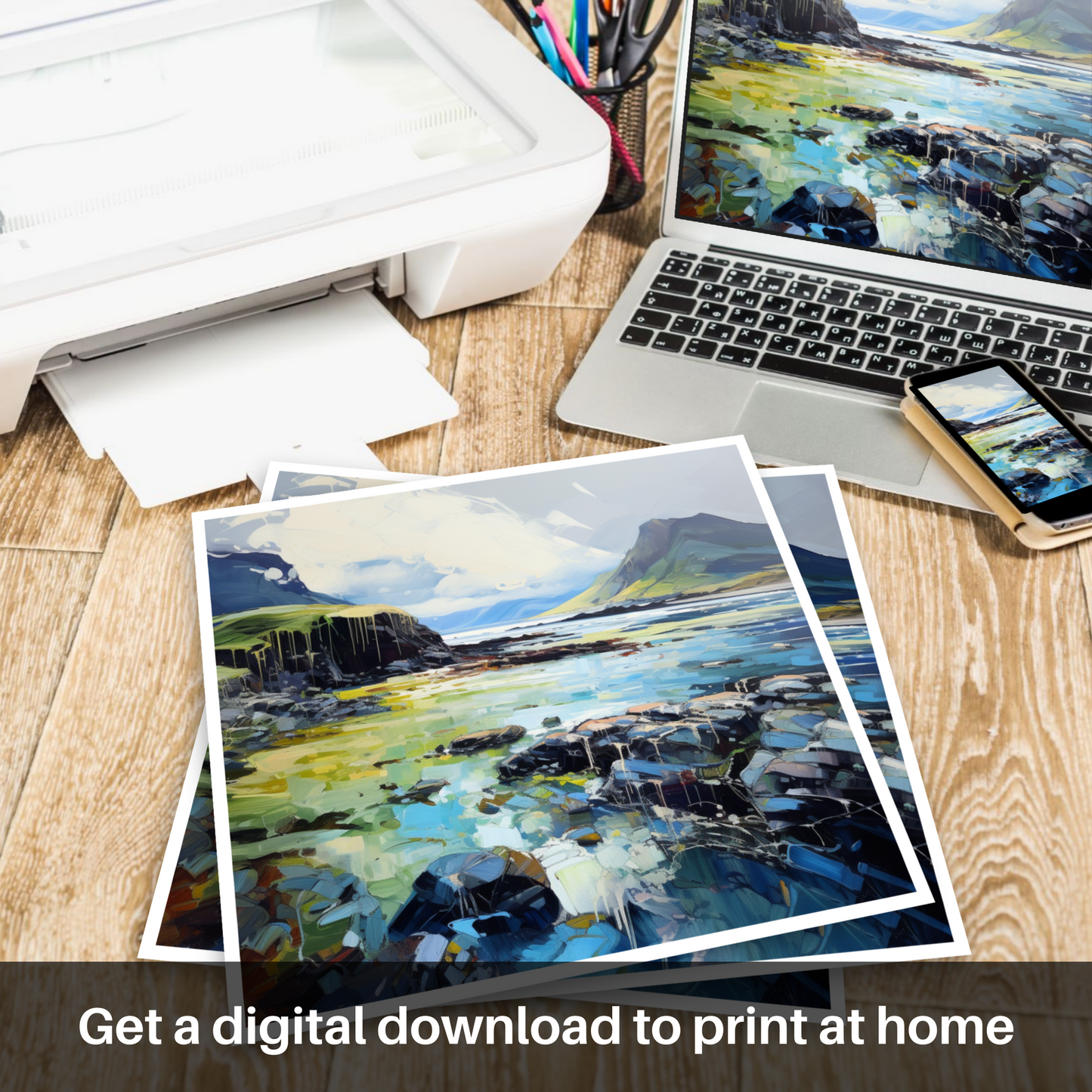 Capturing the wild, untamed beauty of Scotland's coastal landscape, this vibrant expressionistic print invites viewers to a visual journey across Ardtun Bay, Isle of Mull. The dynamic brushwork conveys the rugged texture of the seaside cliffs as they cascade into a mosaic of rocky shores. Vivid hues of cobalt, azure, and frothy white dominate the foreground, evocatively recreating the shimmering play of light upon the water's surface, while subtle touches of green and yellow suggest the presence of resilient coastal flora.