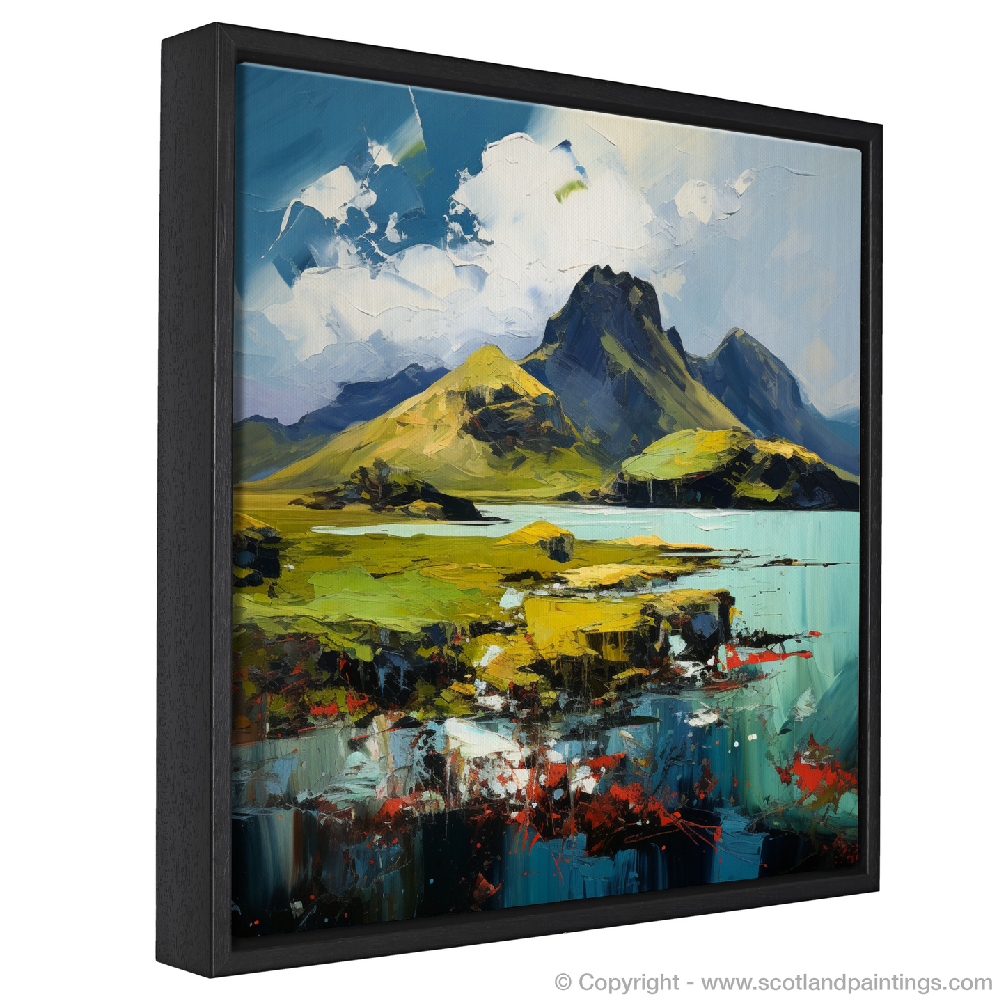 Touches of fiery reds and soft corals in the foreground suggest wildflowers and heather, bringing a sense of immediacy and raw texture to the fore. This interplay of colour and form orchestrates a visual feast, inviting observers to lose themselves in the depth and drama of the Scottish Isles.