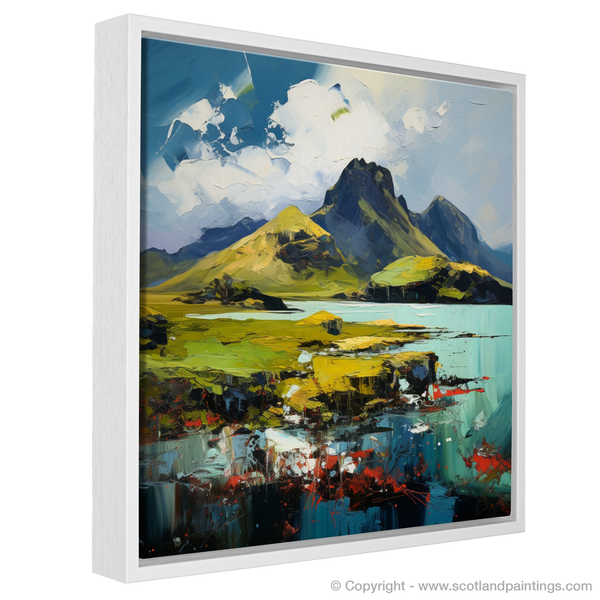 Capturing the raw beauty and dramatic contours of the Isle of Eigg, this arresting print serves as a window to the wild and rugged landscapes of the Scottish Inner Hebrides. Embodying the essence of Expressionism, the artwork pulsates with a vivid spectrum of colours and impassioned brushwork that mirrors the emotional intensity of the island's natural splendour.