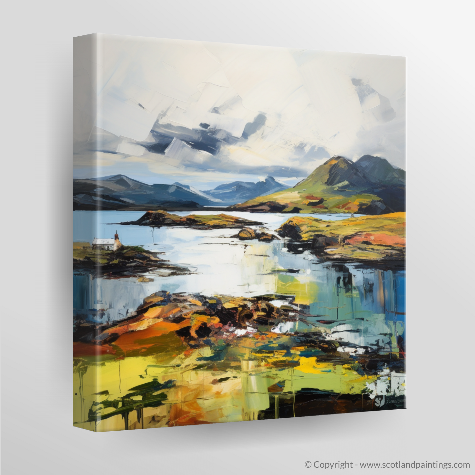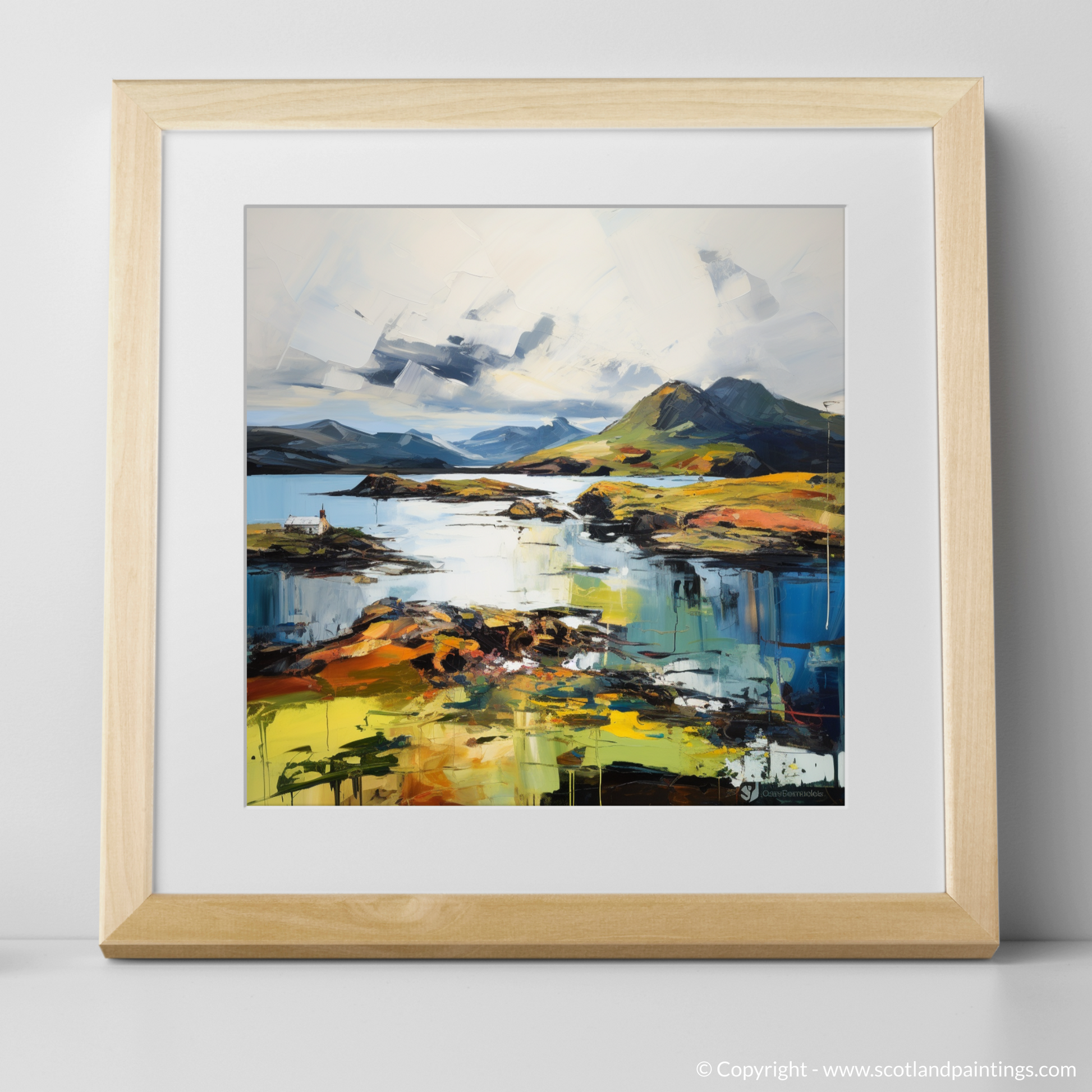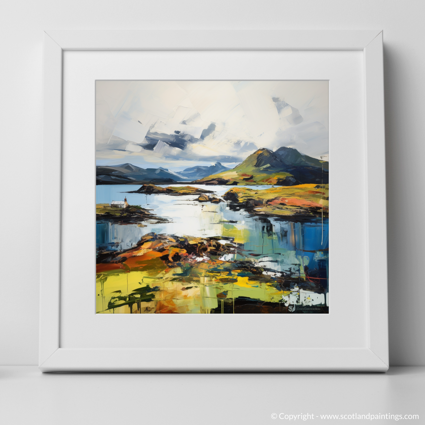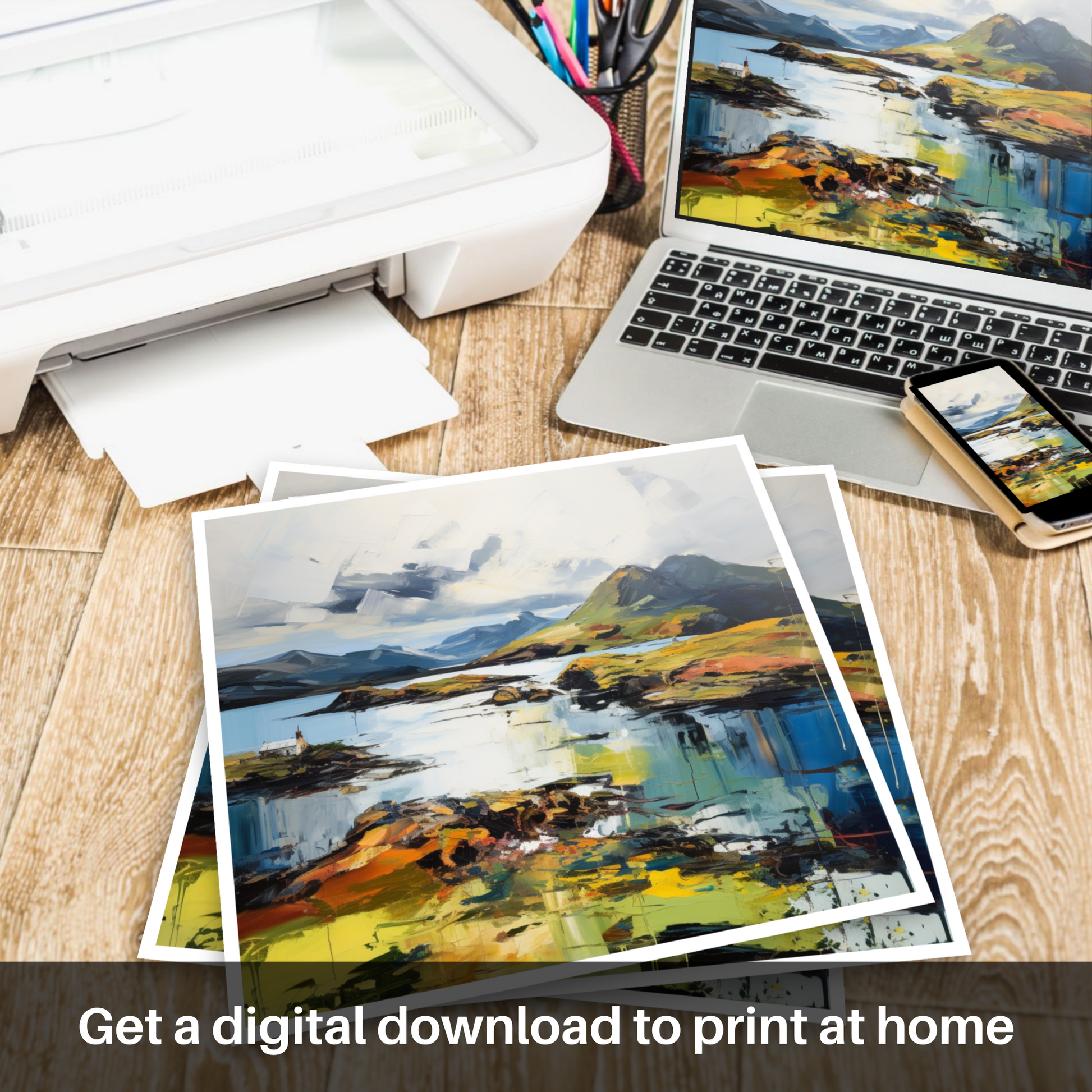 Capturing the untamed beauty and dramatic contrasts of the Isle of Rum, this expressive print brings to life the rugged landscape of the Inner Hebrides with a modern twist. The artwork features bold, impasto strokes that evoke the wild, primeval character of the Scottish island, enveloping viewers in a landscape where the earth meets the sky in a symphony of colour.