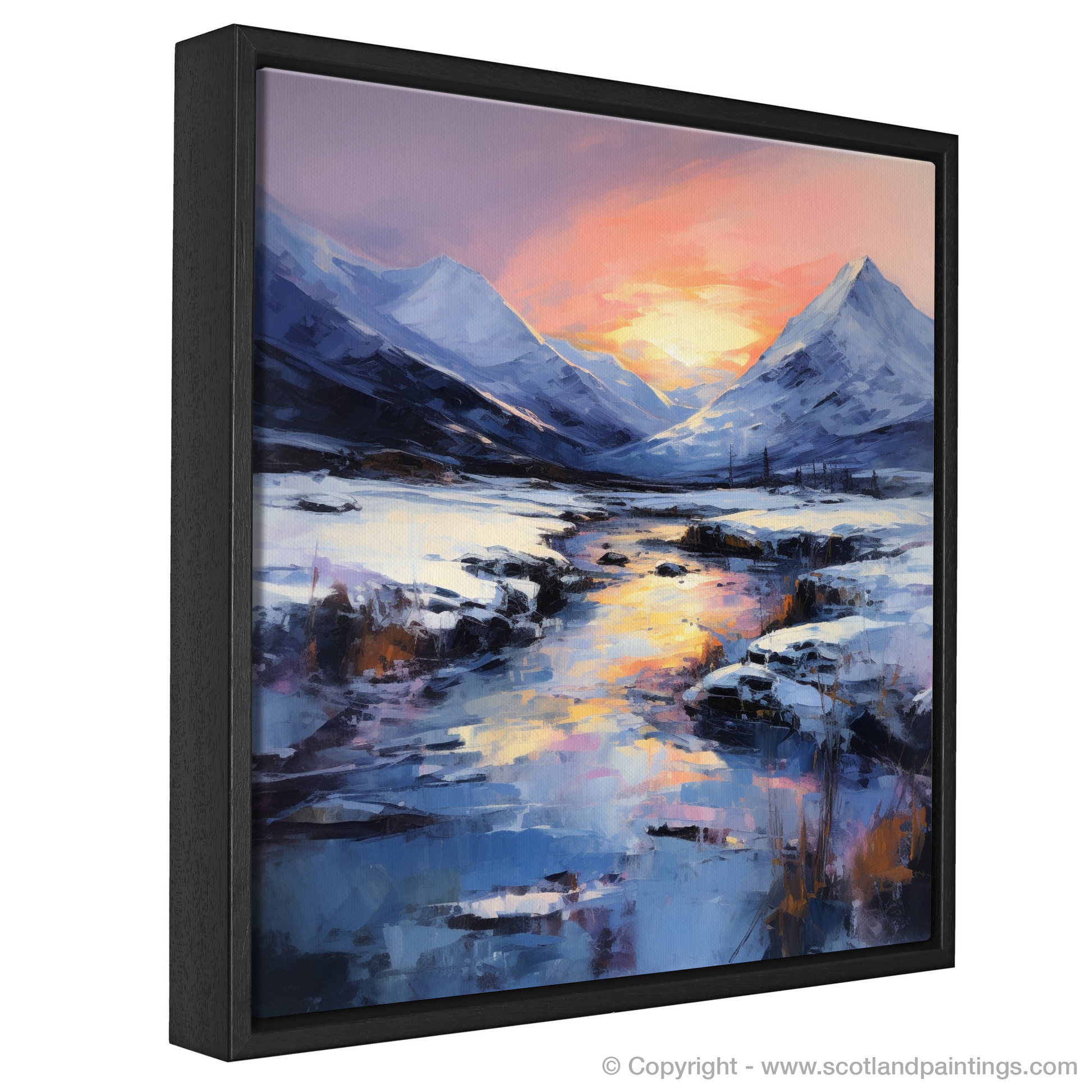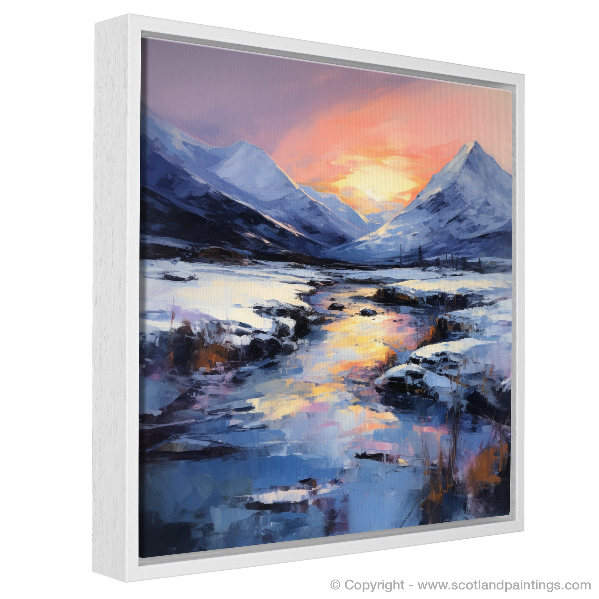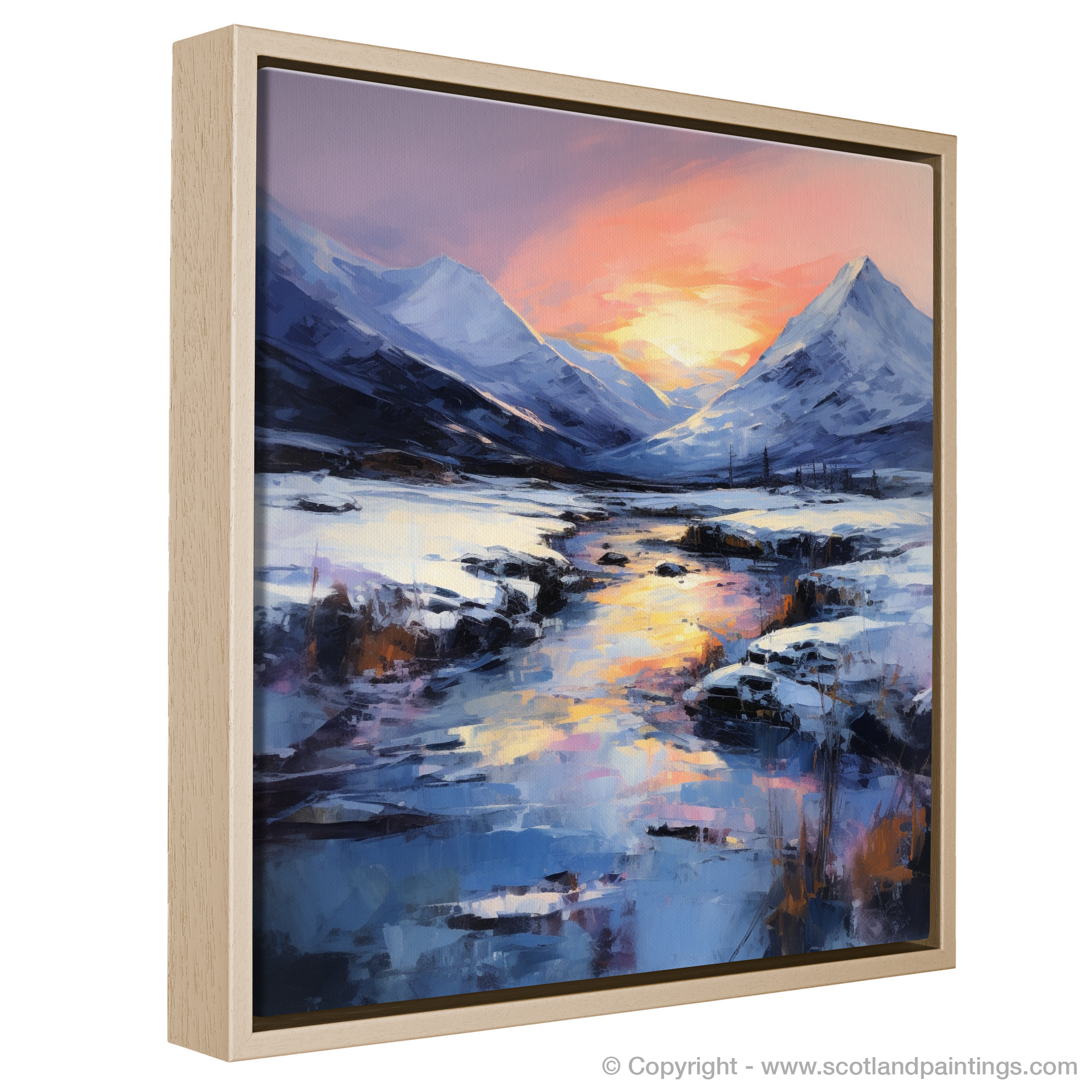 Captured in the evocative brushstrokes of expressionism, this entrancing print transports viewers to the serene landscape of Glencoe at the magical hour of dusk. The piece is a vivid interplay of colour and light, boasting a breathtaking palette that reflects the quiet closing of the day. Glistening oranges, pinks, and purples dance across the canvas, masterfully mingling with the cool blues and whites that represent the untouched snow.