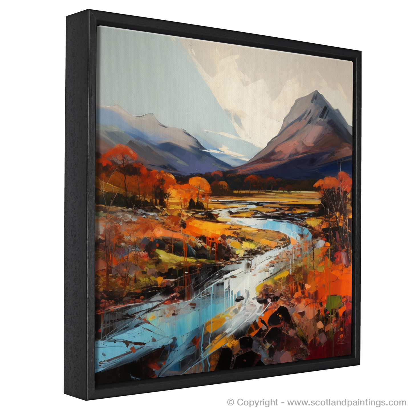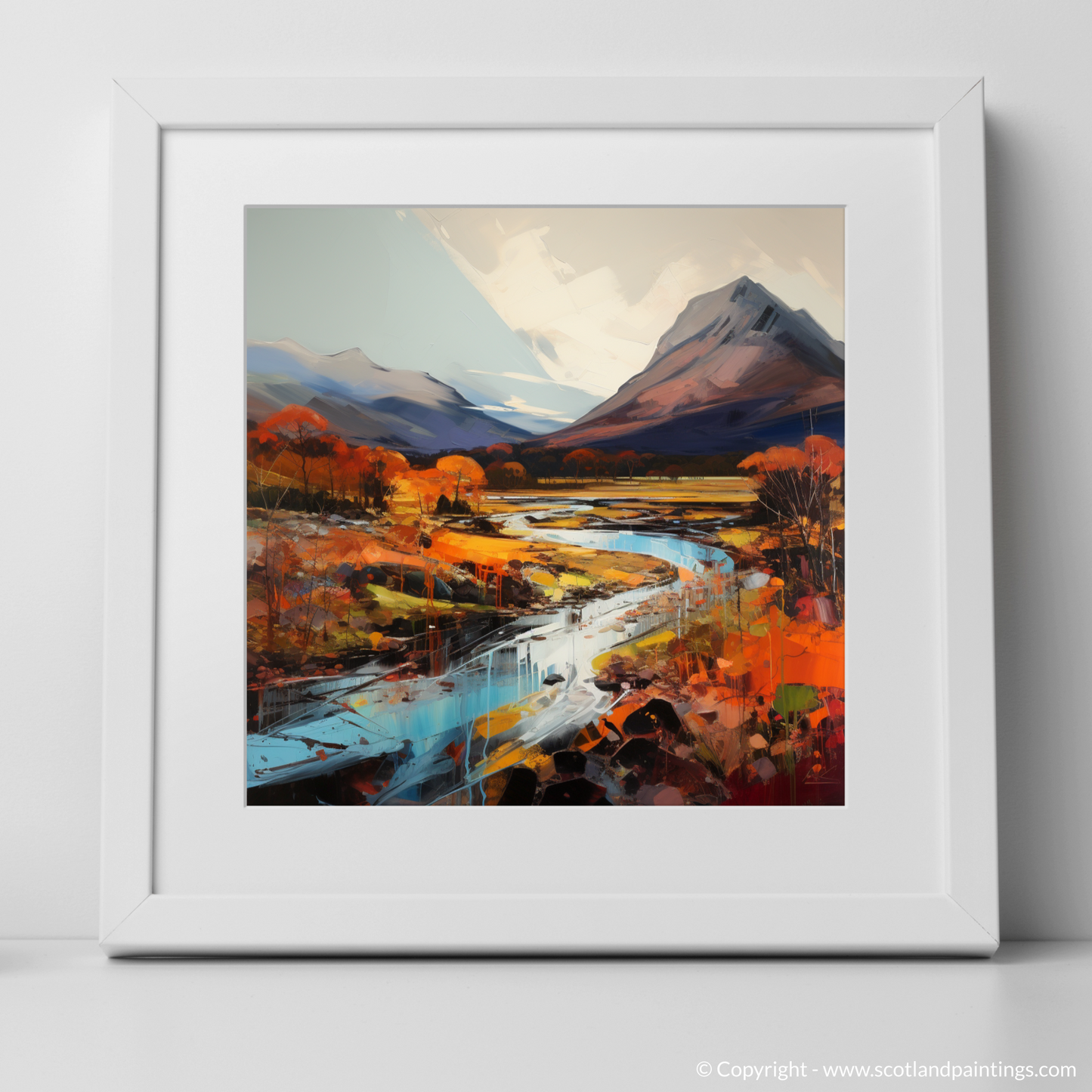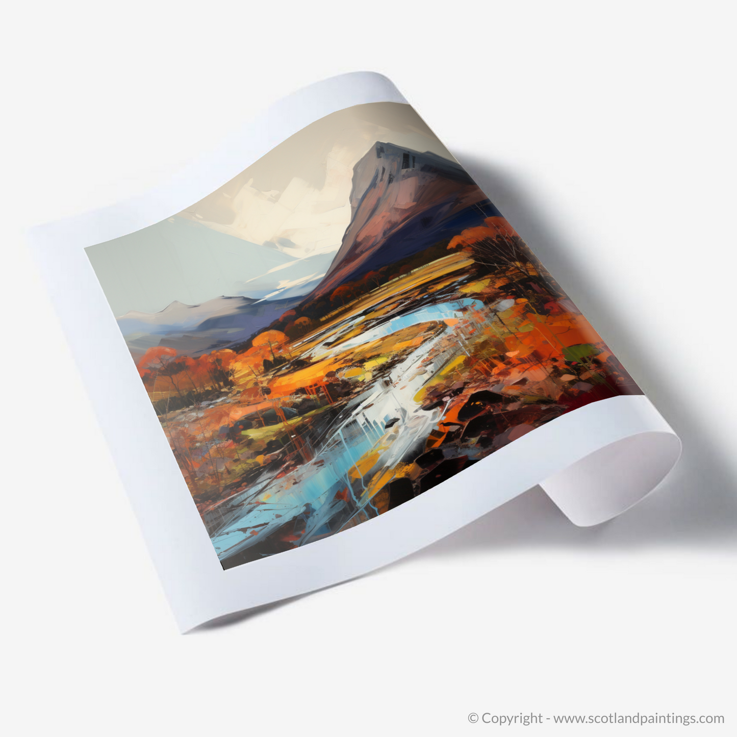 Experience the vivid and dynamic beauty of Glencoe as captured in this stunning expressionist print—the very essence of autumn distilled into a tapestry of colour and emotion. Bold brushstrokes convey the turbulent dance of the elements, where fiery oranges, deep russets, and golden yellows clash and mingle with the cool blues of water and the muted purples of distant mountains. This print evokes the transient light of a setting sun casting its glow across a rugged landscape, igniting the heather and trees in a blaze of autumnal glory.
