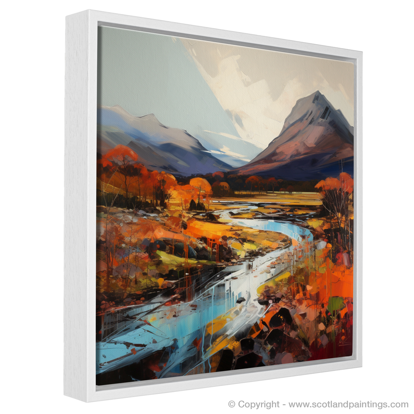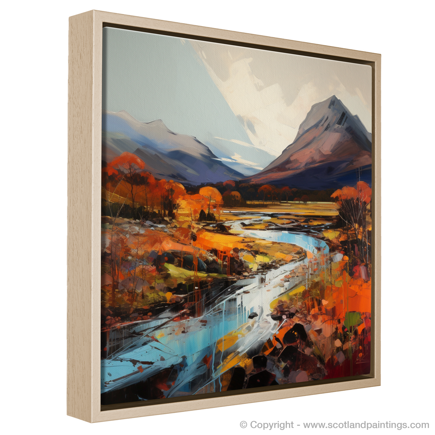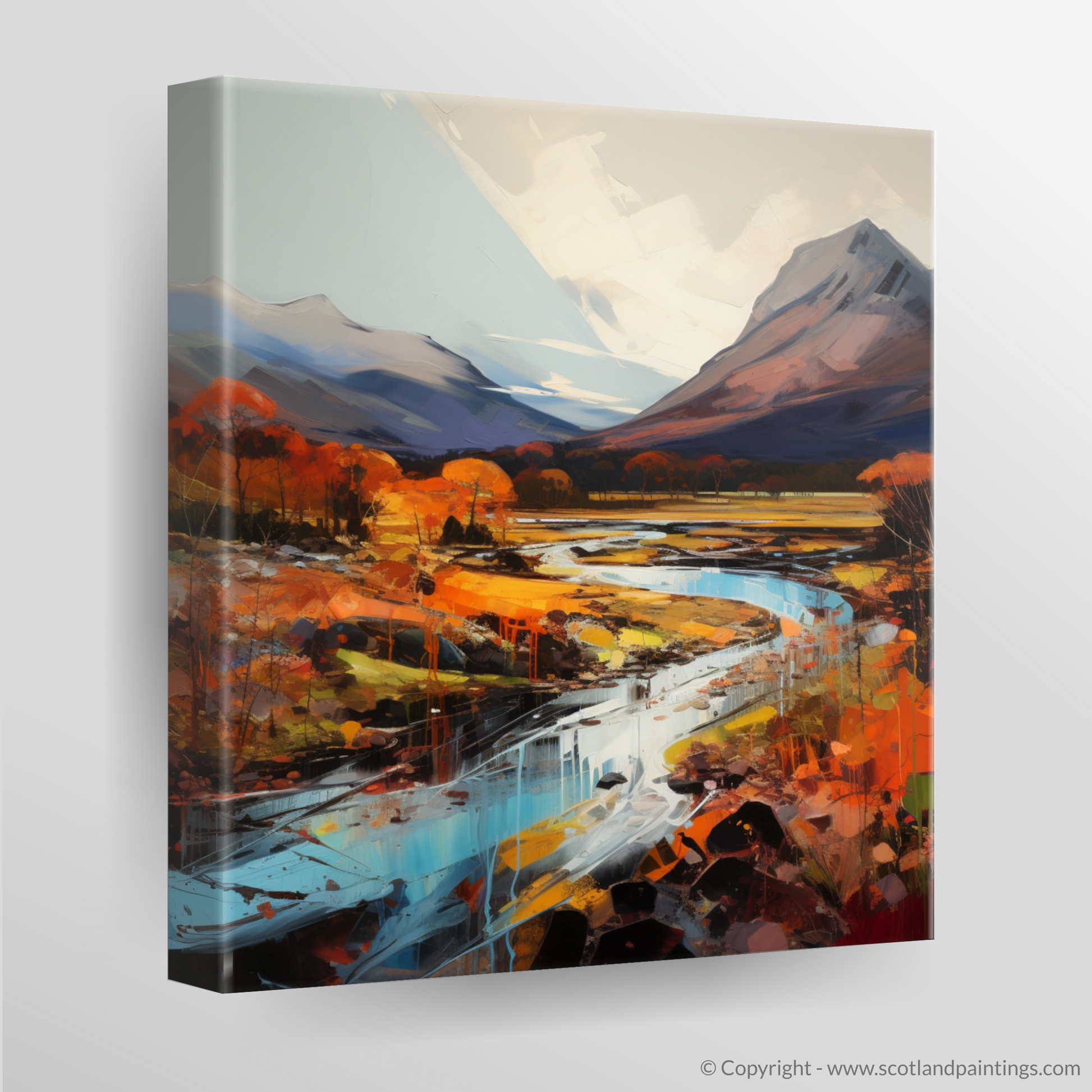 Experience the vivid and dynamic beauty of Glencoe as captured in this stunning expressionist print—the very essence of autumn distilled into a tapestry of colour and emotion. Bold brushstrokes convey the turbulent dance of the elements, where fiery oranges, deep russets, and golden yellows clash and mingle with the cool blues of water and the muted purples of distant mountains. This print evokes the transient light of a setting sun casting its glow across a rugged landscape, igniting the heather and trees in a blaze of autumnal glory.