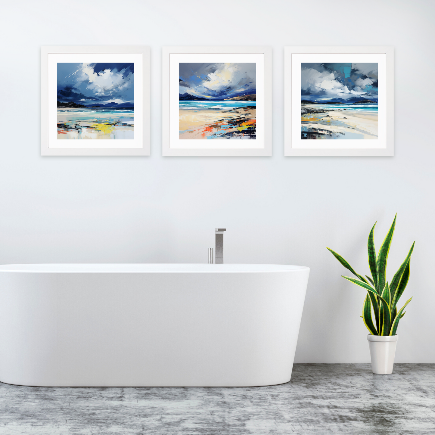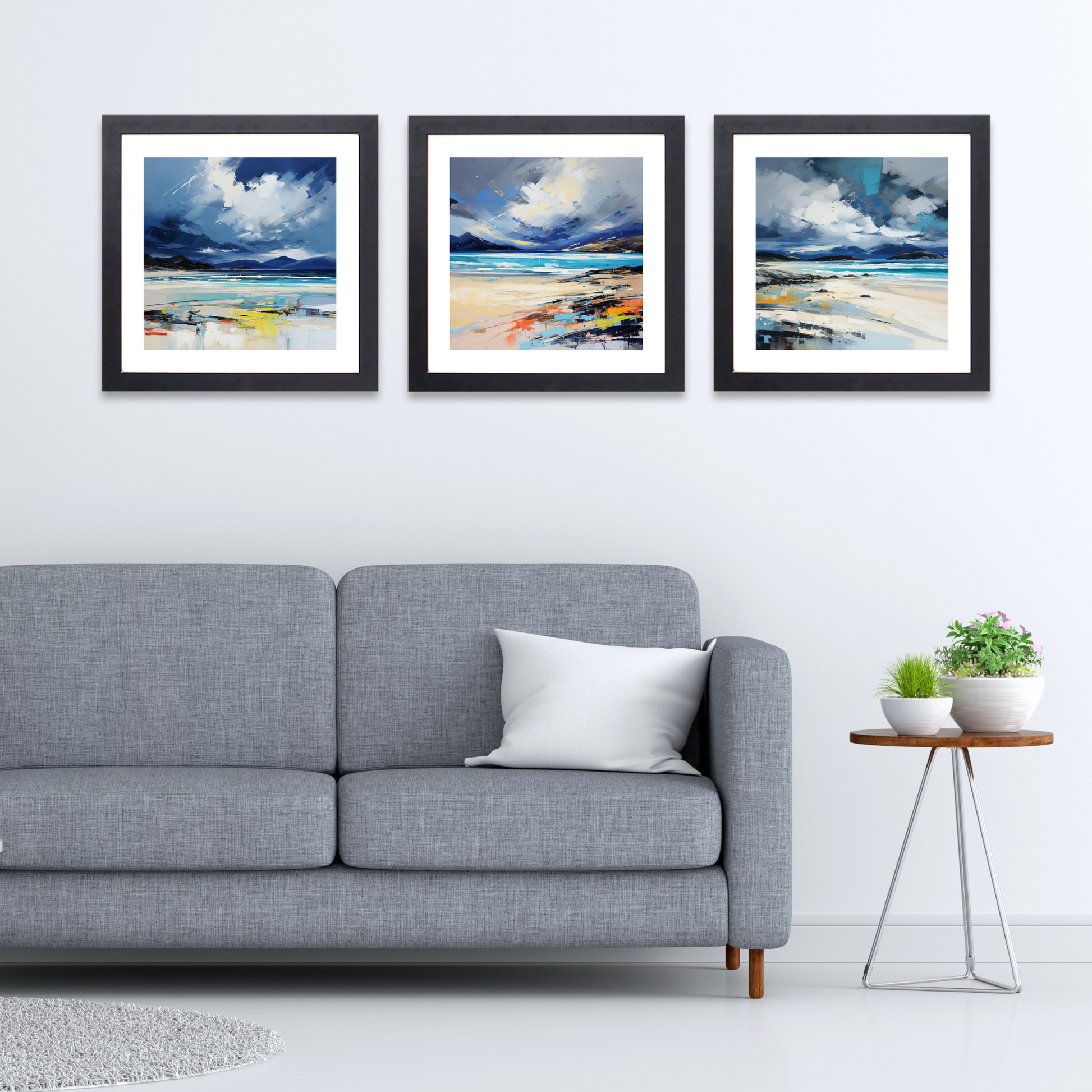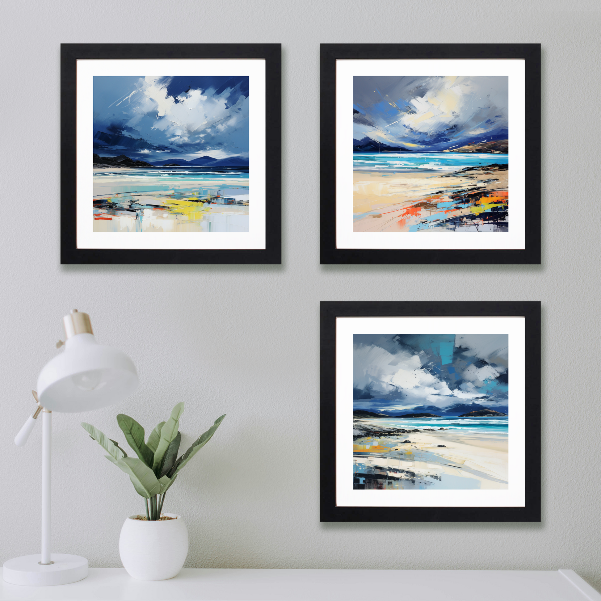 Transform your living space into a haven of natural beauty with our exquisite set of three framed prints from the Scottish Beaches collection, available exclusively at ScotlandPaintings.com. These stunning artworks capture the ever-changing moods of Luskentyre Beach, set against a dramatic stormy sky. The set exudes a captivating aura that evokes the wild and untamed essence of Scotland’s coastlines.