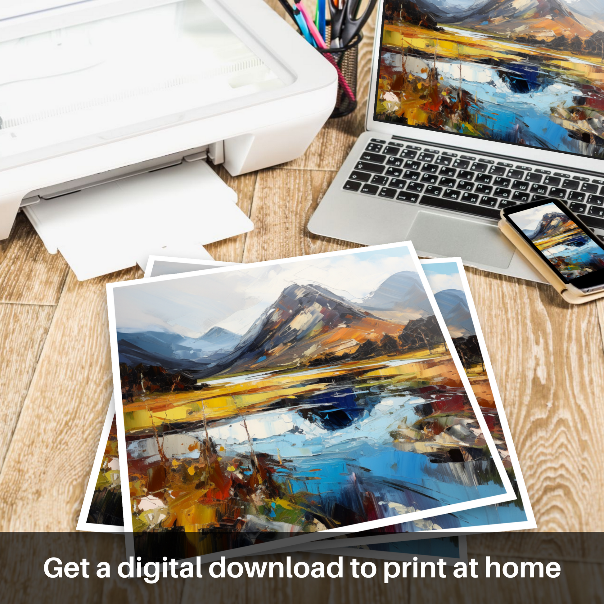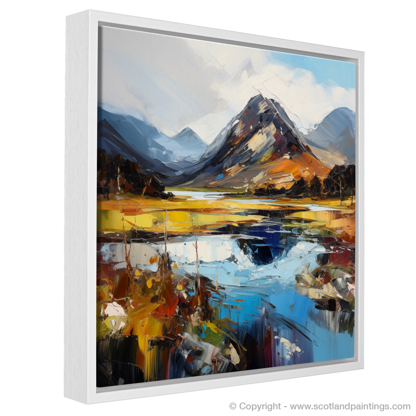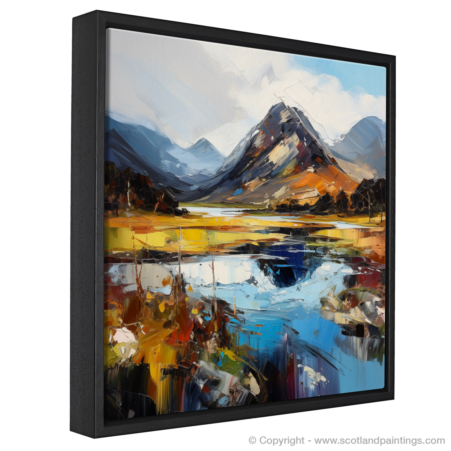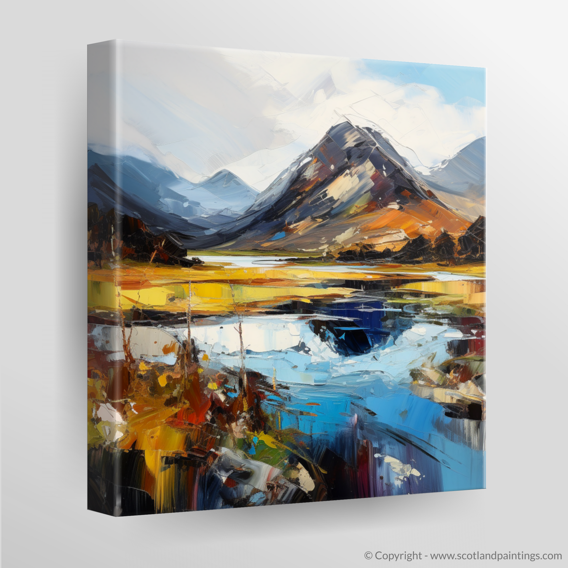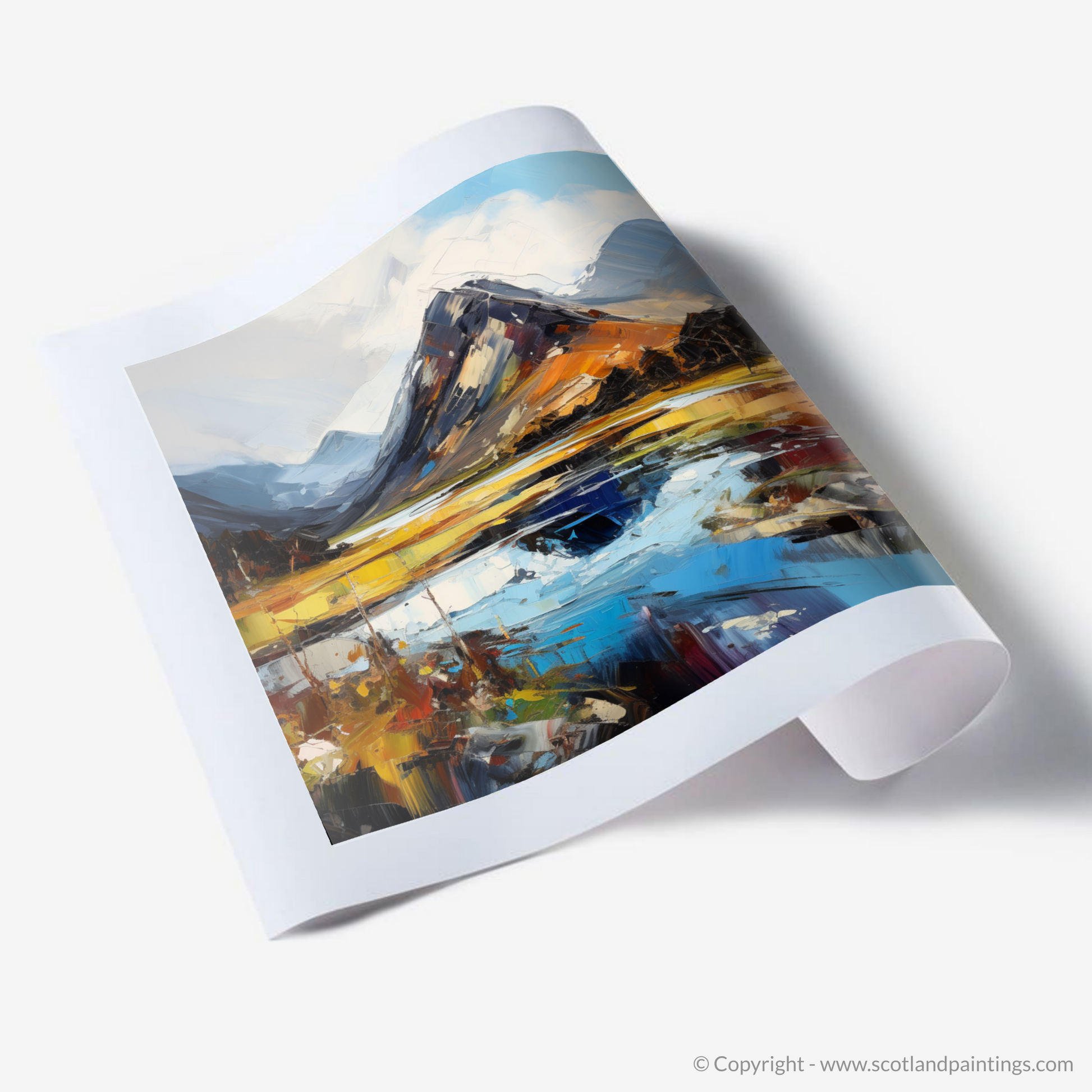 Capturing the raw beauty of the Scottish Highlands, this expressive print brings the drama and majesty of Glen Sannox to life. Bold brushstrokes in a rich palette of blues, oranges, and yellows evoke the rugged essence of the landscape, with the looming, snow-capped mountains standing sentinel over the glen.