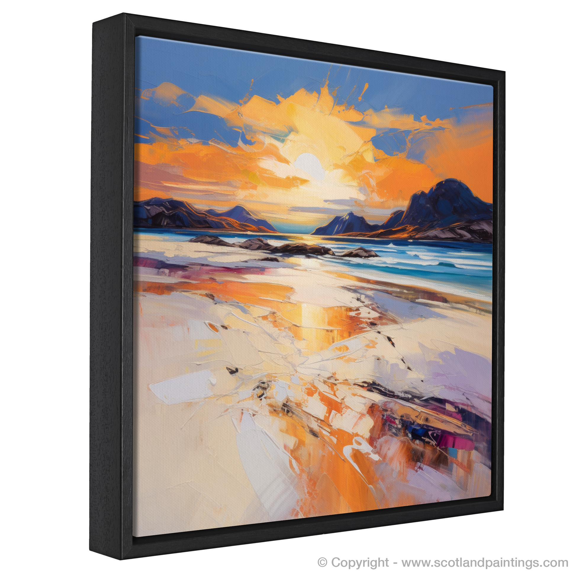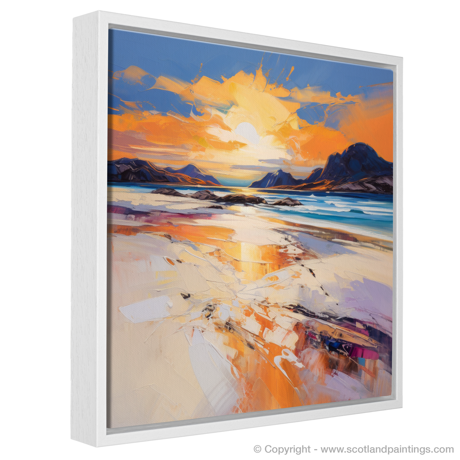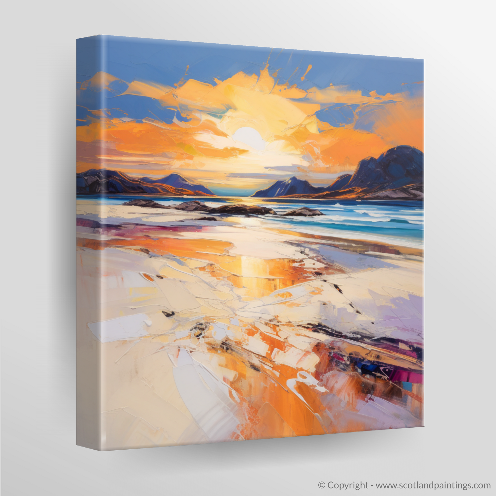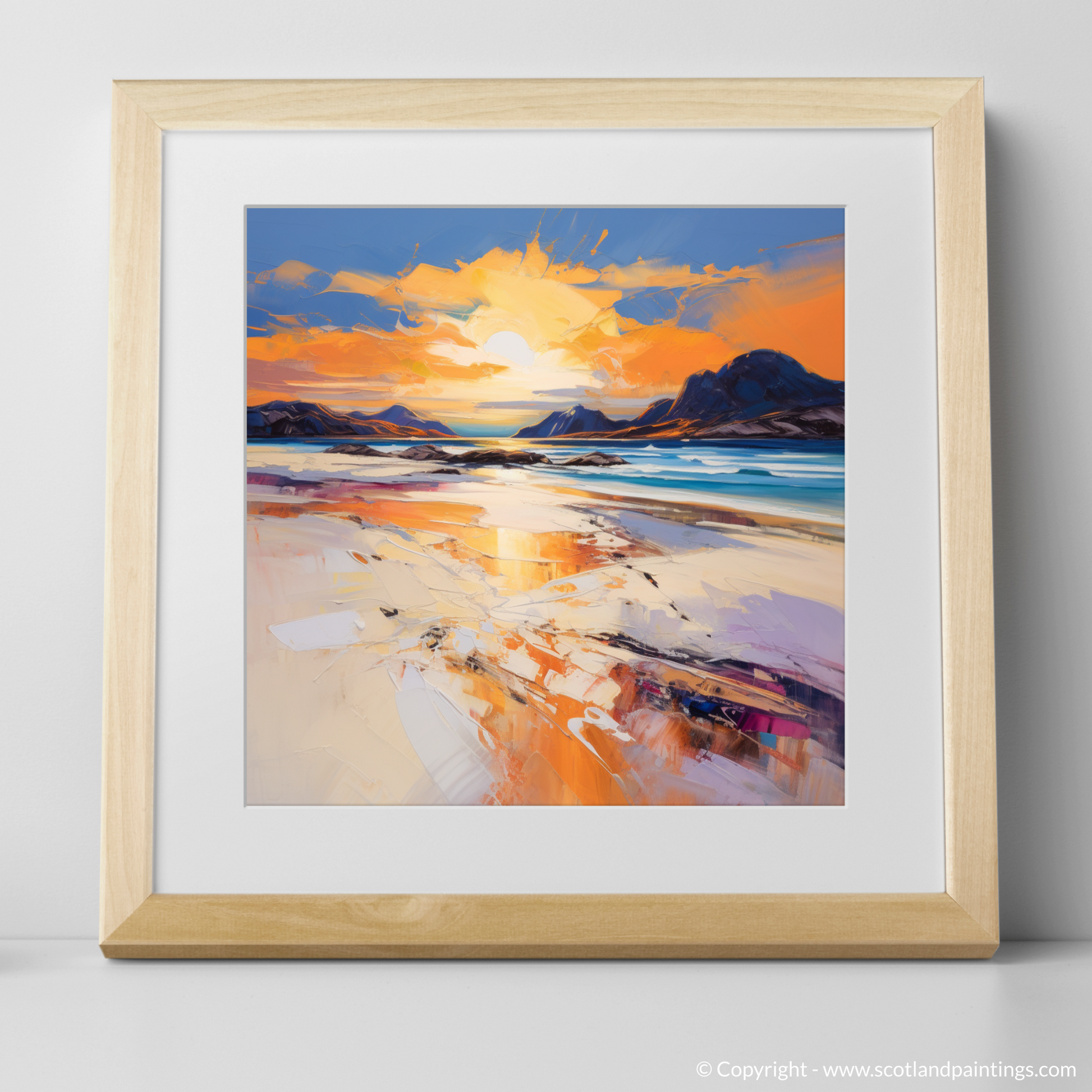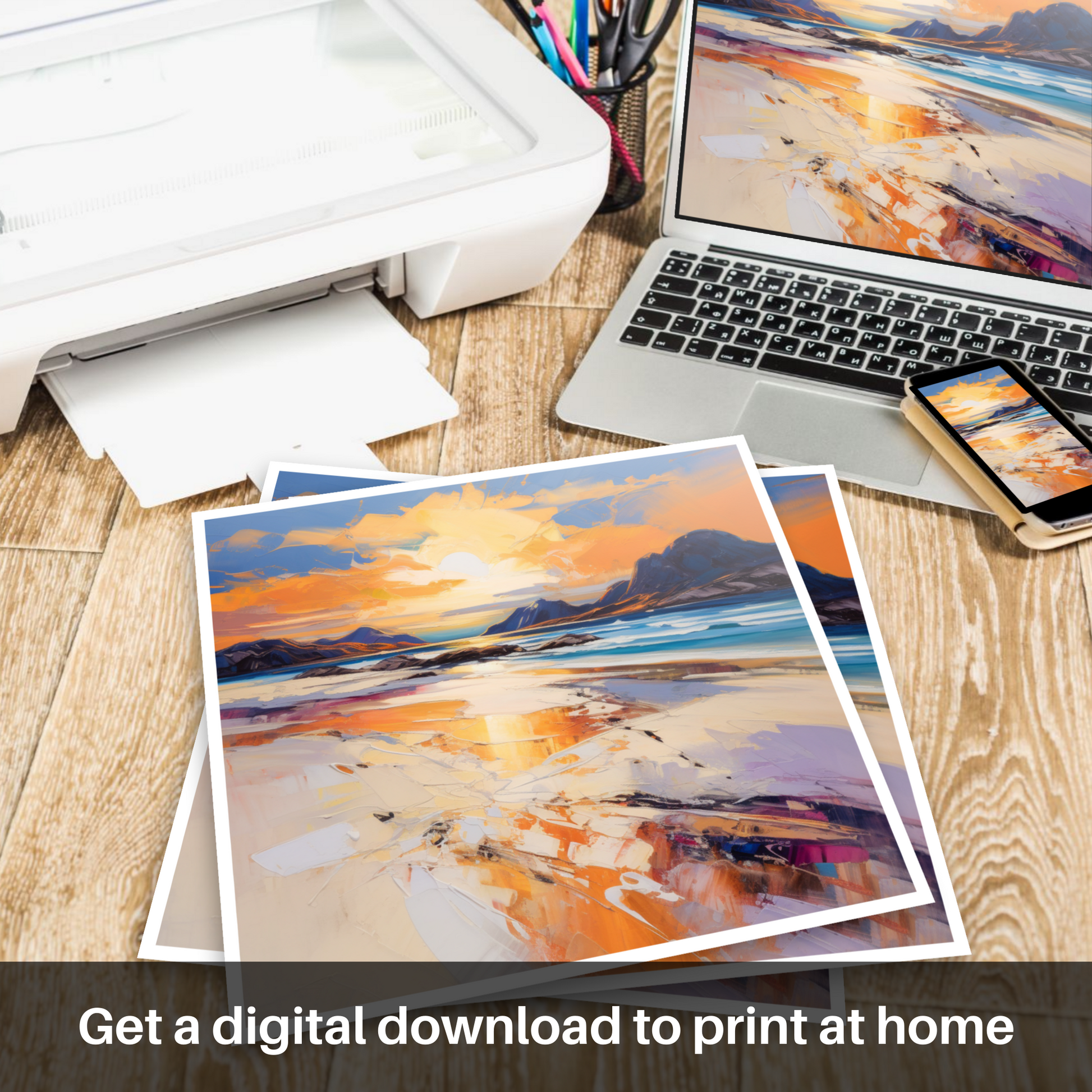 Capturing the ephemeral beauty of Mellon Udrigle Beach, this exquisite print is a vibrant homage to the wild Scottish coast bathed in the resplendent light of golden hour. Dynamic and fervent brushstrokes detail the sky ablaze with fiery hues of orange, deep yellows, and gentle purples, giving credence to the expressive style that defines this piece.