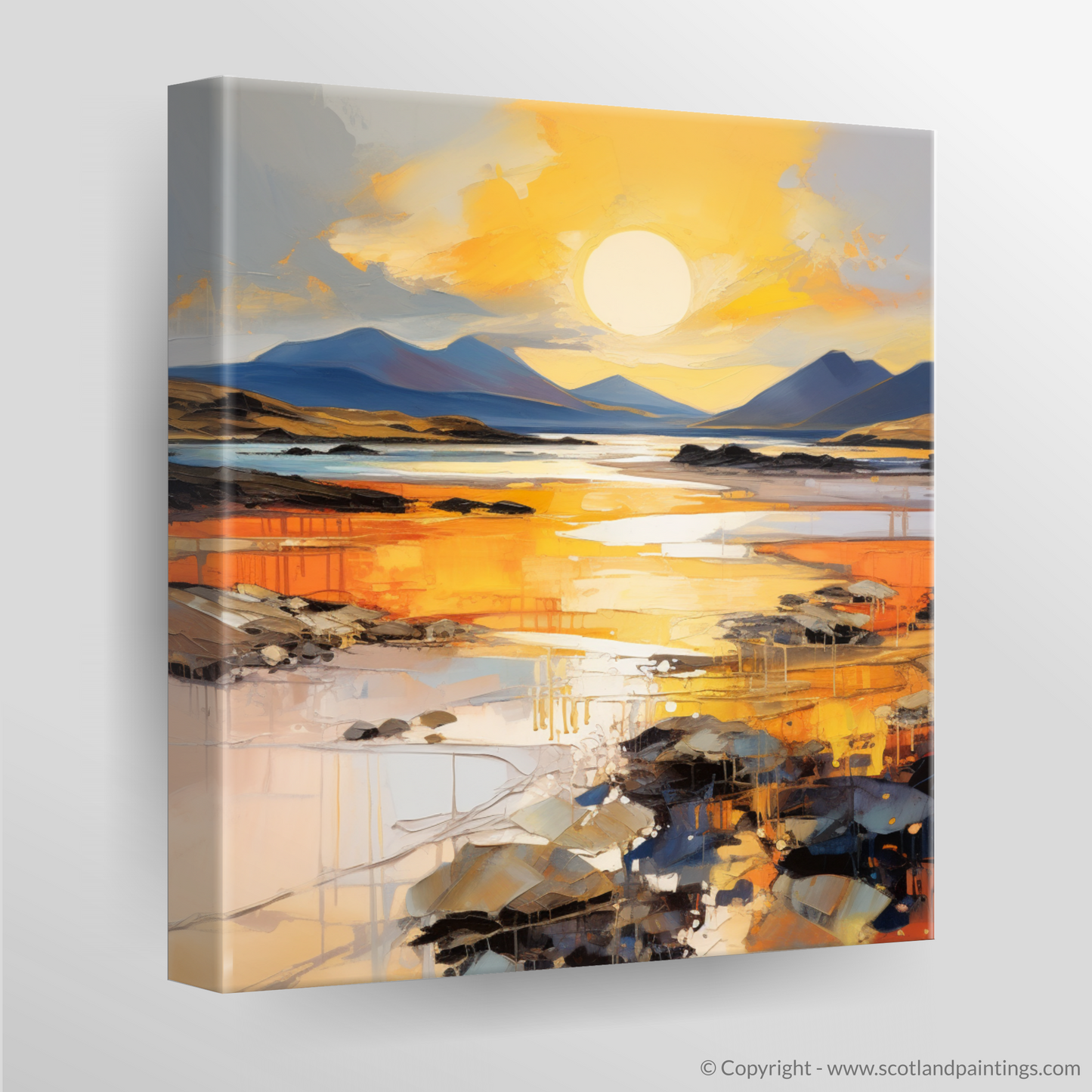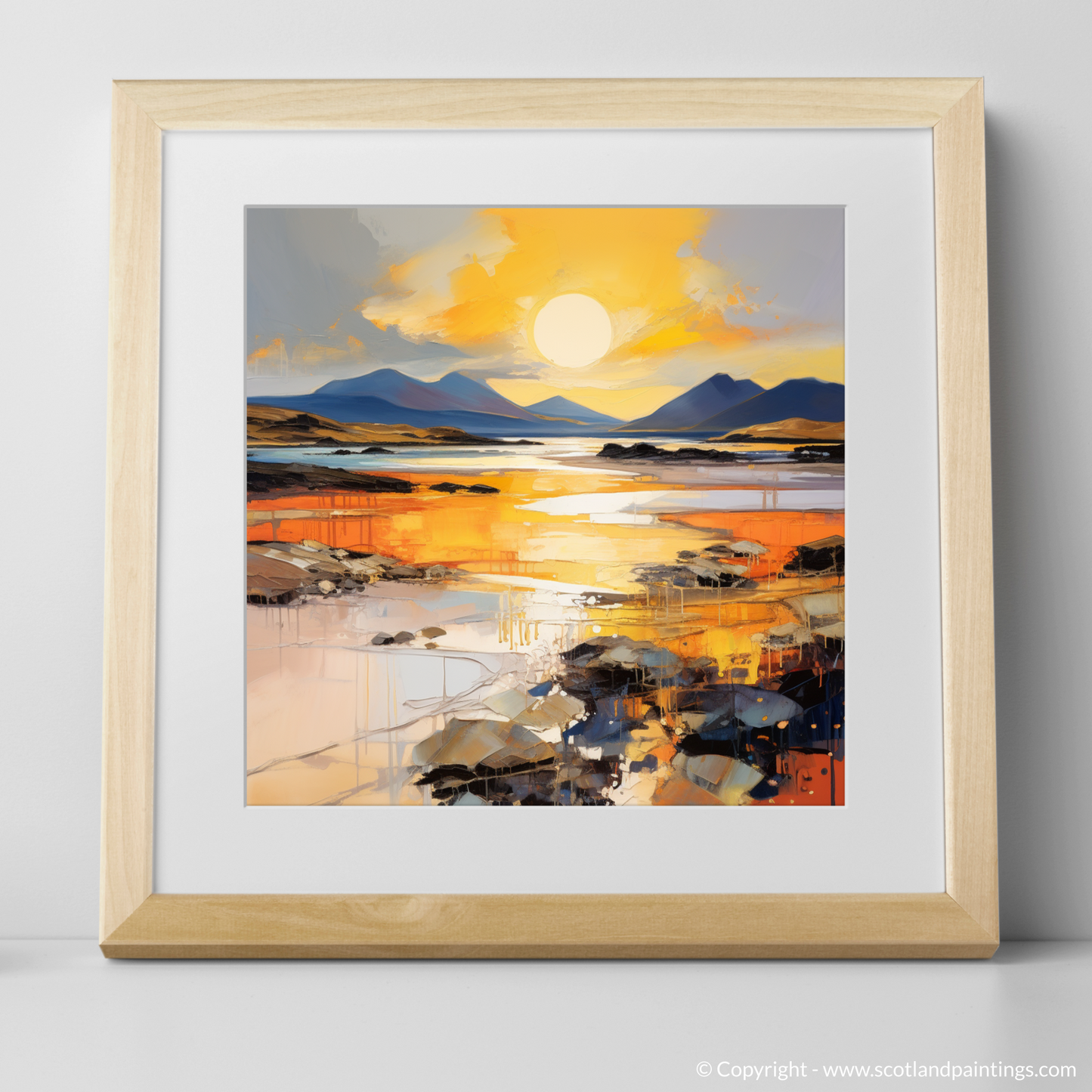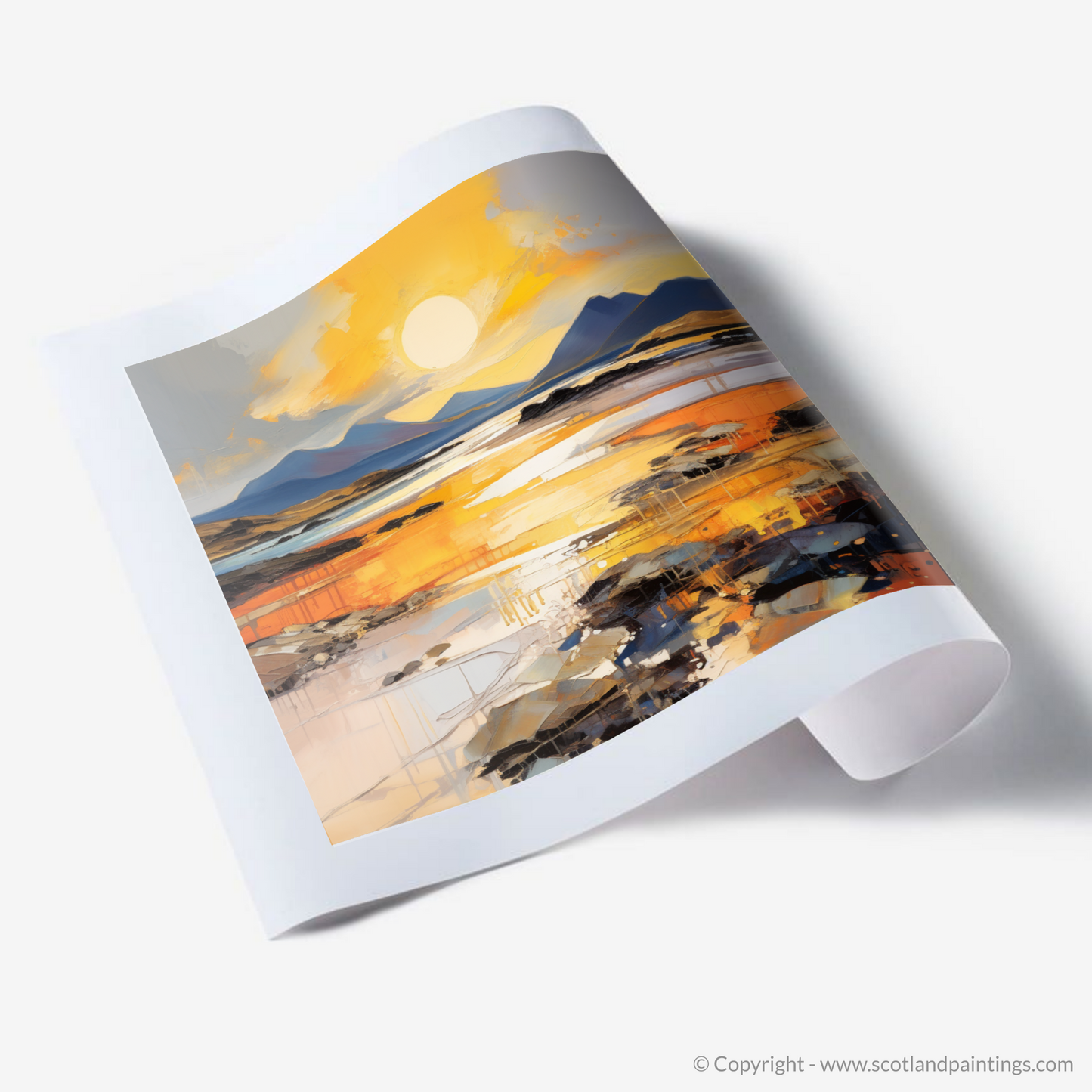 Captivate your senses with this striking print inspired by the serene Mellon Udrigle Beach at the enchanting golden hour. Embracing the raw energy and passion of Expressionism, this piece invites the viewer to experience the Scottish coastline through a vibrant spectacle of colour and texture.