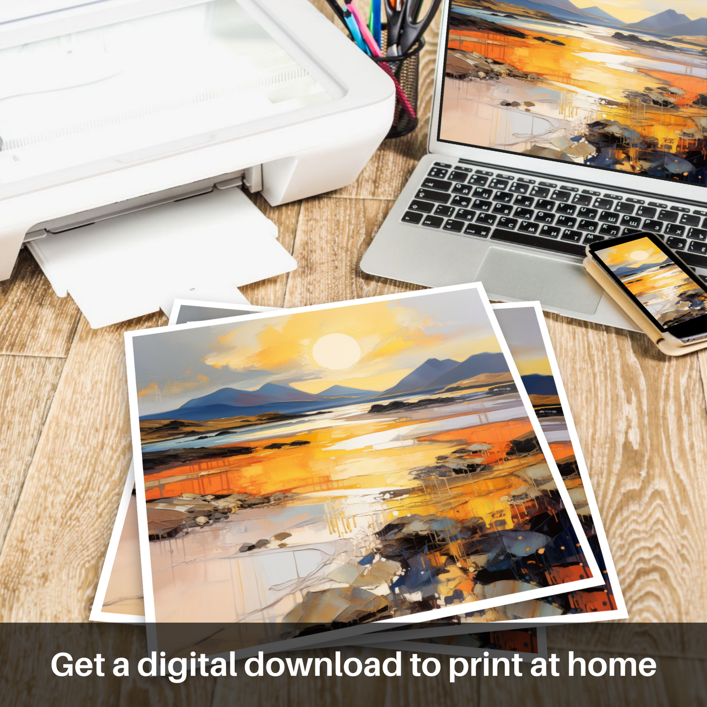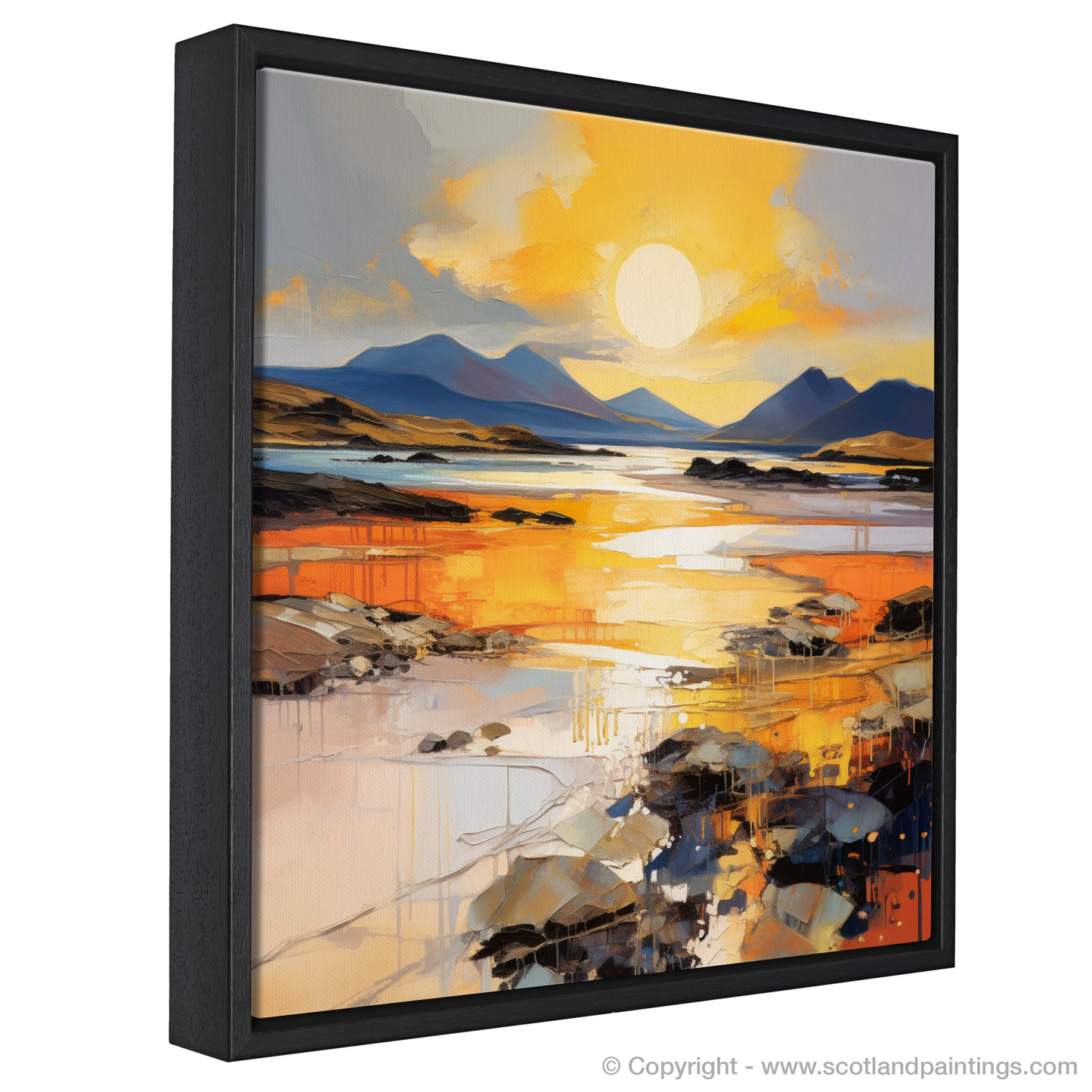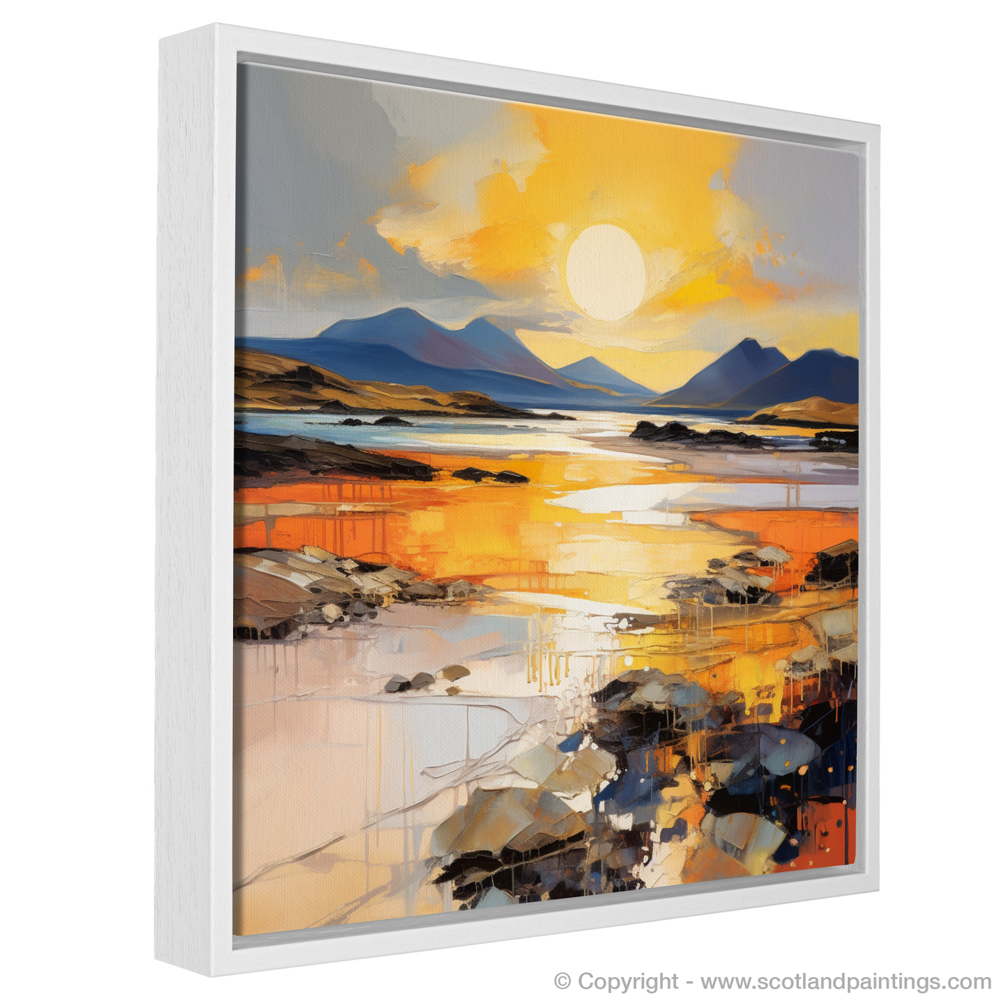 Captivate your senses with this striking print inspired by the serene Mellon Udrigle Beach at the enchanting golden hour. Embracing the raw energy and passion of Expressionism, this piece invites the viewer to experience the Scottish coastline through a vibrant spectacle of colour and texture.