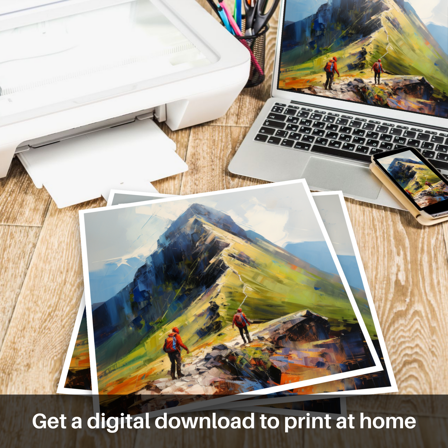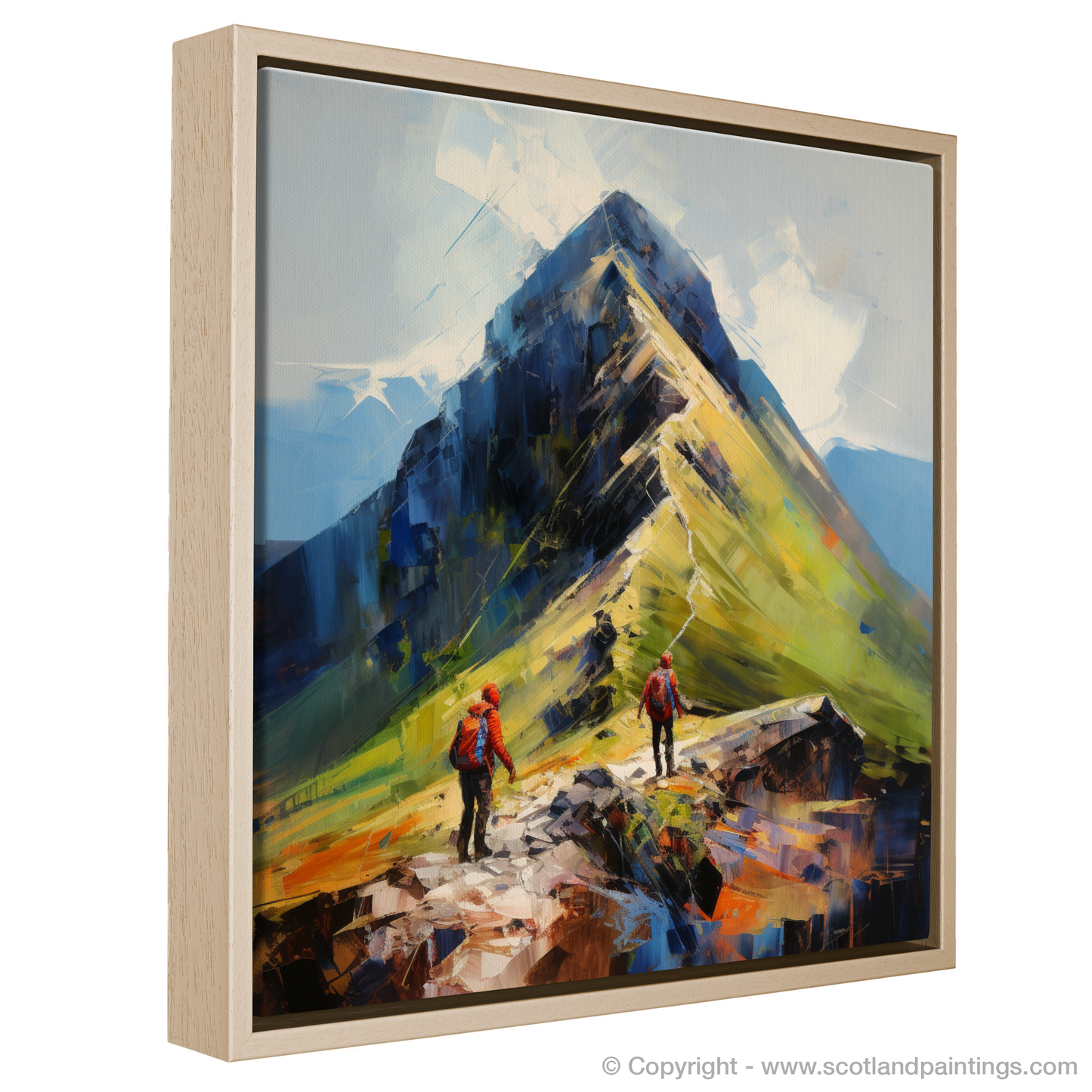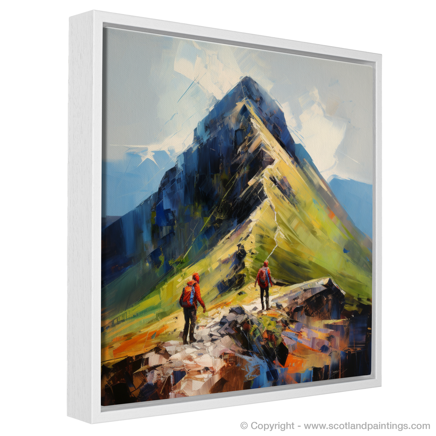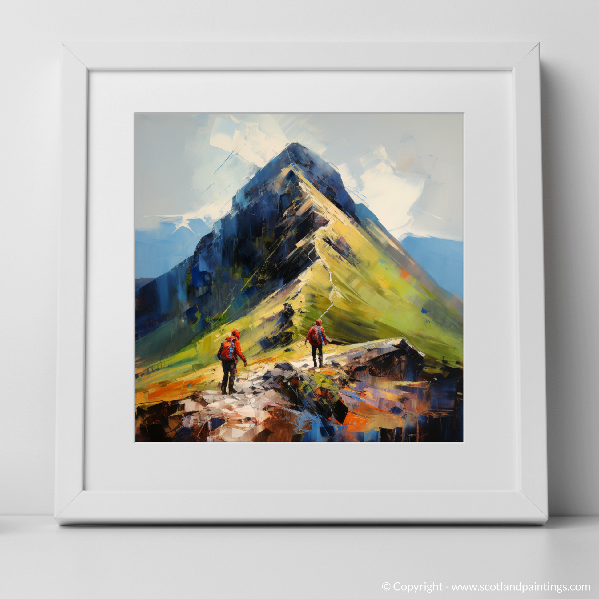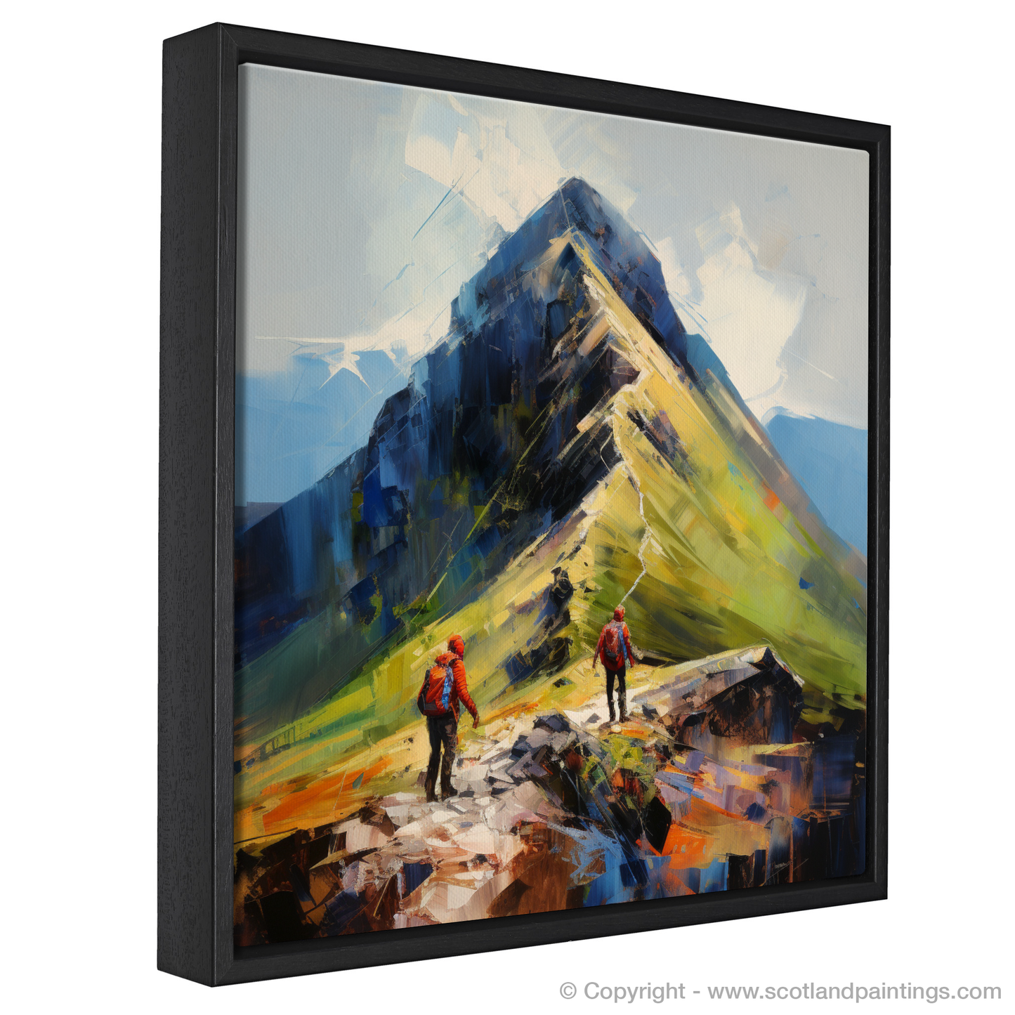 Painting and Art Print of Hikers at Buachaille summit in Glencoe entitled "Buachaille Summit Ascent: An Expressionist Tribute to Glencoe's Rugged Allure".