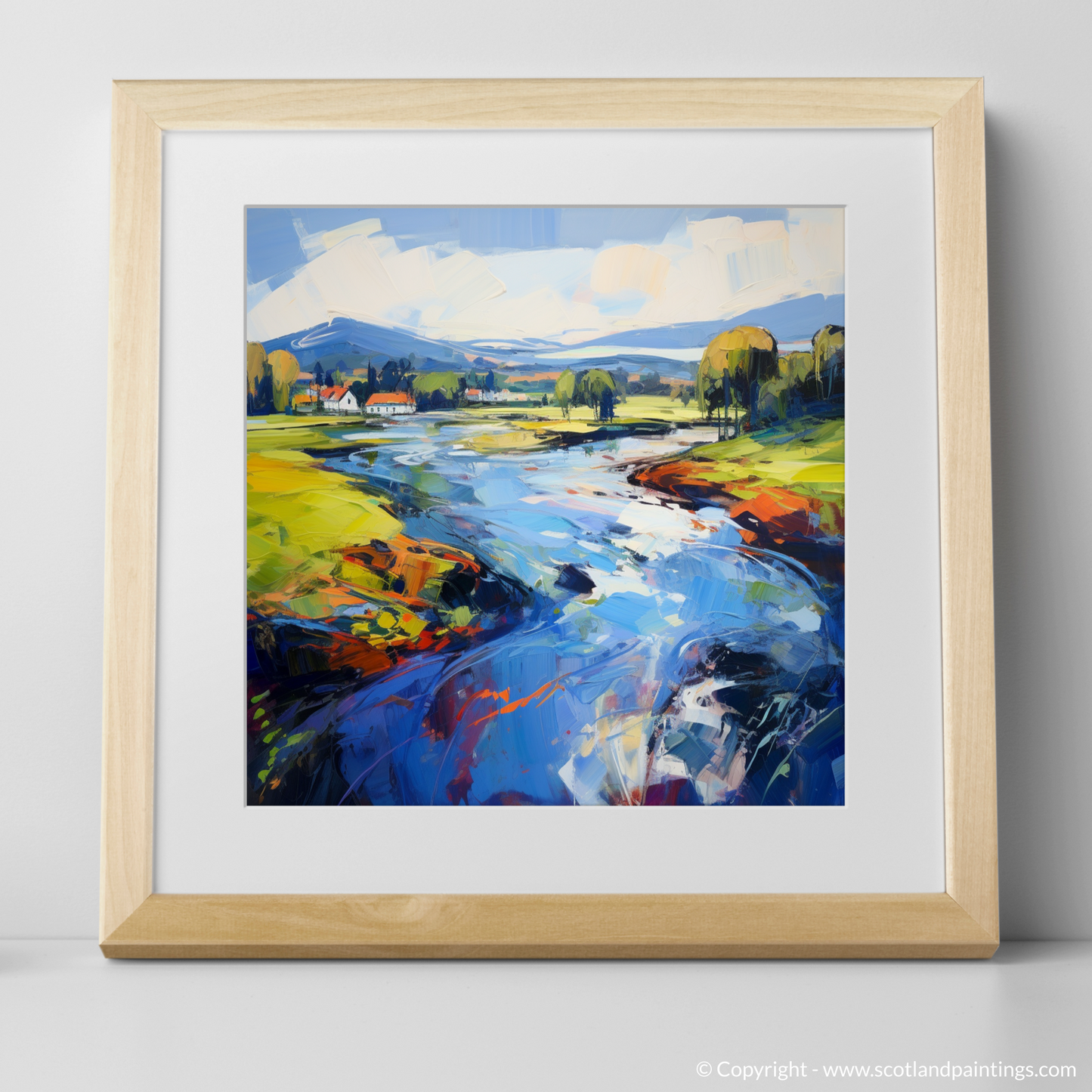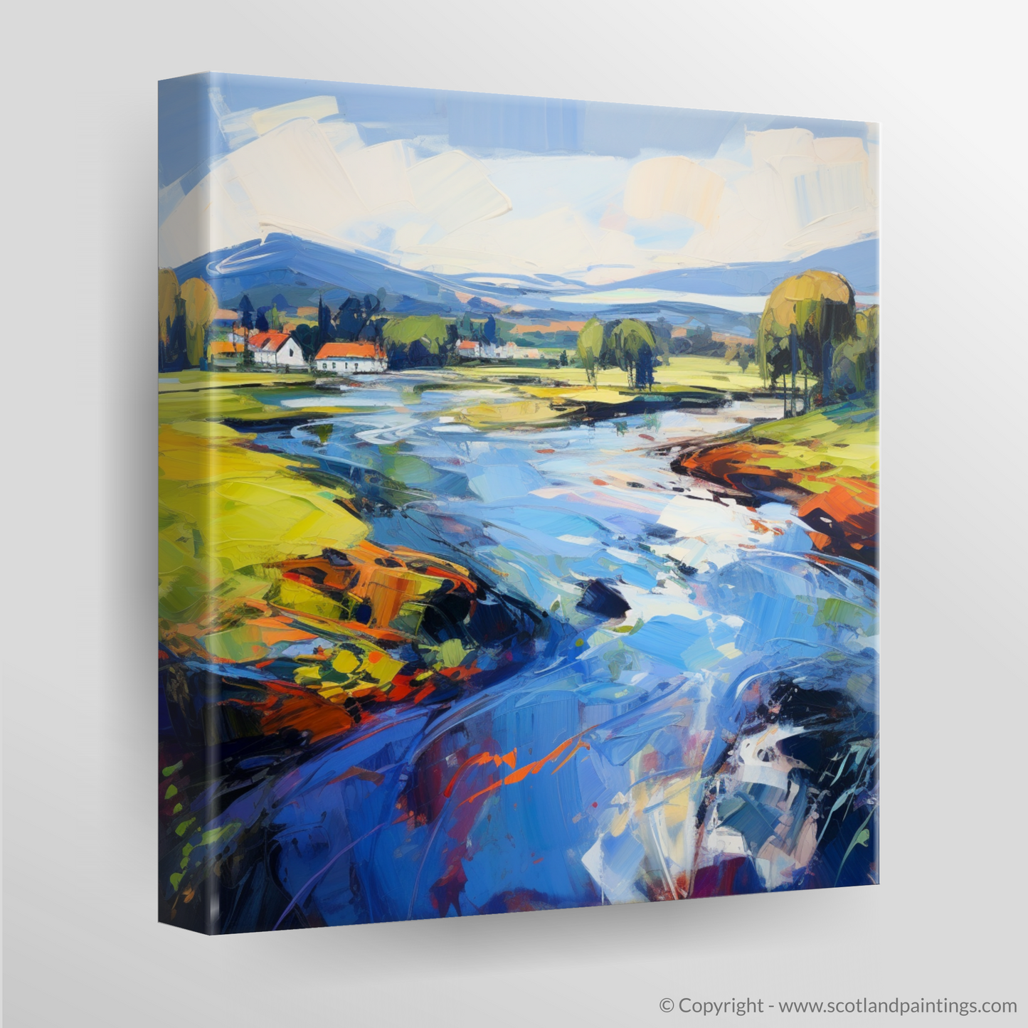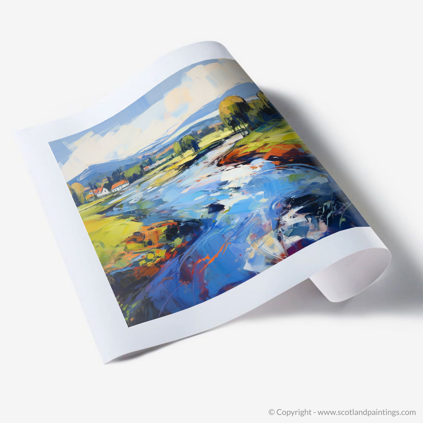 Shadows and highlights are exaggerated for dramatic effect, with the swirling sky above setting a backdrop in sweeps of cool whites and blues, subtly graduating to a softer palette where the horizon meets the distant hills. This composition is a celebration of the raw, untamed beauty of Scotland’s waterways, an invitation to lose oneself in a landscape that is as emotionally stirring as it is visually stunning. A testament to the allure of Scottish Rivers, this print offers not just a view but an experience—a piece of the wild and wondrous soul of Scotland immortalised in Expressionist form.